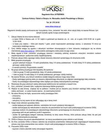 Regulamin Kina JUTRZENKA Centrum Kultury i Sztuki w Sierpcu im. Marszałka Józefa Piłsudskiego w Sierpcu Tel. 24 275 24 93 www.ckisz.sierpc.pl Regulamin określa zasady zachowania się i korzystania z kina „Jutrzenka” dla osób, które nabyły bilety na seanse filmowe i tym samym wyraziły zgodę na jego przestrzeganie. 1. Zakupu biletów do kina można dokonać: - w kasie CKiSz w Sierpcu pok. nr 16 I piętro w godzinach jej otwarcia: pn., śr., czw., pt. w godz. 8:30-14:30; wt. w godz. 12:00-18:00, - w kasie przy wejściu – która jest otwarta 1 godz. przed rozpoczęciem pierwszego seansu, a zamykana 15 minut po rozpoczęciu ostatniego seansu. 2. Ceny biletów wstępu są zgodne z aktualnym cennikiem obowiązującym w kinie Jutrzenka znajdującym się na stronie internetowej www.ckisz.sierpc.pl. Jednocześnie zastrzegamy sobie prawo do jego zmian. 3. Bilety ulgowe w kinie „Jutrzenka” przysługują: dzieciom i młodzieży szkolnej, studentom, emerytom, rencistom, osobom niepełnosprawnym, opiekunowi osoby niepełnosprawnej. 4. Podczas zakupu biletu ulgowego należy okazać stosowny dokument uprawniający do otrzymania zniżki. 5. Bilety grupowe przysługują: - grupom szkolnym liczącym: 10 osób (przedszkola, klasy I-III szkoły podstawowe); 15 osób (klasy IV-VI szkoły podstawowe, gimnazja i szkoły średnie), - w ramach promocji „Przyjacielskie czwartki”. 6. Na grupę szkolną przysługuje bilet bezpłatny dla opiekuna: - 1 bilet na grupę 10 osób (przedszkola, klasy I-III szkoła podstawowa) - 1 bilet na grupę 15 osób (klasy IV-VI szkoła podstawowa, gimnazja i szkoły średnie). 7. Na seanse filmowe, przy których określona została kategoria wiekowa mogą nabyć bilety: - Osoby spełniające granicę wieku po okazaniu odpowiedniego dokumentu ze zdjęciem zawierającego datę urodzenia. - Osoby nie posiadające odpowiedniego wieku będące pod opieką rodzica/opiekuna prawnego. 8. Rezerwacji dla grup szkolnych należy dokonywać telefonicznie lub osobiście w kasach kina. 9. Kino „Jutrzenka” prowadzi tylko i wyłącznie rezerwację biletów grupowych. 10. Wejście na salę kinową znajduje się na parterze i możliwe jest po okazaniu przy drzwiach ważnego biletu wstępu, który należy zachować - w czasie trwania seansu - do ewentualnej kontroli. 11. Na seans filmowy nie będą wpuszczone osoby posiadające bilet:: - zniszczony, - nieczytelny, - zakupiony na inny seans niż ten odbywający się w danej chwili. 12. Kasjer może odmówić sprzedaży biletu: - osobie będącej pod wpływem alkoholu, narkotyków lub innych substancji odurzających, - osobie zachowującej się niekulturalnie w stosunku do pracowników lub innych osób przebywających na terenie CKiSz, - ulgowego osobom nie posiadającym odpowiedniego dokumentu uprawniającego do otrzymania zniżki, - grupowego jeśli nie jest spełniony punkt 5 regulaminu, - osobie nie spełniającej kategorii wiekowej określonej na dany seans filmowy, która podczas zakupu biletu nie jest pod opieką rodzica/opiekuna prawnego. 13. CKiSz w Sierpcu nie ponosi odpowiedzialności za rzeczy pozostawione przez widzów w sali kinowej. 14. Do Kina Jutrzenka CKiSz w Sierpcu zabrania się wnoszenia przedmiotów niebezpiecznych zagrażających bezpieczeństwu, zdrowiu oraz życiu pracowników oraz widzów i innych osób przebywających na terenie CKiSz w Sierpcu. 15. Pracownik CKiSz może: - wyprosić z terenu placówki osoby naruszające regulamin, 16. 17. 18. 19. 20. 21. 22. 23. 24. 25. 26. 27. 28. 29. 30. - wyprosić z sali kinowej oraz budynku CKiSz osoby zachowujące się niestosownie, niekulturalnie wobec pracowników, widzów oraz innych osób przebywających na terenie CKiSz w Sierpcu. Kino nie pobiera opłaty za okulary wydawane na seanse 3D. Okulary wydawane widzom na seanse 3D są nieuszkodzone. Jeżeli klient ma zastrzeżenia co do otrzymanych okularów 3D zobowiązany jest niezwłocznie zgłosić to pracownikowi i wymienić je na nowe, nie budzące jego wątpliwości. Okulary wydane na seanse 3D muszą zostać niezwłocznie zwrócone po zakończeniu projekcji filmowej pracownikowi CKiSz w Sierpcu. W przypadku uszkodzenia okularów 3D podczas seansu widz ponosi całkowitą odpowiedzialność i koszty związane z zakupem nowej pary okularów według obowiązującego cennika. W takiej sytuacji pracownik CKiSz sporządza protokół w obecności klienta, który potwierdza własnoręcznym podpisem zgodność zamieszczonych w protokole informacji oraz przedkłada dowód tożsamości. Klient wpłaca należność do kasy CKiSz w sekretariacie w pokoju nr 16 na I Pietrze lub na konto CKiSz w Sierpcu: 40 1240 3204 1111 0010 4910 4812. W przypadku osób niepełnoletnich odpowiedzialność za uszkodzone okulary 3D ponosi rodzic/opiekun prawny. Oferty promocyjne proponowane przez kino nie łączą się ze sobą. Zakup i wymiana voucherów odbywa się zgodnie z regulaminem dostępnym na stronie internetowej CKiSz w Sierpcu. Zwrot biletu możliwy jest tylko: - w kasach kina w godzinach ich otwarcia, - po okazaniu biletu wstępu (na seans, który się jeszcze nie rozpoczął lub nie odbył) wraz z paragonem zakupu, - z przyczyn niezależnych od widza - kiedy seans się opóźni, nie odbędzie, bądź zostanie przeniesiony na inny termin, niż ten podany wcześniej. Podczas projekcji filmowych zabrania się: - Nagrywania obrazu i dźwięku (zgodnie z ustawą o prawach autorskich z dnia 4.02.1994 r.). Osoba będąca świadkiem rejestracji obrazu i dźwięku podczas seansu filmowego powinna powiadomić o tym pracownika CKiSz w Sierpcu. - Zachowania zakłócającego oglądanie filmu pozostałym użytkownikom kina. - Niszczenia wyposażenia sali kinowej. - Korzystania z telefonów komórkowych i innych urządzeń technicznych zakłócających odbywanie się seansu. - Spożywania alkoholu, narkotyków, innych substancji odurzających oraz palenia papierosów. W sali kinowej należy zajmować miejsca zgodnie z zapisem na bilecie. 