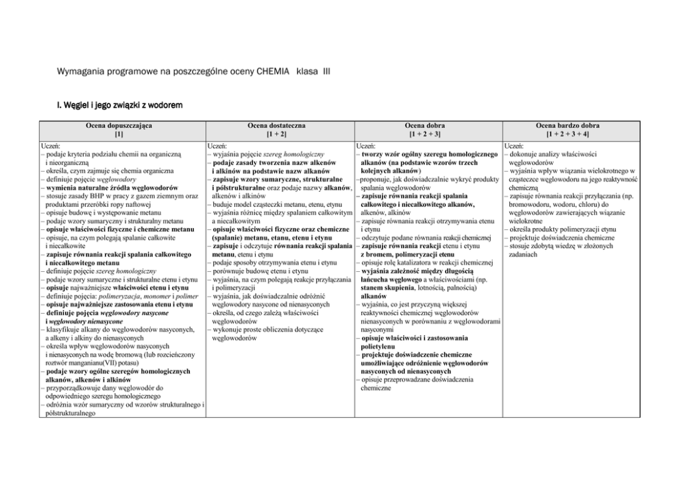 Wymagania programowe na poszczególne oceny CHEMIA klasa III I. Węgiel i jego związki z wodorem Ocena dopuszczająca [1] Uczeń: – podaje kryteria podziału chemii na organiczną i nieorganiczną – określa, czym zajmuje się chemia organiczna – definiuje pojęcie węglowodory – wymienia naturalne źródła węglowodorów – stosuje zasady BHP w pracy z gazem ziemnym oraz produktami przeróbki ropy naftowej – opisuje budowę i występowanie metanu – podaje wzory sumaryczny i strukturalny metanu – opisuje właściwości fizyczne i chemiczne metanu – opisuje, na czym polegają spalanie całkowite i niecałkowite – zapisuje równania reakcji spalania całkowitego i niecałkowitego metanu – definiuje pojęcie szereg homologiczny – podaje wzory sumaryczne i strukturalne etenu i etynu – opisuje najważniejsze właściwości etenu i etynu – definiuje pojęcia: polimeryzacja, monomer i polimer – opisuje najważniejsze zastosowania etenu i etynu – definiuje pojęcia węglowodory nasycone i węglowodory nienasycone – klasyfikuje alkany do węglowodorów nasyconych, a alkeny i alkiny do nienasyconych – określa wpływ węglowodorów nasyconych i nienasyconych na wodę bromową (lub rozcieńczony roztwór manganianu(VII) potasu) – podaje wzory ogólne szeregów homologicznych alkanów, alkenów i alkinów – przyporządkowuje dany węglowodór do odpowiedniego szeregu homologicznego – odróżnia wzór sumaryczny od wzorów strukturalnego i półstrukturalnego Ocena dostateczna [1 + 2] Uczeń: – wyjaśnia pojęcie szereg homologiczny – podaje zasady tworzenia nazw alkenów i alkinów na podstawie nazw alkanów – zapisuje wzory sumaryczne, strukturalne i półstrukturalne oraz podaje nazwy alkanów, alkenów i alkinów – buduje model cząsteczki metanu, etenu, etynu – wyjaśnia różnicę między spalaniem całkowitym a niecałkowitym – opisuje właściwości fizyczne oraz chemiczne (spalanie) metanu, etanu, etenu i etynu – zapisuje i odczytuje równania reakcji spalania metanu, etenu i etynu – podaje sposoby otrzymywania etenu i etynu – porównuje budowę etenu i etynu – wyjaśnia, na czym polegają reakcje przyłączania i polimeryzacji – wyjaśnia, jak doświadczalnie odróżnić węglowodory nasycone od nienasyconych – określa, od czego zależą właściwości węglowodorów – wykonuje proste obliczenia dotyczące węglowodorów Ocena dobra [1 + 2 + 3] Uczeń: – tworzy wzór ogólny szeregu homologicznego alkanów (na podstawie wzorów trzech kolejnych alkanów) –proponuje, jak doświadczalnie wykryć produkty spalania węglowodorów – zapisuje równania reakcji spalania całkowitego i niecałkowitego alkanów, alkenów, alkinów – zapisuje równania reakcji otrzymywania etenu i etynu – odczytuje podane równania reakcji chemicznej – zapisuje równania reakcji etenu i etynu z bromem, polimeryzacji etenu – opisuje rolę katalizatora w reakcji chemicznej – wyjaśnia zależność między długością łańcucha węglowego a właściwościami (np. stanem skupienia, lotnością, palnością) alkanów – wyjaśnia, co jest przyczyną większej reaktywności chemicznej węglowodorów nienasyconych w porównaniu z węglowodorami nasyconymi – opisuje właściwości i zastosowania polietylenu – projektuje doświadczenie chemiczne umożliwiające odróżnienie węglowodorów nasyconych od nienasyconych – opisuje przeprowadzane doświadczenia chemiczne Ocena bardzo dobra [1 + 2 + 3 + 4] Uczeń: – dokonuje analizy właściwości węglowodorów – wyjaśnia wpływ wiązania wielokrotnego w cząsteczce węglowodoru na jego reaktywność chemiczną – zapisuje równania reakcji przyłączania (np. bromowodoru, wodoru, chloru) do węglowodorów zawierających wiązanie wielokrotne – określa produkty polimeryzacji etynu – projektuje doświadczenia chemiczne – stosuje zdobytą wiedzę w złożonych zadaniach – zapisuje wzory sumaryczne i nazwy alkanu, alkenu i alkinu o podanej liczbie atomów węgla (do pięciu atomów węgla w cząsteczce) – zapisuje wzory strukturalne i półstrukturalne (proste przykłady) węglowodorów II. Pochodne węglowodorów Ocena dopuszczająca [1] Uczeń: – dowodzi, że alkohole, kwasy karboksylowe, estry, aminy, aminokwasy są pochodnymi węglowodorów – opisuje budowę pochodnych węglowodorów (grupa węglowodorowa + grupa funkcyjna) – wymienia pierwiastki chemiczne wchodzące w skład pochodnych węglowodorów – klasyfikuje daną substancję organiczną do odpowiedniej grupy związków chemicznych – określa, co to jest grupa funkcyjna – zaznacza grupy funkcyjne w alkoholach, kwasach karboksylowych, estrach, aminach i aminokwasach i podaje ich nazwy – zapisuje wzory ogólne alkoholi, kwasów karboksylowych i estrów – zapisuje wzory sumaryczne i strukturalne prostych alkoholi monohydroksylowych i kwasów karboksylowych (do 2 atomów węgla w cząsteczce) oraz tworzy ich nazwy – zaznacza we wzorze kwasu karboksylowego resztę kwasową – określa, co to są nazwy zwyczajowe i systematyczne – wymienia reguły tworzenia nazw systematycznych związków organicznych – podaje nazwy zwyczajowe omawianych kwasów karboksylowych (mrówkowy, octowy) – opisuje najważniejsze właściwości metanolu, etanolu, glicerolu oraz kwasów etanowego i metanowego – zapisuje równanie reakcji spalania metanolu – opisuje podstawowe zastosowania etanolu i kwasu Ocena dostateczna [1 + 2] Uczeń: – zapisuje nazwy i wzory omawianych grup funkcyjnych – zapisuje wzory i wymienia nazwy alkoholi – zapisuje wzory sumaryczny i strukturalny glicerolu – uzasadnia stwierdzenie, że alkohole i kwasy karboksylowe tworzą szeregi homologiczne – podaje odczyn roztworu alkoholu – opisuje fermentację alkoholową – zapisuje równania reakcji spalania etanolu – podaje przykłady kwasów organicznych występujących w przyrodzie i wymienia ich zastosowania – tworzy nazwy pros