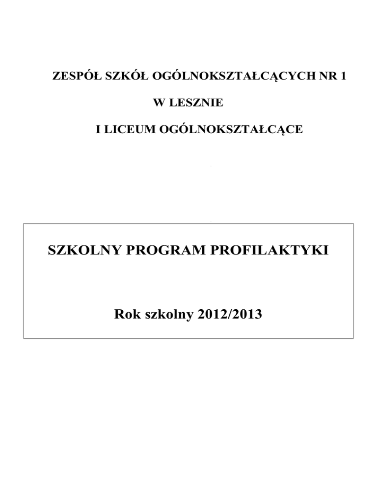 ZESPÓŁ SZKÓŁ OGÓLNOKSZTAŁCĄCYCH NR 1 W LESZNIE I LICEUM OGÓLNOKSZTAŁCĄCE SZKOLNY PROGRAM PROFILAKTYKI Rok szkolny 2012/2013 PRAWNE ASPEKTY TWORZENIA PROGRAMU PROFILAKTYKI SZKOŁY 1. Zgodność z artykułami KONSTYTUCJI RZECZYPOSPOLITEJ POLSKIEJ. 2. Uwzględnianie KONWENCJI PRAW DZIECKA. 3. Ustawy i rozporządzenia: Ustawa o systemie oświaty z dnia 7 września 1991 r. z późniejszymi zmianami (tekst jednolity Dz. U. z 2004 r., Nr 256 poz. 2572). Rozporządzenie Ministra Edukacji Narodowej i Sportu z dnia 31 stycznia 2002r. zmieniające rozporządzenie w sprawie ramowych statutów publicznego przedszkola oraz publicznych szkół (Dz. U. z 2002 r. Nr 10, poz. 96). Rozporządzenie Ministra Edukacji Narodowej z dnia 23 grudnia 2008r. w sprawie podstawy programowej wychowania przedszkolnego oraz kształcenia ogólnego w poszczególnych typach szkół (Dz. U. z 2009r. Nr 4, poz. 17). 4. STATUT SZKOŁY, jej MISJA I WIZJA. I. Cele ogólne programu profilaktyki Zapobieganie i przeciwdziałanie zjawiskom patologii społecznej wśród młodzieży, a w szczególności zachowaniom problemowym takim jak: - używanie substancji psychoaktywnych (papierosy, alkohol, narkotyki, dopalacze), - zachowania agresywne, przemoc, - udział w negatywnych grupach nieformalnych (przestępczość, sekty), - przedwczesna inicjacja seksualna (zagrożenie zakażeniem HIV, HPV), - zaburzenia emocjonalne (stres, depresje), - wagary, ucieczki. Cel nadrzędny będzie realizowany przez cele operacyjne: - dostarczanie elementarnej wiedzy na temat możliwych zagrożeń, - kształtowanie postaw sprzyjających podejmowaniu racjonalnych decyzji, - wyuczenie praktycznych umiejętności życiowych. Określone cele zostaną osiągnięte przez działania informacyjne, edukacyjne, alternatywne, interwencyjne. W szkole jest stosowana profilaktyka pierwszorzędowa i drugorzędowa. Profilaktyka pierwszorzędowa skierowana jest do grup niskiego ryzyka. Działaniami obejmuje się szerokie, nie zdiagnozowane populacje. Profilaktyka pierwszorzędowa ma dwa cele – promocję zdrowego stylu życia oraz opóźnienie wieku inicjacji. Profilaktyka drugorzędowa adresowana jest do grup podwyższonego ryzyka. Celem działań jest ograniczenie głębokości i czasu trwania dysfunkcji, umożliwienie wycofania się z zachowań ryzykowanych (np. poradnictwo rodzinne i indywidualne, socjoterapia). 2 Profilaktykę pierwszo i drugorzędową realizuje cała społeczność szkolna. Realizatorami działań w profilaktyce pierwszorzędowej są przede wszystkim nauczyciele wspierani przez psychologów, pedagogów i innych specjalistów, a terenem działań jest głównie szkoła. W profilaktyce drugorzędowej realizatorami są głównie specjaliści: psychologowie, pedagodzy, socjoterapeuci, trenerzy. II. Współrealizatorzy programu Zadania skierowane do współrealizatorów programu: 1. Nauczyciele: - dokształcanie w zakresie problematyki profilaktycznej (wiedza na temat uwarunkowań zjawisk problemowych, wzbogacanie warsztatu w zakresie form i metod pracy), diagnozowanie problemów, opracowywanie i stosowanie konkretnych działań z uwzględnieniem potrzeb i wieku uczniów (wychowawcy i przedmiotowcy), konstruktywne komunikowanie się z uczniami i rodzicami, stosowanie technik obniżających poziom emocji (np. relaksacyjnych – eliminowanie stresu), tworzenie atmosfery dającej poczucie bezpieczeństwa. 2. Rodzice: - informacje o zagrożeniach i zachowaniach problemowych, promowanie skutecznego wychowania opartego na czytelnym systemie wartości, prawidłowe funkcjonowanie rodziny, umiejętności kontaktów z dziećmi, właściwe reagowanie na symptomy zagrożeń, tworzenie grup wsparcia dla rodziny. 3. Uczniowie: - informacje o zagrożeniach społecznych, kształtowanie postaw prozdrowotnych i właściwych przekonań normatywnych, rozwijanie umiejętności życiowych: samokontroli, radzenia sobie ze stresem, rozwiązywania konfliktów, współpracy w grupie, pomagania innym, tolerancji, empatii, asertywności, przewidywania konsekwencji swoich zachowań. 3 Realizacja zadań ukierunkowana jest na: 1. Wzmacnianie czynników chroniących przed zachowaniami problemowymi przez: - budowanie pozytywnych więzi ze szkołą i innymi instytucjami poprzez czynne uczestnictwo w ich funkcjonowaniu, - włączanie rodziców do aktywnego udziału w programie profilaktyki, - edukację normatywną (wzmacnianie norm i wartości przeciwnych zachowaniom problemowym). 2. Redukowanie czynników ryzyka zachowań problemowych przez: - wyrównywanie szans (działania korekcyjne przy niepowodzeniach szkolnych), - wskazywanie alternatywnych zajęć i grup rówieśniczych pozytywnej aktywności, - działania interwencyjne (szkoła, dom, specjaliści). III. Działania wspomagające program profilaktyki Współpraca z instytucjami środowiskowymi: Poradnia Psychologiczno – Pedagogiczna, Młodzieżowe Centrum Profilaktyki „Alternatywa”, „Monar”, Oddział Oświaty Zdrowotnej PSSE w Lesznie i szkolna służba zdrowia, Biuro ds. Uzależnień UM Leszna, Policja, Miejski Ośrodek Pomocy Rodzinie itp. IV. Działania profilaktyczne w wybranych obszarach zagrożeń 1. Dbałość o bezpieczeństwo fizyczne i psychiczne uczniów w szkole. Cel główny: Utrwalenie umiejętności samokontroli zachowań oraz radzenia sobie z własnymi emocjami. Zadania Profilaktyka pierwszorzędowa zapobieganie zachowaniom agresywnym, przemocowym i wulgaryzacji języka; Sposoby realizacji zapewnienie uczniom bezpieczeństwa poprzez pełnienie dyżurów przez nauczycieli; monitoring wizyjny, obserwacja zachowań uczniów; rozmowy indywidualne; kształtowanie postawy szacunku i tolerancji wobec rówieśników i dorosłych; ankiety; pogadanki; kształtowanie postawy dbałości o wspólne mienie; lekcje wychowawcze; przeciwdziałanie ujemnym spotkania z przedstawicielami propagowanie zasad kulturalnego zachowania zarówno w szkole, jak i poza nią; 4 Odpowiedzialni wszyscy pracownicy szkoły; wpł