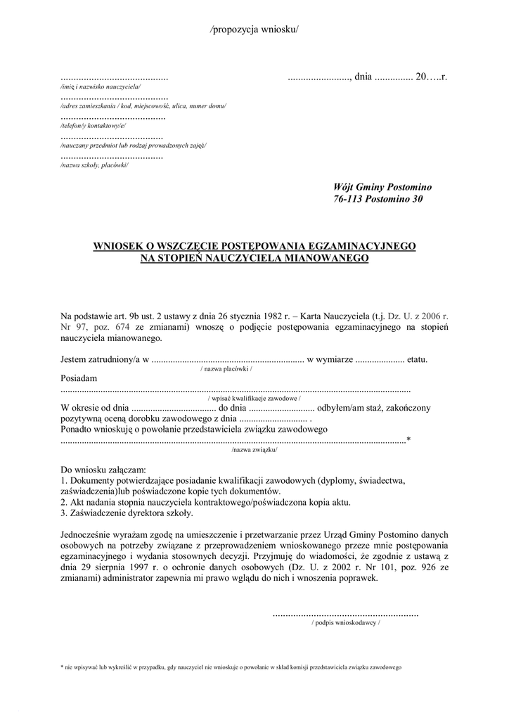 /propozycja wniosku/ .......................................... ........................, dnia ............... 20…..r. /imię i nazwisko nauczyciela/ .......................................... /adres zamieszkania / kod, miejscowość, ulica, numer domu/ ......................................... /telefon/y kontaktowy/e/ ........................................ /nauczany przedmiot lub rodzaj prowadzonych zajęć/ ........................................ /nazwa szkoły, placówki/ Wójt Gminy Postomino 76-113 Postomino 30 WNIOSEK O WSZCZĘCIE POSTĘPOWANIA EGZAMINACYJNEGO NA STOPIEŃ NAUCZYCIELA MIANOWANEGO Na podstawie art. 9b ust. 2 ustawy z dnia 26 stycznia 1982 r. – Karta Nauczyciela (t.j. Dz. U. z 2006 r. Nr 97, poz. 674 ze zmianami) wnoszę o podjęcie postępowania egzaminacyjnego na stopień nauczyciela mianowanego. Jestem zatrudniony/a w ................................................................. w wymiarze ..................... etatu. / nazwa placówki / Posiadam ..................................................................................................................................................... / wpisać kwalifikacje zawodowe / W okresie od dnia .................................... do dnia ............................ odbyłem/am staż, zakończony pozytywną oceną dorobku zawodowego z dnia ............................. . Ponadto wnioskuję o powołanie przedstawiciela związku zawodowego ...................................................................................................................................................* /nazwa związku/ Do wniosku załączam: 1. Dokumenty potwierdzające posiadanie kwalifikacji zawodowych (dyplomy, świadectwa, zaświadczenia)lub poświadczone kopie tych dokumentów. 2. Akt nadania stopnia nauczyciela kontraktowego/poświadczona kopia aktu. 3. Zaświadczenie dyrektora szkoły. Jednocześnie wyrażam zgodę na umieszczenie i przetwarzanie przez Urząd Gminy Postomino danych osobowych na potrzeby związane z przeprowadzeniem wnioskowanego przeze mnie postępowania egzaminacyjnego i wydania stosownych decyzji. Przyjmuję do wiadomości, że zgodnie z ustawą z dnia 29 sierpnia 1997 r. o ochronie danych osobowych (Dz. U. z 2002 r. Nr 101, poz. 926 ze zmianami) administrator zapewnia mi prawo wglądu do nich i wnoszenia poprawek. ......................................................... / podpis wnioskodawcy / * nie wpisywać lub wykreślić w przypadku, gdy nauczyciel nie wnioskuje o powołanie w skład komisji przedstawiciela związku zawodowego