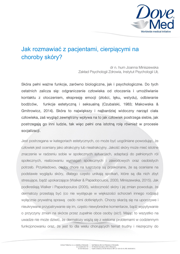 Jak rozmawiać z pacjentami, cierpiącymi na choroby skóry? dr n. hum Joanna Miniszewska Zakład Psychologii Zdrowia, Instytut Psychologii UŁ Skóra pełni ważne funkcje, zarówno biologiczne, jak i psychologiczne. Do tych ostatnich zalicza się: odgraniczenie człowieka od otoczenia i umożliwianie kontaktu z otoczeniem, ekspresję emocji (złości, lęku, wstydu), odbieranie bodźców, funkcje estetyczną i seksualną (Czubalski, 1983; Makowska & Gmitrowicz, 2014). Skóra to największy i najbardziej widoczny narząd ciała człowieka, zaś wygląd zewnętrzny wpływa na to jak człowiek postrzega siebie, jak postrzegają go inni ludzie, tak więc pełni ona istotną rolę również w procesie socjalizacji. Jest postrzegana w kategoriach estetycznych, co może być uogólniane powodując, że człowiek jest oceniany jako atrakcyjny lub nieatrakcyjny. Jakość skóry może mieć istotne znaczenie w radzeniu sobie w społecznych sytuacjach, adaptacji do pełnionych ról społecznych, realizowaniu wymagań społecznych i zawodowych oraz osobistych potrzeb. Przykładowo, osoby chore na łuszczycę są przekonane, że są oceniane na podstawie wyglądu skóry, dlatego często unikają spotkań, które są dla nich zbyt stresujące, bądź upokarzające (Walker & Papadopoulos, 2005; Miniszewska, 2015). Jak podkreślają Walker i Papadopoulos (2005), widoczność skóry i jej zmian powoduje, że dermatozy przestają być (co nie występuje w większości schorzeń innego rodzaju) wyłącznie prywatną sprawą osób nimi dotkniętych. Chorzy skarżą się na uporczywe i nieukrywane przypatrywanie się im, często niewybredne komentarze, bądź wypytywanie o przyczyny zmian na skórze przez zupełnie obce osoby (sic!). Mając to wszystko na uwadze nie może dziwić, że dermatozy wiążą się z wieloma problemami w codziennym funkcjonowaniu oraz, że jest to dla wielu chorujących temat trudny i niezręczny do rozmowy. Specjaliści pracujący z chorymi dermatologicznie znają zapewne niejeden przypadek osoby ukrywającej latami (skutecznie!) zmiany łuszczycowe przed rodziną, wychodzącej z domu do sklepu na tyle wcześnie rano, żeby nikogo nie spotkać, a później dopiero po zmroku, chodzącej w upalne lato w zakrywających całe ciało ubraniach. Okazuje się również, że sam kontakt z lekarzem dermatologiem może być dla wielu osób z dermatozami dużym wyzwaniem. Z jednej strony osoba chora poszukuje pomocy i kogoś, kto zrozumie problemy wynikające z choroby, z drugiej strony wstydzi się o nich mówić, w przekonaniu, że są przecież osoby cierpiące na „poważniejsze” choroby i lepiej funkcjonujące. Do tego może dochodzić obwinianie siebie o słabość i nie radzenie sobie „tylko” z własnym wyglądem. Taka postawa, utrzymująca się przez dłuższy czas, może doprowadzić do znacznego pogorszenia samopoczucia, a nawet zaburzeń typu depresyjnego. Paradoksalnie, specjalista zajmujący się swoim pacjentem, może, w dobrej wierze, pogorszyć sytuację poprzez zbyt entuzjastyczne pocieszanie chorego. Naturalnym odruchem, w obliczu różnych trudności, jest pocieszanie typu „nie jest tak źle, inni mają gorzej, tego wcale tak bardzo nie widać”. Jeżeli osoba chora, przestraszona swoim stanem, niepotrafiąca sobie poradzić, usłyszy taki komunikat na samym początku kontaktu to będzie on dla niej informacją, że przesadza wyolbrzymiając problem i nie powinna się więcej skarżyć. W efekcie będzie się jeszcze bardziej obwiniać. Możliwe jest też, że poczuje się niezrozumiana i uzna, że jej problem został zbagatelizowany przez lekarza. W obydwu przypadkach wsparcia nie uzyska. Co więc zrobić? Nie starać się podnieść na duchu? Starać, ale trochę później. Najpierw warto wysłuchać ze zrozumieniem i empatią oraz pokazać akceptację dla lęków i wątpliwości. Nawet, jeżeli z perspektywy lekarza są one bezpodstawne. Chory tego nie wie, a to co czuje jest prawdziwe i jest faktem. Dopiero po okazaniu zrozumienia, dopytania CZEGO chory się najbardziej obawia, CZEGO nie rozumie i CZEGO chciałby się dowiedzieć o swoim stanie, można zacząć pokazywać bardziej optymistyczne aspekty jego stanu zdrowia (w tym zaakcentowanie gotowości do niesienia mu pomocy medycznej i różnych możliwości terapii). Już pionier badań nad optymizmem, Martin Seligman (1991), pisał, że w przypadku udzielania wsparcia osobie w trudnej sytuacji należy z optymizmem poczekać. W przeciwnym razie poczuje się ona niezrozumiana i odrzucona. Innymi słowy, najpierw wysłuchanie i okazanie zrozumienia – potem optymizm. Chcąc, z jednej strony, wzbudzić zaufanie i dać poczucie bezpieczeństwa, z drugiej strony dowiedzieć się jak najwięcej o stanie zdrowia pacjenta, warto pytać również o psychospołeczne aspekty choroby. Uzyskane w ten sposób informacje mogą dać szerszy obraz problemu, pozwalający ustalić jaka jest wiedza i przekonania chorego na temat własnego stanu zdrowia, jak duża jest komponenta psychologiczna w obrazie choroby oraz jaka jest motywacja do leczenia. Jest to szczególnie istotne w sytuacji, w której istnieją przesłanki, że czynniki psychiczne mogą odgrywać znaczącą rolę w etiopatogenezie choroby. Pomocne mogą być następujące pytania (zaczerpnięte z pozycji L. Papadopoulos i R. Bor pod tytułem „Psychological approaches to dermatology”): 1. Kiedy pojawił się problem i co, zdaniem pacjenta, go mogło wywołać? 2. Co, jego zdaniem, mogą oznaczać symptomy chorobowe? 3. Co chory robił do tej pory, żeby sobie z symptomami poradzić? Z jakim efektem?11 4. Kto jeszcze wie o problemie? Co o tym ta osoba/osoby sądzi/sądzą? 5. Czy chory miał jakieś medyczne problemy w przeszłości? Jak tak to jak one na niego wpłynęły? 6. Co się zadziało/zmieniło w różnych obszarach życia pacjenta od momentu pojawienia się symptomów (w relacji z bliskimi, w pracy)? 7. Czy stan zdrowia bardzo obciąża pacjenta 