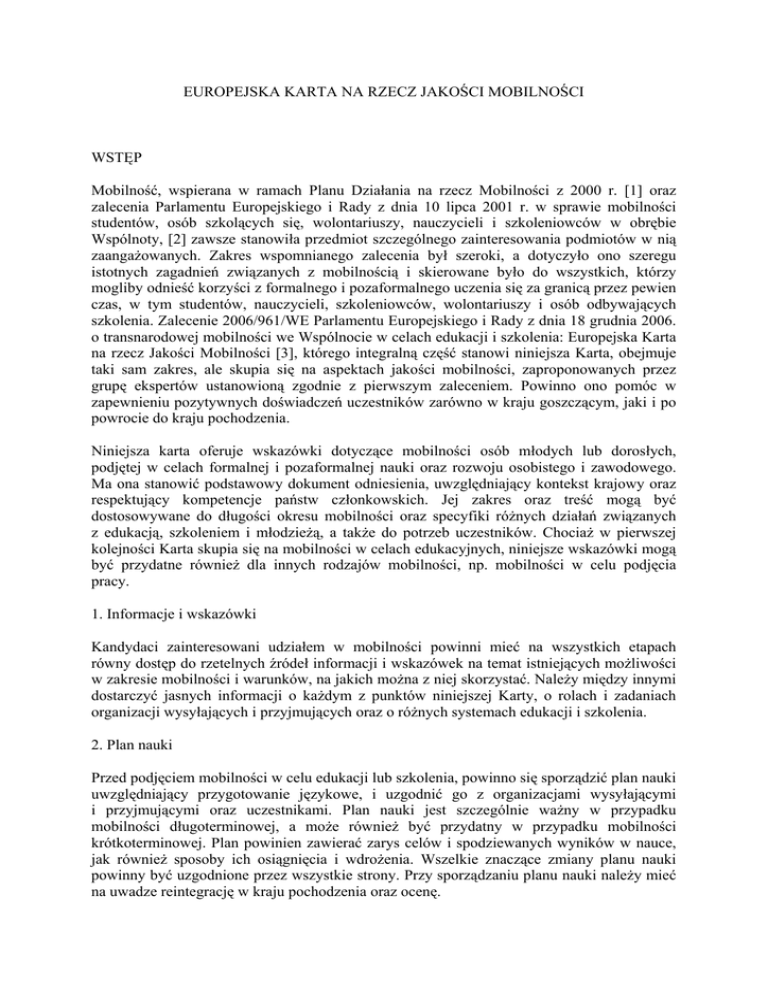 EUROPEJSKA KARTA NA RZECZ JAKOŚCI MOBILNOŚCI WSTĘP Mobilność, wspierana w ramach Planu Działania na rzecz Mobilności z 2000 r. [1] oraz zalecenia Parlamentu Europejskiego i Rady z dnia 10 lipca 2001 r. w sprawie mobilności studentów, osób szkolących się, wolontariuszy, nauczycieli i szkoleniowców w obrębie Wspólnoty, [2] zawsze stanowiła przedmiot szczególnego zainteresowania podmiotów w nią zaangażowanych. Zakres wspomnianego zalecenia był szeroki, a dotyczyło ono szeregu istotnych zagadnień związanych z mobilnością i skierowane było do wszystkich, którzy mogliby odnieść korzyści z formalnego i pozaformalnego uczenia się za granicą przez pewien czas, w tym studentów, nauczycieli, szkoleniowców, wolontariuszy i osób odbywających szkolenia. Zalecenie 2006/961/WE Parlamentu Europejskiego i Rady z dnia 18 grudnia 2006. o transnarodowej mobilności we Wspólnocie w celach edukacji i szkolenia: Europejska Karta na rzecz Jakości Mobilności [3], którego integralną część stanowi niniejsza Karta, obejmuje taki sam zakres, ale skupia się na aspektach jakości mobilności, zaproponowanych przez grupę ekspertów ustanowioną zgodnie z pierwszym zaleceniem. Powinno ono pomóc w zapewnieniu pozytywnych doświadczeń uczestników zarówno w kraju goszczącym, jaki i po powrocie do kraju pochodzenia. Niniejsza karta oferuje wskazówki dotyczące mobilności osób młodych lub dorosłych, podjętej w celach formalnej i pozaformalnej nauki oraz rozwoju osobistego i zawodowego. Ma ona stanowić podstawowy dokument odniesienia, uwzględniający kontekst krajowy oraz respektujący kompetencje państw członkowskich. Jej zakres oraz treść mogą być dostosowywane do długości okresu mobilności oraz specyfiki różnych działań związanych z edukacją, szkoleniem i młodzieżą, a także do potrzeb uczestników. Chociaż w pierwszej kolejności Karta skupia się na mobilności w celach edukacyjnych, niniejsze wskazówki mogą być przydatne również dla innych rodzajów mobilności, np. mobilności w celu podjęcia pracy. 1. Informacje i wskazówki Kandydaci zainteresowani udziałem w mobilności powinni mieć na wszystkich etapach równy dostęp do rzetelnych źródeł informacji i wskazówek na temat istniejących możliwości w zakresie mobilności i warunków, na jakich można z niej skorzystać. Należy między innymi dostarczyć jasnych informacji o każdym z punktów niniejszej Karty, o rolach i zadaniach organizacji wysyłających i przyjmujących oraz o różnych systemach edukacji i szkolenia. 2. Plan nauki Przed podjęciem mobilności w celu edukacji lub szkolenia, powinno się sporządzić plan nauki uwzględniający przygotowanie językowe, i uzgodnić go z organizacjami wysyłającymi i przyjmującymi oraz uczestnikami. Plan nauki jest szczególnie ważny w przypadku mobilności długoterminowej, a może również być przydatny w przypadku mobilności krótkoterminowej. Plan powinien zawierać zarys celów i spodziewanych wyników w nauce, jak również sposoby ich osiągnięcia i wdrożenia. Wszelkie znaczące zmiany planu nauki powinny być uzgodnione przez wszystkie strony. Przy sporządzaniu planu nauki należy mieć na uwadze reintegrację w kraju pochodzenia oraz ocenę. 3. Personalizacja Mobilność w celu edukacji lub szkolenia powinna w jak największym możliwym stopniu być zgodna z osobistym tokiem nauki, kwalifikacjami i motywacją uczestników, a także powinna je rozwijać lub uzupełniać. 4. Przygotowanie ogólne Przygotowanie uczestników przed wyjazdem jest wskazane i powinno być dostosowane do ich indywidualnych potrzeb. W zależności od potrzeb powinno obejmować aspekty językowe, pedagogiczne, administracyjne, prawne, osobiste oraz kulturowe, a także informacje na temat aspektów finansowych. 5. Aspekty językowe Znajomość języków jest ważna dla efektywnego uczenia się, komunikacji międzykulturowej i lepszego zrozumienia kultury kraju goszczącego. Uczestnicy, a także organizacje wysyłające i goszczące powinny kłaść szczególny nacisk na odpowiednie przygotowanie językowe. W miarę możności powinno ono obejmować: - dokonanie oceny znajomości języka przed wyjazdem i zapewnienie możliwości uczestnictwa w kursach nauki języka kraju goszczącego lub języka wykładowego, gdy są to różne języki; - w kraju goszczącym, udzielanie wsparcia i porad językowych. 6. Wsparcie logistyczne Tam, gdzie to niezbędne, uczestnikom należy zapewnić stosowne wsparcie logistyczne. Obejmować może ono informację i pomoc w kwestiach związanych z podróżą, ubezpieczeniem, pozwoleniem na pobyt i pracę, zabezpieczeniem socjalnym, możliwością przesyłania stypendiów i pożyczek rządowych z kraju pochodzenia do kraju goszczącego, zakwaterowaniem i wszelkimi innymi aspektami praktycznymi, w tym bezpieczeństwa w czasie pobytu, tam gdzie to właściwe. 7. Mentorat Podmiot goszczący (placówka edukacyjna, organizacja młodzieżowa, przedsiębiorstwo itd.) powinien dysponować możliwościami zwrócenia się do mentora doradzającego uczestnikom i pomagającego im w efektywnej integracji z otoczeniem w kraju goszczącym i pełnić rolę punktu kontaktowego w celu uzyskania bieżącej pomocy. 8. Uznawanie Jeśli okres studiów lub stażu za granicą ma miejsce w trakcie regularnego programu studiów lub kształcenia, fakt ten trzeba odnotować w planie nauki, natomiast uczestnikom należy udzielić pomocy, aby ułatwić im uzyskanie uznawania i poświadczenia, tam gdzie to właściwe. W planie nauki, organizacja wysyłająca powinna zobowiązać się do uznania pomyślnie zakończonego okresu mobilności. Jeśli chodzi o inne rodzaje mobilności, szczególnie dotyczące pozaformalnej edukacji i szkolenia, należy wystawić stosowny dokument, który umożliwi uczestnikowi potwierdzenie w sposób zadowalający i wiarygodny aktywnego uczestnictwa i wyników w nauce. W tym kontekście należy zachęcać do stosowa