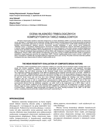 KOMPOZYTY (COMPOSITES) 2(2002)4 Andrzej Wojciechowski1, Krystyna Pietrzak4 Instytut Transportu Samochodowego, ul. Jagiellońska 80, 03-301 Warszawa Jerzy Sobczak2 Instytut Odlewnictwa, ul. Zakopiańska 73, 30-418 Kraków Zbigniew Bojar3 Wojskowa Akademia Techniczna, ul. Kaliskiego 2, 00-908 Warszawa OCENA WŁASNOŚCI TRIBOLOGICZNYCH KOMPOZYTOWYCH TARCZ HAMULCOWYCH Zbrojone dyspersyjnie metalowe materiały kompozytowe na bazie aluminium (AlMC) są używane głównie na skojarzenia cierne, pracujące w warunkach tarcia technicznie suchego. Różnorodność metodyk badawczych i brak powszechnie przyjętych standardów wyznaczania odporności na ścieranie spowodowały, że w pracy przedstawiono wyniki badań tribologicznych, najbardziej odwzorowujących, zdaniem autorów, rzeczywiste zjawiska zachodzące w parze ciernej tarcza hamulcowa-okładzina cierna w warunkach eksploatacyjnych. Porównawcze badania tribologiczne różnych materiałów kompozytowych o osnowie stopów aluminium, które mogłyby być zastosowane na tarcze hamulcowe, oraz żeliwa szarego z grafitem płatkowym oceniano przez określenie wskaźników zużycia tribologicznego, tj. współczynnika tarcia i stopnia zużycia. Uzyskane wyniki wskazują, że w danych warunkach eksperymentalnych zarówno żeliwo, jak i kompozyty cechują się zbliżoną odpornością na zużycie tribologiczne. Zużycie AlMC zależy głównie od temperatury pracy pary ciernej. Z badań jednoznacznie wynika, że kompozyty aluminiowe mogą bezpiecznie pracować do temperatury 300oC. Wartość współczynnika tarcia w parze ciernej z AlMC jest w miarę równomierna i stabilna dla wszystkich badanych temperatur pracy pary ciernej. Wszystkie testowane materiały spełniały wymagania dotyczące dopuszczalnych wielkości współczynnika tarcia. THE WEAR RESISTIVITY EVALUATION OF COMPOSITE BREAK ROTORS Particulates reinforced aluminum matrix composites (AIMCs) are generally used on frictional couples working under technically dry friction conditions. Variety of research methodology and lack of commonly used standards concerning estimation of wear resistance contributed to the fact that this paper presents two techniques of tribology testing, according to the authors, the real effects occurring in the frictional couple: break rotor-friction lining in service conditions. The comparative tribology investigations of the different aluminum based composite materials (such as F3S.20S - AlSi9Mr/22 vol.% SiC, F3N.20S - AlSi10FeMnMg/22 vol.% SiC and AlSi12CuNiMg/9 vol.% fly ash precipitator obtained by gravity casting in permanent mold (GR), lost foam method (LF) and squeeze cast (SQ), in as cast and heat treated conditions), which could be used for break rotors and cast iron, have been estimated through defining the tribology wear indexes (friction coefficient and wear resistance) in two independent tests. The obtained findings show that in the given experimental conditions both the irons as well as composites are characterized by similar wear resistance (Tables 1 and 2). The wear of AIMCs depends mostly on the temperature of the active frictional couple. Furthermore, as a result of the research it can be synonymously inferred that the aluminum composites can safely work in the temperature up to 300oC (Figs 3 and 4). The value of the friction coefficient in the frictional couple is equal and stable for all temperatures at which the active friction couple has been examined. All tested materials have fulfilled the requirements concerning the acceptable quantities of friction factor. Additionaly, initial fractography investigation were done, showing formation of the „film” on the tribosurface, containing elements preferably coming from the pad’s material (Fig. 5). WPROWADZENIE Metalowe materiały kompozytowe na bazie stopów metali lekkich stanowią obecnie jedną z najbardziej obiecujących i rozwijających się grup materiałów konstrukcyjnych. Podstawową korzyścią płynącą z zastosowania ich jako materiałów nowej generacji może być znaczne obniżenie masy konstrukcji, przy jednoczesnym zachowaniu wymaganych właściwości mechanicznych i bezpieczeństwa eksploatacji. Dobre właściwości materiałów kompozytowych w konsekwencji umożliwiają optymalizację konstrukcji projektowanych części, czyli 1 dr inż., 2 dr hab. inż., 3 dr hab. inż., 4 dr inż. dalszą poprawę niezawodności i cech użytkowych wyrobu finalnego. Obecny rozwój konstrukcji układów hamulcowych charakteryzuje się poszukiwaniem możliwości szybkiego odprowadzania znacznych ilości ciepła, powstającego podczas pracy skojarzenia ciernego oraz zmniejszenia zmian wartości współczynnika tarcia pomiędzy współpracującymi elementami ciernymi w zmiennych warunkach pracy. 224 A. Wojciechowski, J. Sobczak, Z. Bojar, K. Pietrzak Tarcze hamulcowe są najbardziej obciążonymi elementami układu hamulcowego. Ich jakość i konstrukcja decydują zatem w sposób zasadniczy o skuteczności działania hamulców. Niezależnie od typu skojarzenia, wszystkie materiały stosowane na elementy cierne układów hamulcowych powinny charakteryzować się: a) odpowiednio wysoką wartością współczynnika tarcia µ oraz dużą jego stabilnością i małą czułością na zmianę: prędkości poślizgu, nacisków jednostkowych, liczby dokonanych zahamowań, czasu pracy, stopnia zwilżenia wodą i stopnia zanieczyszczeń, np. piaskiem (w praktyce zaleca się µ = = 0,3÷0,4), b) dużą odpornością na zużycie w przewidywanych warunkach eksploatacyjnych pracy, c) dużą stabilnością właściwości w wysokiej temperaturze i odpornością na szoki cieplne oraz dobrym przewodnictwem cieplnym, d) wystarczającą wytrzymałością mechaniczną, e) małą skłonnością do zacierania powierzchni ślizgowych oraz łatwością docierania się, f) małą higroskopijnością i zwilżalnością, g) technologicznością i łatwością wykonania. Do najbardziej perspektywicznych materiałów kompozyt