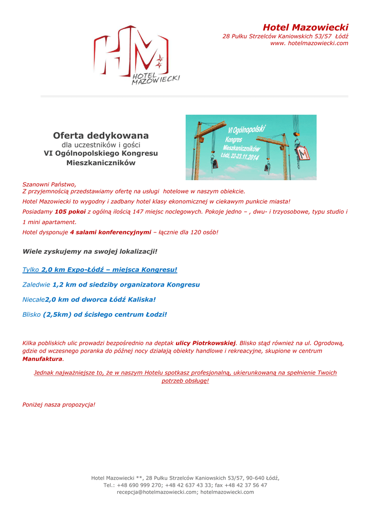 Hotel Mazowiecki 28 Pułku Strzelców Kaniowskich 53/57 Łódź www. hotelmazowiecki.com Oferta dedykowana dla uczestników i gości VI Ogólnopolskiego Kongresu Mieszkaniczników Szanowni Państwo, Z przyjemnością przedstawiamy ofertę na usługi hotelowe w naszym obiekcie. Hotel Mazowiecki to wygodny i zadbany hotel klasy ekonomicznej w ciekawym punkcie miasta! Posiadamy 105 pokoi z ogólną ilością 147 miejsc noclegowych. Pokoje jedno – , dwu- i trzyosobowe, typu studio i 1 mini apartament. Hotel dysponuje 4 salami konferencyjnymi – łącznie dla 120 osób! Wiele zyskujemy na swojej lokalizacji! Tylko 2,0 km Expo-Łódź – miejsca Kongresu! Zaledwie 1,2 km od siedziby organizatora Kongresu Niecałe2,0 km od dworca Łódź Kaliska! Blisko (2,5km) od ścisłego centrum Łodzi! Kilka pobliskich ulic prowadzi bezpośrednio na deptak ulicy Piotrkowskiej. Blisko stąd również na ul. Ogrodową, gdzie od wczesnego poranka do późnej nocy działają obiekty handlowe i rekreacyjne, skupione w centrum Manufaktura. Jednak najważniejsze to, że w naszym Hotelu spotkasz profesjonalną, ukierunkowaną na spełnienie Twoich potrzeb obsługę! Poniżej nasza propozycja! Hotel Mazowiecki **, 28 Pułku Strzelców Kaniowskich 53/57, 90-640 Łódź, Tel.: +48 690 999 270; +48 42 637 43 33; fax +48 42 37 56 47 [email protected]; hotelmazowiecki.com Hotel Mazowiecki 28 Pułku Strzelców Kaniowskich 53/57 Łódź www. hotelmazowiecki.com Usługa hotelowa: Nazwa usługi Zdjęcie poglądowe Cena dla Państwa brutto* Pokój jednoosobowy Opis: Standardowy pokój jednoosobowy z tradycyjnym wyposażeniem solidnego hotelu klasy business. Idealny na krótki pobyty w dobrych warunkach za rozsądną cenę! Komfortowe łóżka typu 79 PLN/osoba kontynentalnego (materac plus miękka baza)! Łazienka z prysznicem. Pokój dwuosobowy ECONOMY Opis: Ekonomiczny pokój dwuosobowy typu twin (2 oddzielne łóżka). Idealny dla wystawców targowych, grup turystycznych i wszystkich, którzy decydują się na krótki pobyt w Łodzi z okrojonym budżetem. Pokój w pełni 59 PLN/osoba (118 PLN/pokój) wyposażony w potrzebne i wymagane w hotelu sprzęty, choć niewielki, jednak przytulny! Pokoje od strony wschodniej, gdzie pomogą Ci wstać promienie budzącego się słońca lub od strony zachodniej, gdzie popołudnia przepełnione są światłem kończącego dzień Słońca. Pokój dwuosobowy STANDARD (26m2!) Opis: Standardowy pokój dwuosobowy o niestandardowych rozmiarach – 26m2! To dużo więcej niż spotkasz w większości hoteli i na pewno nie za taką cenę! Wyposażenie standardowe dla dwugwiazdkowego hotelu. Duża łazienka. Przestronność pokoju i ogromna szafa wnękowa zachęca do dłuższych pobytów i daje komfort przestrzenny, tak rzadki w hotelach ekonomicznych! W część pokoi posiada zasłony „black out”. Hotel Mazowiecki **, 28 Pułku Strzelców Kaniowskich 53/57, 90-640 Łódź, Tel.: +48 690 999 270; +48 42 637 43 33; fax +48 42 37 56 47 [email protected]; hotelmazowiecki.com 69 PLN/osoba (138PLN/pokój) Hotel Mazowiecki 28 Pułku Strzelców Kaniowskich 53/57 Łódź www. hotelmazowiecki.com Pokój 3-osobowy Opis: 26m2! Dwa łóżka jednoosobowe 90x200 oraz sofa rozkładana. Wyposażenie standardowe dla 65 PLN/osoba dwugwiazdkowego hotelu. Duża łazienka, choć bez (195PLN/pokój) wanny. Przestronność pokoju i ogromna szafa wnękowa zachęca do dłuższych pobytów i daje komfort przestrzenny, tak rzadki w hotelach ekonomicznych! Śniadanie: *śniadanie serwowane w hotelowej restauracji w formie bufetu (2 dania na ciepło, kilkanaście przystawek na zimno: wędliny, sery, warzywa; oraz na słodko: płatki, musli, jogurt, miód, dżem etc.) 19 PLN Restauracja czynna od 07:00 do min 21:00 Restauracja Hotelu Mazowiecki „Arcadius Restaurant” zaprasza Gości hotelowych, oraz gości z zewnątrz na wykwintne dania kuchni świata. Możecie Państwo w tym miejscu zjeść szybki lunch, obiad, jak również spędzić miłe chwile w gronie przyjaciół. Degustować się kolacją przy lampce dobrego wina. PARKING dla gości hotelu PARKING DLA AUTOKARU! GRATIS WI-FI w całym obiekcie Serdecznie zapraszamy!!! Rezerwacje na hasło: KONGRES MIESZKANICZNIKÓW Recepcja Hotel Mazowiecki 690 999 270 [email protected] Hotel Mazowiecki **, 28 Pułku Strzelców Kaniowskich 53/57, 90-640 Łódź, Tel.: +48 690 999 270; +48 42 637 43 33; fax +48 42 37 56 47 [email protected]; hotelmazowiecki.com