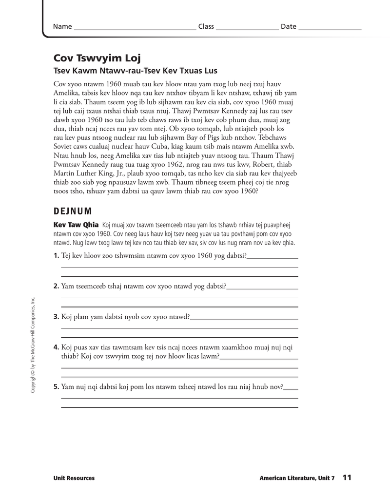 Name Class Date Cov Tswvyim Loj Tsev Kawm Ntawv-rau-Tsev Kev Txuas Lus Covxyoontawm1960muabtaukevhloovntauyamtxoglubneejtxujhauv Amelika,tabsiskevhloovnqataukevntxhovtibyamlikevntshaw,txhawjtibyam liciasiab.Thaumtseemyogiblubsijhawmraukevciasiab,covxyoo1960muaj tejlubcaijtxausntshaithiabtsausntuj.ThawjPwmtsavKennedyzajlusrautsev dawbxyoo1960tsotaulubtebchawsrawsibtxojkevcobphumdua,muajzog dua,thiabncajnceesrauyavtomntej.Obxyootomqab,lubntiajtebpooblos raukevpuasntsoognuclearraulubsijhawmBayofPigskubntxhov.Tebchaws SovietcawscualuajnuclearhauvCuba,kiagkaumtsibmaisntawmAmelikaxwb. Ntauhnublos,neegAmelikaxavtiaslubntiajtebyuavntsoogtau.ThaumThawj PwmtsavKennedyraugtuatuagxyoo1962,nrograunwstuskwv,Robert,thiab MartinLutherKing,Jr.,plaubxyootomqab,tasnrhokevciasiabraukevthajyeeb thiabzoosiabyognpausuavlawmxwb.Thaumtibneegtseempheejcojtienrog tsoostsho,tshuavyamdabtsiuaqauvlawmthiabraucovxyoo1960? DEJNUM Kev Taw Qhia Koj muaj xov txawm tseemceeb ntau yam los tshawb nrhiav tej puavpheej ntawm cov xyoo 1960. Cov neeg laus hauv koj tsev neeg yuav ua tau povthawj pom cov xyoo ntawd. Nug lawv txog lawv tej kev nco tau thiab kev xav, siv cov lus nug nram nov ua kev qhia. 1. Tejkevhloovzootshwmsimntawmcovxyoo1960yogdabtsi? 2. Yamtseemceebtshajntawmcovxyoontawdyogdabtsi? 3. Kojplamyamdabtsinyobcovxyoontawd? Copyright© by The McGraw-Hill Companies, Inc. 4. Kojpuasxavtiastawmtsamkevtsisncajnceesntawmxaamkhoomuajnujnqi thiab?Kojcovtswvyimtxogtejnovhloovlicaslawm? 5. Yamnujnqidabtsikojpomlosntawmtxheejntawdlosrauniajhnubnov? Unit Resources American Literature, Unit 7 11