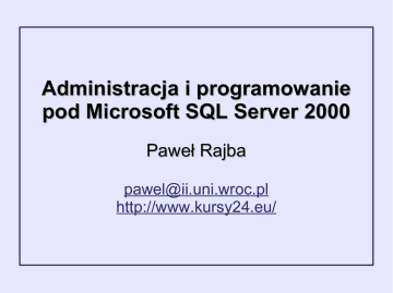Administracja i programowanie pod Microsoft SQL Server 2000 Paweł Rajba [email protected] http://www.kursy24.eu/ Zawartość modułu 10 Instalacja SQL Servera 2000 Wymagania sprzętowe Przegląd wersji SQL Servera Zbieranie informacji do instalacji Instalacja Zdarzenia SQL Servera Konfiguracja instalacji Microsoft SQL Server 2000 -1- Copyright © Paweł Rajba Instalacja SQL Servera 2000 Wymagania sprzętowe Przegląd wersji SQL Servera Zbieranie informacji do instalacji Instalacja Zdarzenia SQL Servera Konfiguracja instalacji Microsoft SQL Server 2000 -2- Copyright © Paweł Rajba Wymagania sprzętowe RAM 32/256MB (wersja standard) 64/512MB (wersja enterprise) Procesor Pentium III 733 MHz AMD Athlon 1000 MHz Microsoft SQL Server 2000 -3- Copyright © Paweł Rajba Wymagania sprzętowe Dyski Rozmiar zależy od ilości użytkowników oraz ilości i rozmiarów baz danych Zaleca się SCSI (szybkość) RAID (szybkość i ochrona danych) UPS – przydatny przy: Skokach napięcia Braku zasilania Microsoft SQL Server 2000 -4- Copyright © Paweł Rajba Przegląd wersji SQL Servera SQL Server 2000 Enterprise W pełni skalowalna i niezawodna Wyposażona w najwięcej dodatków Zaawansowane moduły analityczne (OLAP) Obsługuje: 64GB RAM, 32 Procesory wymaga wersji Datacenter Server Działa z: NT Server 4.0, 2000 Server, Advanced Server i Datacenter Server Nie działa z: Me, 98, NT 4.0 Workstation, 2000 Professional Microsoft SQL Server 2000 -5- Copyright © Paweł Rajba Przegląd wersji SQL Servera SQL Server 2000 Enterprise Eval Ma wszystkie cechy wersji Enterprise Działa przez 120 dni Licencja nie pozwala na wdrażanie Microsoft SQL Server 2000 -6- Copyright © Paweł Rajba Przegląd wersji SQL Servera SQL Server 2000 Developer Funkcjonalność taka jak w wersji Enterprise Umożliwia tworzenie dowolnych aplikacji wykorzystujących SQL Server 2000 Licencja uprawnia tylko do tworzenia i testowania oprogramowania (nie uprawnia do wdrażania) Działa z wszystkimi wersjami NT 4.0 i 2000 Nie działa z: ME, 9x Microsoft SQL Server 2000 -7- Copyright © Paweł Rajba Przegląd wersji SQL Servera SQL Server 2000 Standard Brak skalowalności, podstawowe opcje dotyczące wydajności Wyposażona w Analysis Services (OLAP), ale bez zaawansowanej analizy Obsługuje: 2GB RAM, 4 Procesory Działa z NT Server 4.0, 2000 Server, Advanced Server i Datacenter Server Nie działa z Me, 98, NT 4.0 Workstation, 2000 Professional Microsoft SQL Server 2000 -8- Copyright © Paweł Rajba Przegląd wersji SQL Servera SQL Server 2000 Personal Wersja przeznaczona do pracy na pojedynczym komputerze Następca wersji SQL Server 7 Desktop Obsługuje: 2GB RAM, 2 Procesory (w Windows 98 tylko 1) Ograniczona przepustowość przy wielu połączeniach (powyżej 5 użytkowników) Działa z wszystkimi wersjami NT 4.0 i 2000 oraz z Me i 98 Microsoft SQL Server 2000 -9- Copyright © Paweł Rajba Przegląd wersji SQL Servera SQL Server 2000 Desktop Engine Następca MSDE Wersja zawiera sam silnik bazy danych, bez żadnych narzędzi Można ją za darmo dołączać do produktów stworzonych przy pomocy Microsoft Visual Studio, Microsoft Office 2000 Developer oraz wszystkich wersji bazy danych SQL Server Działa z wszystkimi wersjami NT 4.0 i 2000 oraz z Me i 98 Microsoft SQL Server 2000 - 10 - Copyright © Paweł Rajba Zbieranie informacji do instalacji Licencjonowanie Per Processor Licensing licencja jest na każdy procesor Per Seat Licensing licencja jest na każdą stację roboczą podłączającą się do Servera SQL (CAL) Microsoft SQL Server 2000 - 11 - Copyright © Paweł Rajba Zbieranie informacji do instalacji Konta usług Lokalne konta systemowe SQL Server ma dostęp tylko do zasobów lokalnych Konta domenowe – potrzebne jeśli: SQL Server musi mieć dostęp do plików na innym komputerze w domenie Planujemy zadania działające na wielu serwerach SQL Server ma wysyłać emailem komunikaty Instalacja SQL Servera na kontrolerze domeny nie jest zalecana Microsoft SQL Server 2000 - 12 - Copyright © Paweł Rajba Zbieranie informacji do instalacji Rodzaj instancji Instancja domyślna Identyfikowana przez nazwę komputera Może być tylko jedna taka instancja Instancja nazwana Identyfikowana przez nazwę komputera i nazwę instacji Aplikacje muszą używać narzędzi klienckich SQL Servera do połączenia z taką instacją Może być uruchomionych max 16 instancji równocześnie Microsoft SQL Server 2000 - 13 - Copyright © Paweł Rajba Zbieranie informacji do instalacji Rodzaj autentykacji Windows Authentication Mode tylko konta z Windows Mixed Mode konta SQL i konta z Windows Rodzaj autentykacji można zmienić również po instalacji Microsoft SQL Server 2000 - 14 - Copyright © Paweł Rajba Zbieranie informacji do instalacji Zestawy znaków Windows Collation Pobierane z systemu Windows SQL Collation Zestawy znaków kompatybilne z wcześniejszymi wersjami SQL Servera Konieczne w przypadku replikacji z wcześniejszymi wersjami kod aplikacji korzysta ze strony kodowej Microsoft SQL Server 2000 - 15 - Copyright © Paweł Rajba Zbieranie informacji do instalacji Uwagi do zestawu znaków i reguł sortowania Zestaw znaków implikuje kolejność znaków Rozpoznawanie małych/wielkich liter Generowane wyniki np. w klauzuli WHERE nazwisko=‘KOWALSKI’ Nie należy zmieniać domyślnego zestawu znaków i reguł sortowania Przy zmianie collation trzeba przebudować wszystkie bazy danych Microsoft SQL Server 2000 - 16 - Copyright © Paweł Rajba Instalacja Wybieramy serwer Local computer Remote computer Następnie mamy listę Create a new instance of SQL Server, or install Client Tools Upgrade, remove, or add components to an existing instance of SQL Server Advanced options Microsoft SQL Server 2000 - 17 - Copyright © Paweł Rajba Instalacja Wprowadzamy infomacje o użytkowniku Czytamy licencję Z dalszych opji wybieramy Server and Client Tools Nazwa instancji Jeśli chcemy instancję nazwaną, odznaczamy Default i wpisujemy nazwę instancji Wyb
