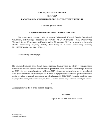 ZARZĄDZENIE NR 116/2016 REKTORA PAŃSTWOWEJ WYŻSZEJ SZKOŁY ZAWODOWEJ W KONINIE z dnia 19 grudnia 2016 r. w sprawie finansowania zadań Uczelni w roku 2017 Na podstawie § 43 ust. 1 pkt 11 statutu Państwowej Wyższej Szkoły Zawodowej w Koninie, stanowiącego załącznik do uchwały Nr 307/V/IV/2015 Senatu Państwowej Wyższej Szkoły Zawodowej w Koninie z dnia 28 kwietnia 2015 r. w sprawie uchwalenia statutu Państwowej Wyższej Szkoły Zawodowej w Koninie (zmienionej uchwałą Nr 55/VI/I/2016 z dnia 19.01.2016 r.) zarządza się, co następuje: §1 Do czasu uchwalenia przez Senat planu rzeczowo-finansowego na rok 2017 finansowanie działalności Uczelni będzie realizowane na podstawie planu rzeczowo-finansowego Uczelni na 2016 rok, przy czym koszty za I półrocze 2017 roku mogą być realizowane do wysokości 45% planu rzeczowo-finansowego z 2016 roku, z wyłączeniem kosztów z tytułu rozliczenia umów cywilno-prawnych zawartych na rok akademicki 2016/2017, kosztów mediów oraz wynagrodzeń i innych kosztów stałych, które Uczelnia ponosi na podstawie zawartych umów. §2 Zarządzenie wchodzi w życie z dniem podjęcia. REKTOR /-/ prof. zw. dr hab. Mirosław Pawlak Radca prawny /-/Katarzyna Klapsa