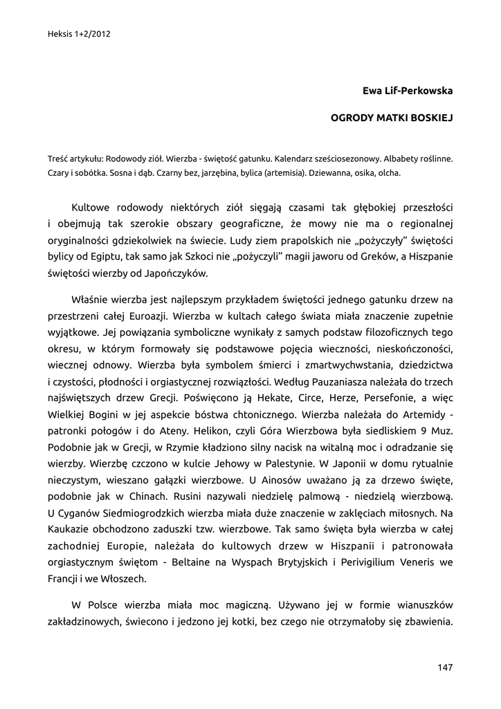 Heksis 1+2/2012 Ewa Lif-Perkowska OGRODY MATKI BOSKIEJ Treść artykułu: Rodowody ziół. Wierzba - świętość gatunku. Kalendarz sześciosezonowy. Albabety roślinne. Czary i sobótka. Sosna i dąb. Czarny bez, jarzębina, bylica (artemisia). Dziewanna, osika, olcha. Kultowe rodowody niektórych ziół sięgają czasami tak głębokiej przeszłości i obejmują tak szerokie obszary geogra'czne, że mowy nie ma o regionalnej oryginalności gdziekolwiek na świecie. Ludy ziem prapolskich nie „pożyczyły” świętości bylicy od Egiptu, tak samo jak Szkoci nie „pożyczyli” magii jaworu od Greków, a Hiszpanie świętości wierzby od Japończyków. Właśnie wierzba jest najlepszym przykładem świętości jednego gatunku drzew na przestrzeni całej Euroazji. Wierzba w kultach całego świata miała znaczenie zupełnie wyjątkowe. Jej powiązania symboliczne wynikały z samych podstaw 'lozo'cznych tego okresu, w którym formowały się podstawowe pojęcia wieczności, nieskończoności, wiecznej odnowy. Wierzba była symbolem śmierci i zmartwychwstania, dziedzictwa i czystości, płodności i orgiastycznej rozwiązłości. Według Pauzaniasza należała do trzech najświętszych drzew Grecji. Poświęcono ją Hekate, Circe, Herze, Persefonie, a więc Wielkiej Bogini w jej aspekcie bóstwa chtonicznego. Wierzba należała do Artemidy patronki połogów i do Ateny. Helikon, czyli Góra Wierzbowa była siedliskiem 9 Muz. Podobnie jak w Grecji, w Rzymie kładziono silny nacisk na witalną moc i odradzanie się wierzby. Wierzbę czczono w kulcie Jehowy w Palestynie. W Japonii w domu rytualnie nieczystym, wieszano gałązki wierzbowe. U Ainosów uważano ją za drzewo święte, podobnie jak w Chinach. Rusini nazywali niedzielę palmową - niedzielą wierzbową. U Cyganów Siedmiogrodzkich wierzba miała duże znaczenie w zaklęciach miłosnych. Na Kaukazie obchodzono zaduszki tzw. wierzbowe. Tak samo święta była wierzba w całej zachodniej Europie, należała do kultowych drzew w Hiszpanii i patronowała orgiastycznym świętom - Beltaine na Wyspach Brytyjskich i Perivigilium Veneris we Francji i we Włoszech. W Polsce wierzba miała moc magiczną. Używano jej w formie wianuszków zakładzinowych, świecono i jedzono jej kotki, bez czego nie otrzymałoby się zbawienia. 147 Heksis 1+2/2012 Wierzba była też najważniejszym mieszkaniem polskich kulawych diabłów z Borutą na czele, tym awatarem polskiego bóstwa wegetacyjnego Wielkiej Bogini. A Brűckner zanotował, że Jan Stanko, lekarz XV-wieczny, nazywa wierzbę – babica - co nawiązać można do bogini angielskiej zwanej Matką Wierzbową. Zaś Baba czy Baba Jędza, było nazwaniem żeńskiego bóstwa naszych terenach. Kultowe używanie ziół wiązało się całkowicie z obrzędami wegetacyjnymi, a te z kolei stanowiły trzon neolitycznego syndromu Wielkiej Macierzy. Do niego tez należał kalendarz 6-sezonowy którego poszczególne pory rozgraniczały daty-święta jeszcze dzisiaj znane: - gody (przesilenie zimowe), zapusty, równonoc wiosenna, sobótka (przesilenie letnie), dożynki, równonoc jesienna, zaduszki. Chrześcijaństwo przypisało swoje święta do tych samych dat, poświęcając zarazem przynależne do nich rośliny, które biorąc udział we wszystkich obrzędach wiosenno-letnich, zbiegały się do swej Pani, Diany-Artemidy, w dzień jej poświęcony, nazwany później dniem Matki Boskiej Zielnej. Tak Więc Sosna brała czynny udział w obrzędach od Godów do Zielonych Świątek, potem już nie występując zupełnie. Wierzba i brzoza również należały do roślin obrzędowych wiosennych, podczas gdy bylica, łopian, dziurawiec, czarny bez, dziewanna i inne - były ziołami przede wszystkim sobótkowymi, a leszczyna, jarzębina czy jabłoń drzewami dożynek i dojrzałych plonów jesieni. Do sfery kultowej należały nie tylko kalendarze różnego typu, ale i szereg alfabetów, wśród których istniały też alfabety roślinne. Kilka z nich zachowało się na zachodzie Europy, a rośliny, z których je tworzono, odgrywały wybitną rolę w obrzędach. W jednym z takich alfabetów zwanych „Beth-Luius-Nion” - od nazwy trzech pierwszych roślin w nim wymienionych - kultowy szereg drzew jest następujący - brzoza, jarzębina, jesion, olcha, wierzba, dąb, leszczyna, czarny bez, wrzos, topola, jabłoń. Temu zbiorowi można przeciwstawić zestaw polskich roślin wymienionych tylko przez Kolberga w jego „Ludzie”, układając je w szereg zależny od częstości występowania w obyczajach. Wyglądałby on następująco - bylica, czarny bez, wierzba, lipa, brzoza, leszczyna, jarzębina, olcha, osika, dziewanna, dąb, sosna, jesion, jabłoń. Jak widać, nacisk położony jest na inne rośliny, takie jak bylica, czarny bez, lipa, natomiast znaczenie dębu i jesionu wyraźnie jest mniejsze. 148 Heksis 1+2/2012 Jedną z rzeczy rzucających się natychmiast w oczy w zespole polskim, są nazwy tych roślin. Wszystkie z wyjątkiem dębu, jesionu i dziurawca, są rodzaju żeńskiego przy czym dla dębu mamy dębinę i dąbrowę, a dla czarnego bzu - bzinę. Naturalnie wynika to między innymi z właściwości języka polskiego, ale jest ważne, zważywszy, że w Anglii, na przykład, drzewa są rodzaju żeńskiego, mimo że język tego nie wyraża, w Niemczech zaś, choć drzewo - der Baum - jest rodzaju męskiego, niemal wszystkie wymienione wyżej rośliny mają, podobnie jak u nas, nazwy żeńskie, nawet dąb i jesion, które, jak z historii mitów wiadomo, bardzo wcześnie stały się symbolami bóstwa męskiego. Jeszcze w średniowieczu w Niemczech do niektórych drzew zwracano się przez „pani” – „Frau”. Mówiono: pani dębino, pani jarzębino, pani leszczyno, tarnino, bzino, jodło, lipo, olcho. I wszystkie one były poświęcone i należały do Pani Holle, czyli Huldy, czyli Berthy, czyli Gody, po prostu Białej Pani, Wielkiej Bogini. Ich więź mitologiczna z tym bóstwem zachowała się be