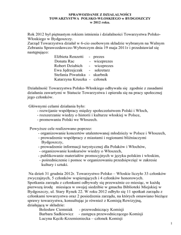 SPRAWOZDANIE Z DZIAŁALNOŚCI TOWARZYSTWA POLSKO-WŁOSKIEGO w BYDGOSZCZY w 2012 roku. Rok 2012 był piętnastym rokiem istnienia i działalności Towarzystwa PolskoWłoskiego w Bydgoszczy. Zarząd Towarzystwa działał w 6-cio osobowym składzie wybranym na Walnym Zebraniu Sprawozdawczo-Wyborczym dnia 19 maja 2011r i przedstawiał się następująco: Elżbieta Renzetti - prezes Donata Rac - wiceprezes Robert Dziubich - wiceprezes Ewa Jędrzejczak - sekretarz Stefania Piwańska - skarbnik Katarzyna Kruszka - członek Działalność Towarzystwa Polsko-Włoskiego odbywała się zgodnie z zasadami działania zawartymi w Statucie Towarzystwa i opierała się na pracy społecznej jego członków. Głównymi celami działania było: - rozwijanie współpracy między społeczeństwem Polski i Włoch, - rozszerzanie wiedzy o historii i kulturze włoskiej w Polsce, - promowaniu Polski we Włoszech. Powyższe cele realizowano poprzez: - organizowanie koncertów utalentowanej młodzieży w Polsce i Włoszech, - prowadzenie współpracy z miastami i regionami bliźniaczymi Bydgoszczy, - prowadzenie informacji turystycznej dla Polaków i Włochów, - organizowanie konkursów wiedzy o Włoszech, - publikowanie materiałów promocyjnych w języku polskim i włoskim, - pośredniczenie i pomoc w organizowaniu przedsięwzięć w zakresie kultury i sztuki. Na dzień 31 grudnia 2012r. Towarzystwo Polsko – Włoskie liczyło 33 członków zwyczajnych, 5 członków wspierających i 4 członków honorowych. Spotkania zarządu z członkami odbywały się przeważnie co miesiąc, w każdą pierwszą środę miesiąca w swojej siedzibie w gmachu Biblioteki Miejskiej w Bydgoszczy, ul. Stary Rynek 22. W roku 2012 odbyło się 11 spotkań zarządu z członkami towarzystwa oraz 2 posiedzenia zarządu, na których omawiano bieżące sprawy towarzystwa, konsultując je również z Komisją Rewizyjną, działającą w składzie: Bolesław Ciemniak - przewodniczący Komisji Barbara Sadkiewicz - zastępca przewodniczącego Komisji Lucyna Kęcik-Krzemieniecka – członek Komisji 1 Elżbieta Kuźniar - członek Komisji Towarzystwo Polsko-Włoskie prowadzi swoją stronę internetową www.api.bydgoszcz.pl z której każdy może dowiedzieć się o naszych aktualnych imprezach oraz z lat poprzednich. Można przeczytać statut, zapoznać się z zasadami członkostwa ,obejrzeć zdjęcia z imprez i uzyskać przydatne informacje turystyczne. Zdjęcia z różnych imprez i wydarzeń krajowych i zagranicznych można też oglądać na Facebooku prowadzonym przez prezes Elżbietę Renzetti. Działalność Towarzystwa Polsko-Włoskiego w 2012r. przedstawiała się następująco: 12 stycznia 2012 . Spotkanie noworoczne. Członkowie Towarzystwa Polsko –Włoskiego spotkali się aby zainaugurować swoją działalność statutową w 2012 roku w kawiarni Cafe Pianola w Bydgoszczy przy ul. Jagiellońskiej 3. Prezes Towarzystwa Elżbieta Renzetti podziękowała zarządowi i członkom Towarzystwa za ich zaangażowanie w realizację planów w 2011 roku. Omówiła też prognozowany program działań w 2012 roku oraz potrzeby finansowe niezbędne na jego realizację, a także możliwości pozyskania tych środków. W miłej atmosferze przy kawie i słodyczach obejrzano film o Rzymie. Spotkanie to uświetniła swoją obecnością pani Aleksandra Marzyńska będąca licencjonowanym przewodnikiem po Rzymie i Muzeach Watykańskich, która w bardzo ciekawy sposób uzupełniła zawartość oglądanego filmu. 7 marca 2012. Dzień Kobiet po Włosku. Organizatorem spotkania kobiet z okazji ich święta było Towarzystwo Polsko –Włoskie przy współudziale Miejskiego Centrum Kultury w Bydgoszczy, który udostępnił nam lokal kawiarni Cafe Pianola. Otwarcia imprezy dokonała zastępca prezydenta m. Bydgoszczy pani Grażyna Ciemniak oraz wiceprzewodnicząca zarządu Kobiet Polskich w Regionie KujawskoPomorskim pani Maria Gałęska. Specjalnie dla bydgoszczanek przygotowany został piękny program o życiu i kulturze we Włoszech p.t. „Moje włoskie impresje”. Autorka tego opracowania pani Bożena Baran jest z wykształcenia pedagogiem. Mieszkała w małym miasteczku na północy Włoch i tam poznawała kulturę, architekturę, przyrodę oraz życie ludzi w ich odświętnym i codziennym wymiarze. W programie spotkania z okazji Dnia Kobiet znalazła się również poezja i pamięć o wielkich noblistach literatury polskiej Czesławie Miłoszu i Wisławie Szymborskiej. Niezależnie od tego wiceprezes Towarzystwa Polsko -Włoskiego Donata Rac zaprezentowała wykonaną przez siebie biżuterię srebrną. 2 Wśród przybyłych bydgoszczanek, gośćmi imprezy były seniorki – siatkarki bydgoskiej Astorii. 15 kwietnia 2012. Urodziny Miasta Bydgoszczy. W tym dniu w Operze Nova odbył się koncert z okazji 666 urodzin miasta Bydgoszczy. Dodatkową okazją do świętowania było 50-lecie partnerstwa Bydgoszczy i włoskiego miasta Reggio Emilia. Gośćmi koncertu byli: Andrea Capelli, radny Rady Miasta Reggio Emilia i przewodniczący Komisji Kultury oraz Elisa Grisanti, koordynator projektów europejskich z organizacji Reggio Del Mondo. W czasie koncertu z okazji urodzin miasta tradycyjnie wręczone zostały medale, nagrody i stypendia. Medalem Kazimierza Wielkiego w tym roku uhonorowano miasto Reggio Emilia z okazji 50-lecia partnerskich kontaktów z Bydgoszczą, a medal Prezydenta Bydgoszczy otrzymało Towarzystwo Polsko-Włoskie z okazji 15-lecia działalności. Przyznany, piękny medal odebrała z rąk Prezydenta Rafała Bruskiego prezes Towarzystwa Polsko-Włoskiego Elżbieta Renzetti. Urodzinowy koncert uświetniła Orkiestra Symfoniczna Akademii Muzycznej w Bydgoszczy. W programie koncertu znalazły się m.in. „Cztery pory roku” Vivaldiego i koncert fortepianowy b-mol Czajkowskiego. Wśród słuchaczy koncertu nie zabrakło członków Towarzystwa Polsko-Włoskiego świętujących w tym momencie również 15-lecie swojej działalności. 25 kwietna 201