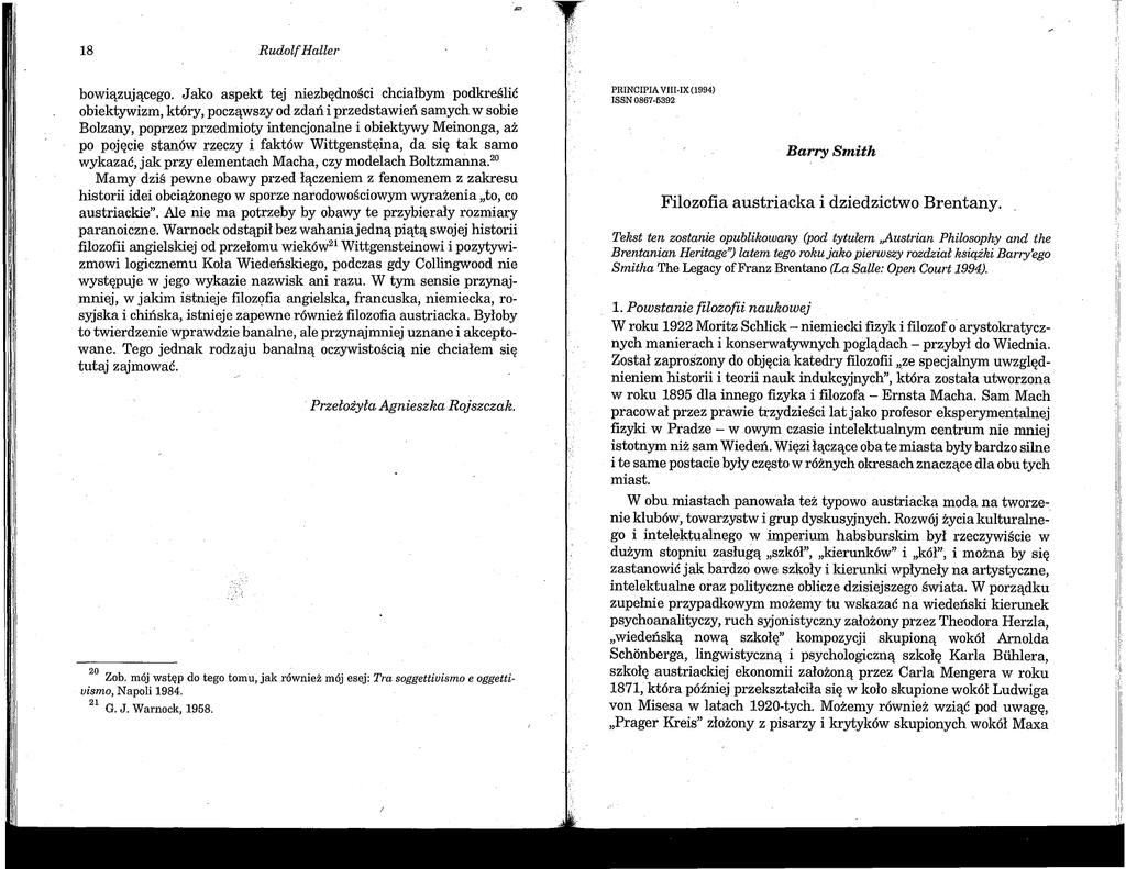 18 Rudolf Haller bowiq_zujq_cego. Jako aspekt tej niezb~dnosci chcialbym podkreslic obiektywizm, kt6ry, poczq_wszy od zdan i przedstawien sam~ch w sobie Bolzany, poprzez przedmioty intencjonalne i obiektywy Memonga, az po poj~cie stan6w rzeczy i fakt6w Wittgensteina, da si~ tak samo wykazac, jak przy elementach Macha, czy modelach Boltzmanna. 20 Mamy dzis pewne obawy przed lq_czeniem z fenomenem z zakresu historii idei obciq_zonego w sporze narodowosciowym wyrazenia ,,to, co austriackie". Ale nie ma potrzeby by obawy te przybieraly rozmiary paranoiczne. Warnock odstqpil bez wahaniajednq_ piq_tq_ swojej historii filozofii angielskiej od przelomu wiek6w21 Wittgensteinowi i pozytywizmowi logicznemu Kola Wiedenskiego, podczas gdy Collingwood nie wyst~puje w jego wykazie nazwisk ani razu. W tym sensie przynajmniej, w jakim istnieje filoz9fia angielska, francuska, niemiecka, rosyjska i chiilska, istnieje zapewne r6wniez filozofia austriacka. Byloby to twierdzenie wprawdzie banalne, ale przynajmniej uznane i akceptowane. Tego jednak rodzaju banalnq_ oczywistosciq_ nie chcialem si~ tutaj zajmowac. · PrzeloiylaAgnieszka Rojszczak. Zob. m6j wst~p do tego tomu, jak r6wniez m6j esej: Tra soggettiuismo e oggettiuismo, Napoli 1984. 21 G. J. Warnock, 1958. 20 PRINCIPIA VIII-IX(1994) ISSN 0867-5392 Barry Smith Filozofia austriacka i dziedzictwo Brentany. Tekst ten zostanie opublikowany (pod tytulem ,,Austrian Philosophy and the Brentanian Heritage'') latem tego rokujako pierwszy rozdzial ksiqiki Barry'ego Smitha The Legacy of Franz Brentano (La Salle: Open Court 1994). 1. Powstanie filozofii naukowej W roku 1922 Moritz Schlick - niemiecki fizyk i filozof o arystokratycznych manierach i konserwatywnych poglq_dach - przybyl do Wiednia. Zostal zaproszony do obj~cia katedry filozofii ,,,ze specjalnym uwzgl~d nieniem historii i teorii nauk indukcyjnych", kt6ra zostala utworzona w roku 1895 dla innego fizyka i filozofa - Ernsta Macha. Sam Mach pracowal przez prawie trzydziesci lat jako profesor eksperymentalnej fizyki w Pradze - w. owym czasie intelektualnym centrum nie mniej istotnym niz sam Wieden. Wi~zi lq_czq_ce oba te miasta byly bardzo silne i te same postacie byly cz~sto w r6znych okresach znaczq_ce dla obu tych miast. W obu miastach panowala tez typowo austriacka moda na tworzenie klub6w, towarzystw i grup dyskusyjnych. Rozw6j zycia kulturalnego i intelektualnego w imperium habsburskim byl rzeczywiscie w duzym stopniu zaslugq_ ,,szk6l", ,,kierunk6w" i ,,k6l", i mozna by si~ zastanowic jak bardzo owe szkoly i kierunki wplynely na artystyczne, intelektualne oraz polityczne oblicze dzisiejszego swiata. W porzq_dku zupelnie przypadkowym mozemy tu wskazac na wiedenski kierunek psychoanalityczy, ruch syjonistyczny zalozony przez Theodora Herzla, ,,wiedenskq_ nowq_ szkol~" kompozycji skupionq_ wok6l Arnolda Schonberga, lingwistycznq_ i psychologicznq_ szkol~ Karla Biihlera, szkol~ austriackiej ekonomii zalozonq_ przez Carla Mengera w roku 1871, kt6ra p6iniej przeksztalcila si~ w kolo skupione wok6l Ludwiga von Misesa w latach 1920-tych. Mozemy r6wniez wziq_c pod uwag~, ,,Prager Kreis" zlozony z pisarzy i krytyk6w skupionych wok6l Maxa Filozofia austriacka i dziedzictwo Brentany. 20 Barry Smith \ r I r 11·.1.' '11 ·111·' . 1jl I: I rl I" . Broda i Franza Kafki, lingwistyczne kolo Romana Jakobsona Jana Mukarovsky'ego i Nikolai Trubetzkoy'a, lub tez, w blizszych' nam czasach, filozoficznq grup~ dyskusyjnq spotykajqcq si~ regul.arnie w mieszkaniu Vaclava Havla, z kt6rej wyr6sl p6foiej trzon czeskiego Forum Obywatelskiego. R6wniez Schlick mial swoje kolo dyskusyjne, kt6re spotykalo si~ w czwartkowe wieczory. Nalezeli do niego przede wszystkim matematycy z kr~gu Hansa Hahna, ucznia Macha i Boltzmanna. Wymienic nalezy Kurta Gi:idla, Gustava Bergmanna, Karla Mengera (syn ekonomisty Carla) oraz asystenta samego Schlicka - Friedricha Waismanna. Do kr~gu Schlicka zaliczyc mozna r6wniez Philippa Franka, Herberta Feigla, Viktora Krafta, Rudolfa Carnapa i oczywiscie socjologa i filozofa o proletariackich manierach i socjalistycznych poglqdach Otto Neuratha. Carnap, poza samym Schlickiem, jest jedynym Niemcem na tej liscie i zadziwiajqce jest jak logiczny pozytywizm, ale i tez scisla albo inaczej - naukowa filozofia, kt6rej cz~sciqjest wlasnie logiczny pozytywizm, byla i jest fenomenem typowo austriackim. W tym kontekscie przychodzi na mysl nie tylko Mach ale r6wniez inna praska postac wczesniejszej generacji - Bernard Bolzano. Bolzano byl ksi~dzem i reformatorem spolecznym. Byl tez zarazem wybitnym logikiem matematycznym i filozofem nauki, choc jego zaslugi na tyro polu doceniono dopiero po jego smierci. Przychodzi r6wniez na mysl Ludwig Boltzmann, dzialajqcy r6wnolegle z Machem, jak i sam Wittgenstein, Ludwik Fleck, Karl Poper, Michael Polany, Paul Feyerabend, Wolfgang Stegmilller i Imre Lakatos - wszyscy oni byli Austriakami (lub Austro-Wegrami), kt6rzy, bardziej lub mniej, przyczynili si~ do uksztaltowania dzisiejszej filozofii nauki. 1 1 . 21 lnnym Austriakiem zasluguj11cym na wspomnienie, jest ekonomista Friedrich von Haye~, o?legly kuzyn Wittgensteina, kt6ry jest autorem zainspirowanych przez Macha roz~az~n natl podstawami psychologii (1952) jak r6wniez pracy o historii i filozofii nauk socJolog1cznych,' Mo~na r6wniez "."spomniec w~gierskiego filozofa i teoretyka socjologii Karla Mannhe1ma, Jednego z glownych zalozycieli tzw. sociologii wiedzy" Zob JC Nyfri, 1989. " " . · . . . Moze najbardziej godnym uwagijest tu Ludwik Fleck. Fleck urodzil w roku 1896 we Lwowie, stolicy Galicji, na wschodnich krancach imperium Habsburg6w. Byl autorem okolo 200 naukowych prac z dziedziny medycyny i mikrobiologii. 2 Byl r6wniez autorem dluzszej pracy filozoficznej opublikowanej w roku 1935 pt. Geneza- i rozw6j faktu naukowego. Wprowadzenie do doktryny stylu poznawczego i mysli kolektywnej, kt6ra interesujqcajest w pierwszym rz~dzie z uwagi na wklad, jaki wniosla do rodzqcej si~ dyscypliny zwanej ,,socjologiq nauki". Antycypowal