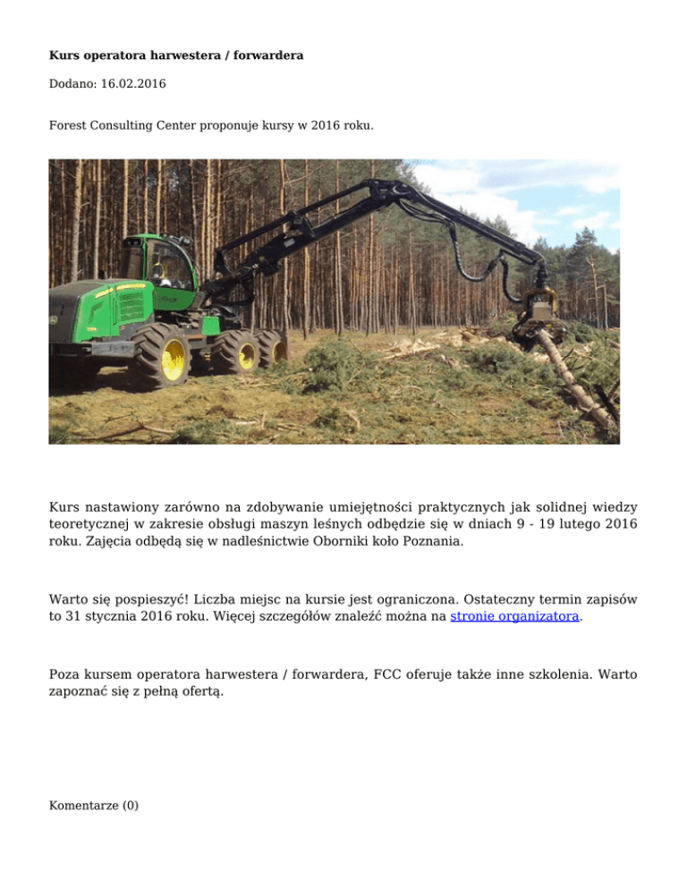 Kurs operatora harwestera / forwardera Dodano: 16.02.2016 Forest Consulting Center proponuje kursy w 2016 roku. Kurs nastawiony zarówno na zdobywanie umiejętności praktycznych jak solidnej wiedzy teoretycznej w zakresie obsługi maszyn leśnych odbędzie się w dniach 9 - 19 lutego 2016 roku. Zajęcia odbędą się w nadleśnictwie Oborniki koło Poznania. Warto się pospieszyć! Liczba miejsc na kursie jest ograniczona. Ostateczny termin zapisów to 31 stycznia 2016 roku. Więcej szczegółów znaleźć można na stronie organizatora. Poza kursem operatora harwestera / forwardera, FCC oferuje także inne szkolenia. Warto zapoznać się z pełną ofertą. Komentarze (0) Nie dodano jeszcze żadnego komentarza.