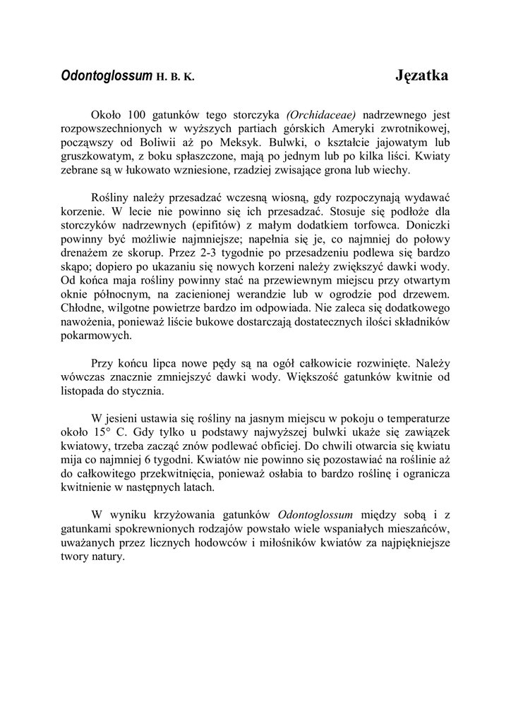 Odontoglossum H. B. K. Jęzatka Około 100 gatunków tego storczyka (Orchidaceae) nadrzewnego jest rozpowszechnionych w wyższych partiach górskich Ameryki zwrotnikowej, począwszy od Boliwii aż po Meksyk. Bulwki, o kształcie jajowatym lub gruszkowatym, z boku spłaszczone, mają po jednym lub po kilka liści. Kwiaty zebrane są w łukowato wzniesione, rzadziej zwisające grona lub wiechy. Rośliny należy przesadzać wczesną wiosną, gdy rozpoczynają wydawać korzenie. W lecie nie powinno się ich przesadzać. Stosuje się podłoże dla storczyków nadrzewnych (epifitów) z małym dodatkiem torfowca. Doniczki powinny być możliwie najmniejsze; napełnia się je, co najmniej do połowy drenażem ze skorup. Przez 2-3 tygodnie po przesadzeniu podlewa się bardzo skąpo; dopiero po ukazaniu się nowych korzeni należy zwiększyć dawki wody. Od końca maja rośliny powinny stać na przewiewnym miejscu przy otwartym oknie północnym, na zacienionej werandzie lub w ogrodzie pod drzewem. Chłodne, wilgotne powietrze bardzo im odpowiada. Nie zaleca się dodatkowego nawożenia, ponieważ liście bukowe dostarczają dostatecznych ilości składników pokarmowych. Przy końcu lipca nowe pędy są na ogół całkowicie rozwinięte. Należy wówczas znacznie zmniejszyć dawki wody. Większość gatunków kwitnie od listopada do stycznia. W jesieni ustawia się rośliny na jasnym miejscu w pokoju o temperaturze około 15° C. Gdy tylko u podstawy najwyższej bulwki ukaże się zawiązek kwiatowy, trzeba zacząć znów podlewać obficiej. Do chwili otwarcia się kwiatu mija co najmniej 6 tygodni. Kwiatów nie powinno się pozostawiać na roślinie aż do całkowitego przekwitnięcia, ponieważ osłabia to bardzo roślinę i ogranicza kwitnienie w następnych latach. W wyniku krzyżowania gatunków Odontoglossum między sobą i z gatunkami spokrewnionych rodzajów powstało wiele wspaniałych mieszańców, uważanych przez licznych hodowców i miłośników kwiatów za najpiękniejsze twory natury.