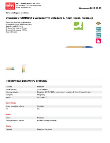PBS Connect Polska Sp. z o.o. ul. Annopol 3, 03-236 Warszawa www.pbspolska.eu Warszawa, 2016-06-15 Karta katalogowa produktu: Długopis Q-CONNECT z wymiennym wkładem 0, 4mm (linia), niebieski Klasyczny długopis, jednorazowy Skuwka z klipsem w kolorze tuszu Średnica kulki: 0,7mm Grubość linii pisania: 0,4mm Długość linii pisania: 1400m Kolor niebieski Podstawowe parametry produktu SKU PBS KF34047 Kod kreskowy 5708029340477 Nazwa produktu Długopis Q-CONNECT z wymiennym wkładem 0, 4mm (linia), niebieski Kategoria Długopisy Marka Q-CONNECT Certyfikaty Nowy produkt w ofercie Standard Hit Hit Kolor Kolor Niebieski Kolor obudowy/ wkładu Pomarańczowy/niebieski Cecha Produkt Długopis klasyczny PBS Connect Polska Sp. z o.o. ul. Annopol 3, 03-236 Warszawa www.pbspolska.eu Warszawa, 2016-06-15 Karta katalogowa produktu cd. Długopis Q-CONNECT z wymiennym wkładem 0, 4mm (linia), niebieski Podstawowe parametry produktu Typ Metalizowana końcówka W ofercie od 2013-01 Wymiary Dł. linii (m) 1400 Grubość linii (mm) 0,4 Wspólny słownik zamówień CPV 30192121-5 Długopisy kulkowe Jednostki logistyczne Opakowanie 1 20 szt Opakowanie 2 200 szt Opakowanie 3 1000 szt Opakowanie 4 36000 szt