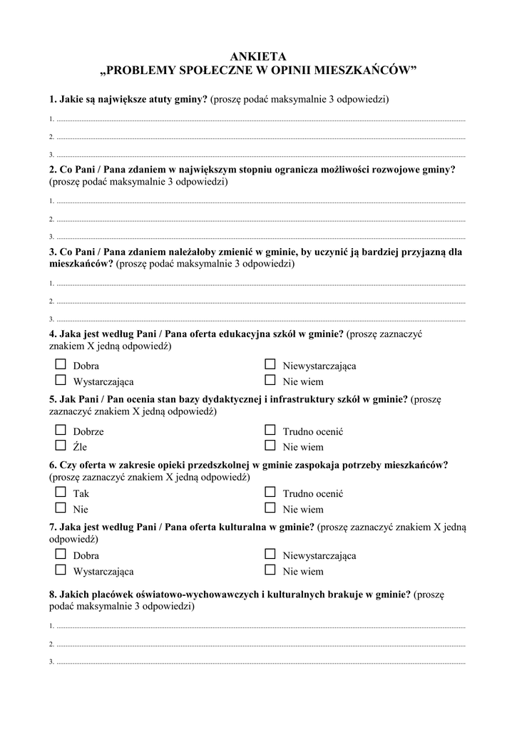 ANKIETA „PROBLEMY SPOŁECZNE W OPINII MIESZKAŃCÓW” 1. Jakie są największe atuty gminy? (proszę podać maksymalnie 3 odpowiedzi) 1. ....................................................................................................................................................................................................................................... 2. ....................................................................................................................................................................................................................................... 3. ....................................................................................................................................................................................................................................... 2. Co Pani / Pana zdaniem w największym stopniu ogranicza możliwości rozwojowe gminy? (proszę podać maksymalnie 3 odpowiedzi) 1. ....................................................................................................................................................................................................................................... 2. ....................................................................................................................................................................................................................................... 3. ....................................................................................................................................................................................................................................... 3. Co Pani / Pana zdaniem należałoby zmienić w gminie, by uczynić ją bardziej przyjazną dla mieszkańców? (proszę podać maksymalnie 3 odpowiedzi) 1. ....................................................................................................................................................................................................................................... 2. ....................................................................................................................................................................................................................................... 3. ....................................................................................................................................................................................................................................... 4. Jaka jest według Pani / Pana oferta edukacyjna szkół w gminie? (proszę zaznaczyć znakiem X jedną odpowiedź) □ Dobra □ Wystarczająca □ Niewystarczająca □ Nie wiem 5. Jak Pani / Pan ocenia stan bazy dydaktycznej i infrastruktury szkół w gminie? (proszę zaznaczyć znakiem X jedną odpowiedź) □ Dobrze □ Źle □ Trudno ocenić □ Nie wiem 6. Czy oferta w zakresie opieki przedszkolnej w gminie zaspokaja potrzeby mieszkańców? (proszę zaznaczyć znakiem X jedną odpowiedź) □ Tak □ Nie □ Trudno ocenić □ Nie wiem 7. Jaka jest według Pani / Pana oferta kulturalna w gminie? (proszę zaznaczyć znakiem X jedną odpowiedź) □ Dobra □ Wystarczająca □ Niewystarczająca □ Nie wiem 8. Jakich placówek oświatowo-wychowawczych i kulturalnych brakuje w gminie? (proszę podać maksymalnie 3 odpowiedzi) 1. ....................................................................................................................................................................................................................................... 2. ....................................................................................................................................................................................................................................... 3. ....................................................................................................................................................................................................................................... 9. Jak Pani / Pan ocenia funkcjonowanie służby zdrowia w gminie? (proszę zaznaczyć znakiem X jedną odpowiedź) □ Dobrze □ Wystarczająco □ Niewystarczająco □ Nie wiem 10. Jakich lekarzy specjalistów brakuje w gminie? (proszę podać maksymalnie 3 odpowiedzi) 1. ....................................................................................................................................................................................................................................... 2. ....................................................................................................................................................................................................................................... 3. ....................................................................................................................................................................................................................................... 11. Jakie działania należałoby podjąć w gminie dla zaspokojenia potrzeb mieszkańców w zakresie ochrony zdrowia? (proszę przedstawiać maksymalnie 3 propozycje) 1. ....................................................................................................................................................................................................................................... 2. ....................................................................................................................................................................................................................................... 3. ....................................................................................................................................................................................................................................... 12. Jaka jest według Pani / Pana oferta gminy w zakresie s