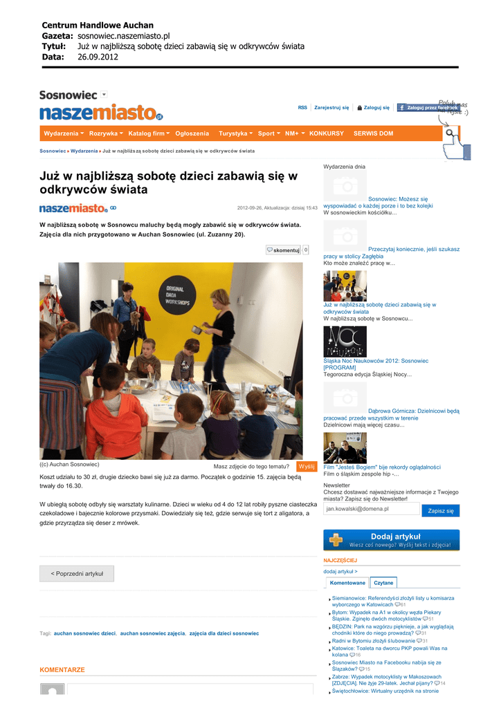 Centrum Handlowe Auchan Gazeta: sosnowiec.naszemiasto.pl Tytu³: Ju¿ w najbli¿sz¹ sobotê dzieci zabawi¹ siê w odkrywców wiata Data: 26.09.2012 RSS Wydarzenia Rozrywka Katalog firm Ogłoszenia Turystyka Sport NM+ Zarejestruj się KONKURSY Zaloguj się Zaloguj przez facebook SERWIS DOM Sosnowiec » Wydarzenia » Już w najbliżs zą sobotę dzieci zabawią się w odkrywców świata Wydarzenia dnia Już w najbliższą sobotę dzieci zabawią się w odkrywców świata GD 2012-09-26, Aktualizacja: dzisiaj 15:43 Sosnowiec: Możesz się wyspowiadać o każdej porze i to bez kolejki W sosnowieckim kościółku... W najbliższą sobotę w Sosnowcu maluchy będą mogły zabawić się w odkrywców świata. Zajęcia dla nich przygotowano w Auchan Sosnowiec (ul. Zuzanny 20). skomentuj 0 Przeczytaj koniecznie, jeśli szukasz pracy w stolicy Zagłębia Kto może znaleźć pracę w... Już w najbliższą sobotę dzieci zabawią się w odkrywców świata W najbliższą sobotę w Sosnowcu... Śląska Noc Naukowców 2012: Sosnowiec [PROGRAM] Tegoroczna edycja Śląskiej Nocy... Dąbrowa Górnicza: Dzielnicowi będą pracować przede wszystkim w terenie Dzielnicowi mają więcej czasu... ((c) Auchan Sosnowiec) Masz zdjęcie do tego tematu? Wyślij Koszt udziału to 30 zł, drugie dziecko bawi się już za darmo. Początek o godzinie 15. zajęcia będą Film "Jesteś Bogiem" bije rekordy oglądalności Film o śląskim zespole hip -... Newsletter Chcesz dostawać najważniejsze informacje z Twojego miasta? Zapisz się do Newsletter! trwały do 16.30. W ubiegłą sobotę odbyły się warsztaty kulinarne. Dzieci w wieku od 4 do 12 lat robiły pyszne ciasteczka czekoladowe i bajecznie kolorowe przysmaki. Dowiedziały się też, gdzie serwuje się tort z aligatora, a [email protected] Zapisz się gdzie przyrządza się deser z mrówek. Dodaj artykuł NAJCZĘŚCIEJ dodaj artykuł > < Poprzedni artykuł Komentowane Ciekawy | 0 Użyteczny | 0 Inspirujący | 0 Pobieżny | 0 Słaby temat | 0 Czytane Siemianowice: Referendyści złożyli listy u komisarza wyborczego w Katowicach 61 Tagi: auchan sosnowiec dzieci, auchan sosnowiec zajęcia, zajęcia dla dzieci sosnowiec Bytom: Wypadek na A1 w okolicy węzła Piekary Śląskie. Zginęło dwóch motocyklistów 51 BĘDZIN: Park na wzgórzu pięknieje, a jak wyglądają chodniki które do niego prowadzą? 31 KOMENTARZE Radni w Bytomiu złożyli ślubowanie 31 Katowice: Toaleta na dworcu PKP powali Was na kolana 16 Sosnowiec Miasto na Facebooku nabija się ze Ślązaków? 15 Zabrze: Wypadek motocyklisty w Makoszowach [ZDJĘCIA]. Nie żyje 29-latek. Jechał pijany? 14 Świętochłowice: Wirtualny urzędnik na stronie Centrum Handlowe Auchan Gazeta: sosnowiec.naszemiasto.pl Tytu³: Ju¿ w najbli¿sz¹ sobotê dzieci zabawi¹ siê w odkrywców wiata Data: 26.09.2012 internetowej urzędu miejskiego już działa Dodając komentarz akceptujesz regulamin. 13 PODOBNE ARTYKUŁY Już dziś 1. Żywiecki Piknik dla Miłośników Psów pod hasłem Pies w służbie człowieka Dodaj komentarz 1. Żywiecki Piknik dla Miłośników Psów pod hasłem "Pies w służbie człowieka" odbędzie się dzisiaj (23.09) w żywieckim amfiteatrze pod Grojcem. Brak komentarzy. Możesz być pierwszy! Już widać zmiany na cmentarzu Czy pawilon handlowy, który wybudowano za cmentarną kaplicą zostanie oddany do użytku przed 1 listopada? Wykonawca inwestycji nie ma co do tego wątpliwości.... Wielka Warszawska już w niedzielę na Torze Wyścigów Konnych na Służewiu Wielka Warszawska jest w wyścigowym kalendarzu gonitwą wyjątkową. Co roku przyciąga na stołeczny hipodrom tłumy ludzi, zarówno stałych bywalców, jak i... I Capgemini Run już za nami [ZDJĘCIA] W pierwszym bieguCapgemini Run zorganizowanym przez Capgemini Polska Sp. z o.o we współpracy z Smith&Nephew oraz Krakowskim Klubem Biegacza Dystans łącznie... SONDA Jaki jest największy grzech PKP? j Pociągi jeżdżą w żółwim tempie k l m n j Spóźnienia są na porządku dziennym k l m n n Pociągi są stare i w fatalnym stanie j k l m technicznym j Dworce są brudne i zaniedbane k l m n n W pociągach brakuje maszynistów, a w j k l m administracji panuje biurokracja j Brakuje działających kas k l m n Głosuj OGŁOSZENIA NIERUCHOMOŚCI Mieszkanie 1-pokojowe, 32 m2, 3 piętro 60 000 zł BARDZO PILNE ATRAKCYJNA CENA !!!!!! OFERTA GODNA POLECENIA !!!!!! Oferujemy Mieszkanie 1-pokojowe, 29,73 m2, 7 piętro 87 000 zł Zobacz więcej na dom.gratka.pl » OGŁOSZENIA MOTORYZACYJNE Toyota Corolla Sol 17900.00 zł Oferuję do sprzedaży zadbaną, niezawodną i bardzo popularną Toyotę Corollę Wagon. Data pierwszej rejestracji 28.02 Ford Focus Trend, pakiet Gold 17900.00 zł Ford Focus kombi Trend z pakietem Gold, TDCI TURBODIESEL Kraj pochodzenia: Polska Kraj aktualnej rejestracji: Pols Centrum Handlowe Auchan Gazeta: sosnowiec.naszemiasto.pl Tytu³: Ju¿ w najbli¿sz¹ sobotê dzieci zabawi¹ siê w odkrywców wiata Data: 26.09.2012 Zobacz więcej na moto.gratka.pl » OGŁOSZENIA PRACODAWCÓW Przedstawiciel handlowy Bielsko-Biała WYMAGANIA: - odporność na stres, - umiejętność prowadzenia negocjacji, - kreatywność i pracowitość, zaangażowanie w prace, - mile widziane doświadczen... Współpraca Katowice i okolice Europejska sieć zajmująca się dystrybucją towarów i usług w oparciu o sieć sklepów internetowych poszukuje osoby (małżeństwa) pracujące lub z działalnoś... Kierowca samochodu ciężarowego Dąbrowa Górnicza Zatrudnię kierowcę z kat C, kursem przewozu rzeczy.Jazda głównie po terenie śląska i małopolski,codzienne powroty do domu.Wynagrodzenie 2000.Zapraszam c... Zobacz więcej na praca.gratka.pl » ZOBACZ KONIECZNIE PPHU PROMETEUSZ LIŚĆ OLIWNY(r) Wybierz swoje mieszkanie... Okiem recenzenta Junior Media... i tworzysz gazetę! Ściągnij aplikację Powierzchnie biurowe do wynajęcia Biblijny pogromca mikrobów - www.biohit.pl Spokojne mieszkanie w centrum miasta Zobacz, co warto przecz