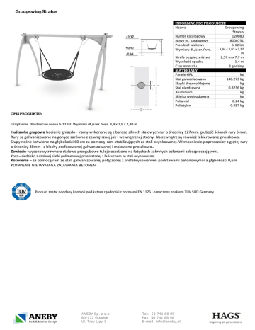 Nazwa Numer katalogowy Nowy nr. katalogowy Przedział wiekowy Wymiary dł./szer./wys. Groupswing Stratus 120080 8000751 5-12 lat 3,94 x 2,97 x 2,37 m Strefa bezpieczeństwa Wysokość upadku Czas montażu 2,57 m x 7,7 m 1,4 m 3 godziny Panele HPL Stal galwanizowana Słupki drewno klejone Stal nierdzewna Aluminium Sklejka wodoodporna Poliamid Polietylen kg 148.273 kg kg 0.8236 kg kg kg 0.24 kg 0.487 kg Urządzenie dla dzieci w wieku 5-12 lat. Wymiary dł./szer./wys. 3,9 x 2,9 x 2,40 m Huśtawka grupowa bocianie gniazdo – ramy wykonane są z bardzo silnych stalowych rur o średnicy 127mm, grubość ścianek rury 5 mm. Rury są galwanizowane na gorąco zarówno z zewnętrznej jak i wewnętrznej strony. Na zewnątrz są również lakierowane proszkowo. Słupy nośne kotwione na głębokości 60 cm za pomocą ram stabilizujących ze stali ocynkowanej. Wzmocnienie poprzecznicy z giętej rury o średnicy 38mm i z blachy preforowanej galwanizowanej i malowane proszkowo.. Zawiesie- wysokowytrzymałe stalowe przegubowe tuleje osadzone na łożyskach zakrytych osłonami zabezpieczającymi. Kosz – siedzisko z drobnej siatki polimerowej przeplatanej z łańcuchem ze stali ocynkowanej. Kotwienie – za pomocą ram ze stali galwanizowanej połączonej z prefabrykowanymi podstawami betonowymi na głębokości 0,6m KOTWIENIE NIE WYMAGA ZALEWANIA BETONEM Produkt został poddany kontroli pod kątem zgodności z normami EN 1176 i oznaczony znakiem TÜV SÜD Germany ANEBY Sp. z o.o. 80-172 Gdańsk Ul. Trzy Lipy 3 Tel: 58 741 88 09 Fax: 58 741 88 96 E-mail: [email protected]