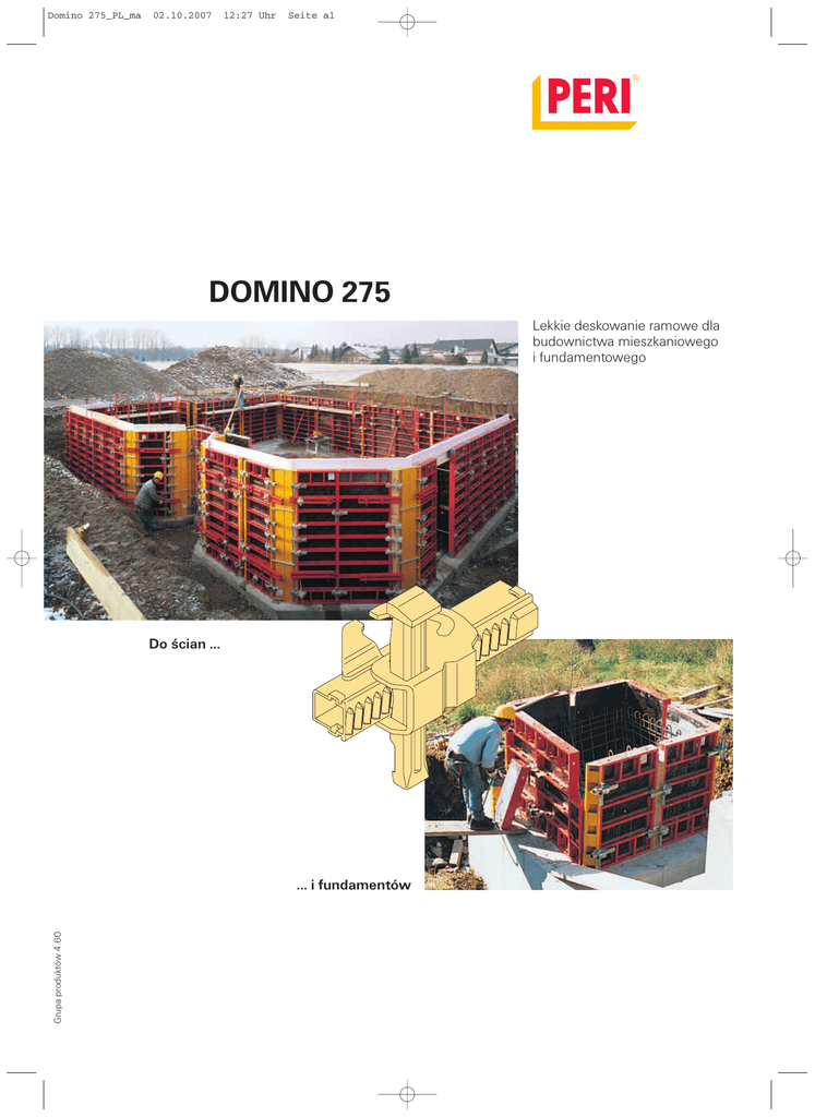 Domino 275_PL_ma 02.10.2007 12:27 Uhr Seite a1 DOMINO 275 Lekkie deskowanie ramowe dla budownictwa mieszkaniowego i fundamentowego Do ścian ... Grupa produktów 4.60 ... i fundamentów Domino 275_PL_ma 04.10.2007 15:35 Uhr Wydanie 10/2007 PERI GmbH P.O. Box 12 64 89259 Weissenhorn Tel.: 0 73 09 / 9 50-0 Fax: 0 73 09 / 9 51-0 [email protected] www.peri.de Uwagi: Przy stosowaniu naszych wyrobów należy przestrzegać obowiązujących w poszczególnych krajach przepisów bezpieczeństwa i higieny pracy. Zdjęcia w niniejszej broszurze ilustrują chwilowy stan występujący na konkretnych budowach. Należy bezwzględnie przestrzegać wskazówek bezpieczeństwa oraz dopuszczalnych obciążeń. Wszelkie odstępstwa lub zmiany wymagają oddzielnego sprawdzenia stanów granicznych. Zmiany konstrukcyjne wynikające z postępu techniki oraz pomyłki i błędy w druku są zastrzeżone. Seite a2 Domino 275_PL_ma 02.10.2007 12:28 Uhr Seite a3 Spis treści Strona PERI DOMINO 275 Nowe, lekkie deskowanie ramowe dla ścian do 2,75 m wysokości 2-3 Stosowanie PERI DOMINO 275 Naroża, ściany odchodzące i kompensacje luk 4-5 Osprzęt PERI DOMINO 275 dla ułatwienia i przyspieszenia robót deskowaniowych 6-7 Część katalogowa 8 - 21 PERI w Polsce 22 - 23 PERI na świecie 24 - 25 1 Domino 275_PL_ma 02.10.2007 12:29 Uhr Seite 2 PERI DOMINO 275 Nowe, lekkie deskowanie ramowe dla ścian do 2,75 m wysokości. PERI DOMINO 275 jest lekkim deskowaniem ramowym dla budownictwa mieszkaniowego i fundamentowego, o elementach stalowych lub aluminiowych. Zostało zaprojektowane specjalnie dla deskowania ścian piwnic o wysokości do 2,75 m, fundamentów i szybów. Tylko 4 szerokości płyt 1,00 m, 0,75 m, 0,50 m, 0,25 m dla każdego kształtu kondygnacji. Płytao szerokości 0,75 m dostępna jest również jako płyta uniwersalna. Zamek DRS Łączy, licuje i uszczelnia w jednym cyklu roboczym. ➀ Zamek DRS w normalnym połączeniu płyt... ➁ ➂ ➀ 275 x 100 ➁ 275 x 75 ➂ 275 x 50 ➃ 275 x 25 stalowa stalowa i aluminiowa stalowa stalowa Zamek DRS umożliwia użycie do kompensacji krawędziaków do 12 cm grubości. ... lub z krawędziakiem do 12 cm grubości. 2 ➃ Domino 275_PL_ma 02.10.2007 12:29 Uhr Seite 3 Zamek klinowy DKS do standardowego połączenia płyt deskowania fundamentów. Płyty DOMINO są bardzo lekkie, ale pomimo tego przenoszą duże obciążenia. Zamek klinowy DKS do standardowych połączeń elementów, nie poddawanych dużym obciążeniom. Płyta aluminiowa 275x75 cm waży tylko 52 kg. Wysokie dopuszczalne parcie mieszanki betonowej. Przy wysokościach betonowania do 2,75 m, z 2 poziomami ściągów, deskowanie DOMINO przejmuje pełne parcie hydrostatyczne mieszanki betonowej, spełniając wymagania DIN 18202, tabl. 3, wiersz 6. Przy większych wysokościach z 3 poziomami ściągów dopuszcza się parcie mieszanki betonowej 60 kN/m2, spełniając wymagania DIN 18202, tabl. 3, wiersz 6. Umożliwia to szybkie betonowanie i zapewnia płaskie powierzchnie elementów betonowych. Przy wysokościach betonowania do 2,75 m wymagane są tylko 2 poziomy ściągów. Oznacza to 1,375 m2 powierzchni ściany na ściąg. – Wspornik pomostu roboczego DG 85 zapewnia przy betonowaniu powierzchnię roboczą o szerokości 85 cm. – Dopuszczalny rozstaw wsporników wynosi 2 m przy obciążeniu użytkowym 150 kg/m2. Gotowe do użycia deskowanie DOMINO z zastrzałami i pomostem betoniarskim. 3 Domino 275_PL_ma 02.10.2007 12:29 Uhr Seite 4 Stosowanie PERI DOMINO 275 Naroża, ściany odchodzące i kompensacje luk Płyty szerokości 50 cm i narożnik zewnętrzny DAW tworzą naroże zewnętrzne. Razem z wstawką kompensacyjną DWD 5 można zadeskować ściany o grubości od 15 cm do 35 cm w module co 5 cm. Krawędziak 1cm DWD 5 DWD 5 DAR 80 2 DWD 5 DAR 80 DWD 5 2 DWD 5 Rygiel wyrównawczy DAR 80 D 50 25 D 50 25 DGE W narożu wewnętrznym i w standardowym połączeniu płyt potrzebne są 2 zamki DRS. 4 DAR 80 35 30 Podstawowe zasady dla naroży: Naroże zewnętrzne: płyta D 50, narożnik zewnętrzny DAW. Naroże wewnętrzne: narożnik przegubowy DGE, kompensacja deskowania do żądanej grubości ściany przy pomocy wstawki kompensacyjnej DWD lub krawędziaka. Narożnik zewnętrzny DAW 24 20 Naroża W narożu zewnętrznym potrzebne są po 4 zamki DRS na połączenie narożnika z płytą. Domino 275_PL_ma 02.10.2007 12:29 Uhr Seite 5 20 Ściany odchodzące Płyty szerokości 75 cm i narożniki przegubowe DGE tworzą deskowanie ściany odchodzącej. Przy wykorzystaniu wstawki kompensacyjnej DWD 5 możliwe jest uzyskanie grubości ścian od 15 do 35 cm w module co 5 cm. DWD 5 Podstawowe zasady dla ścian odchodzących: Deskowanie zewnętrzne: płyta D 75 Deskowanie wewnętrzne: narożniki przegubowe DGE, kompensacja do żądanej grubości ściany przy pomocy wstawki kompensacyjnej DWD lub krawędziaka. 24 Krawędziak 1cm DGE 25 DGE D 75 30 Kompensacje luk Do 30 cm przy pomocy krawędziaków kompensacyjnych DPA oraz rygli wyrównawczych DAR 80. Do 12 cm przy pomocy zamków DRS i krawędziaków. DWD 5 35 DWD 5 5 Domino 275_PL_ma 02.10.2007 12:29 Uhr Seite 6 Osprzęt PERI DOMINO 275 dla ułatwienia i przyśpieszenia robót deskowaniowych . . . Wszystkie żebra poprzeczne płyt DOMINO mają otwory do mocowania elementów osprzętu. Te drobne szczegóły pozwalają deskować łatwo i szybko. Głowica zastrzału DRA Służy do mocowania zastrzałów i rozpór do żeber pionowych i poziomych. Wspornik pomostu roboczego DG 85 Wspornik dla pomostów roboczo-betoniarskich szerokości 85 cm. Integralny zamek klinowy umożliwia bardzo prosty montaż Wystarczy zawiesić i zabezpieczyć sworzniem. Kłonice piętrzące DOMINO DSR Ułatwiają przemieszczanie żurawiem i składowanie w stosie na budowie. Stosy płyt mogą być również przemieszczane wózkiem widłowym. Kłonice pozwalają na szybkie i bezpieczne piętrzenie 8 płyt jednakowej wielkości. Przemieszczanie płyt w stosie przy użyciu kłonic piętrzących DOMINO DSR. H