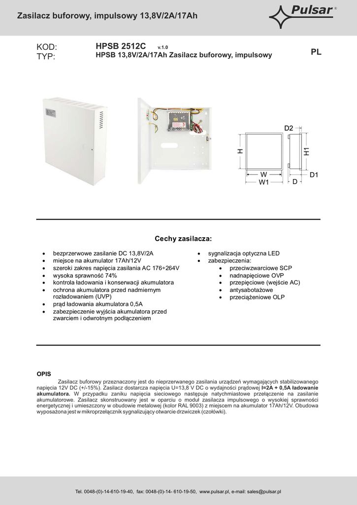 Pulsar Zasilacz buforowy, impulsowy 13,8V/2A/17Ah KOD: TYP: HPSB 2512C v.1.0 HPSB 13,8V/2A/17Ah Zasilacz buforowy, impulsowy PL Cechy zasilacza: · · · · · · · · bezprzerwowe zasilanie DC 13,8V/2A miejsce na akumulator 17Ah/12V szeroki zakres napięcia zasilania AC 176÷264V wysoka sprawność 74% kontrola ładowania i konserwacji akumulatora ochrona akumulatora przed nadmiernym rozładowaniem (UVP) prąd ładowania akumulatora 0,5A zabezpieczenie wyjścia akumulatora przed zwarciem i odwrotnym podłączeniem · · sygnalizacja optyczna LED zabezpieczenia: · przeciwzwarciowe SCP · nadnapięciowe OVP · przepięciowe (wejście AC) · antysabotażowe · przeciążeniowe OLP OPIS Zasilacz buforowy przeznaczony jest do nieprzerwanego zasilania urządzeń wymagających stabilizowanego napięcia 12V DC (+/-15%). Zasilacz dostarcza napięcia U=13,8 V DC o wydajności prądowej I=2A + 0,5A ładowanie akumulatora. W przypadku zaniku napięcia sieciowego następuje natychmiastowe przełączenie na zasilanie akumulatorowe. Zasilacz skonstruowany jest w oparciu o moduł zasilacza impulsowego o wysokiej sprawności energetycznej i umieszczony w obudowie metalowej (kolor RAL 9003) z miejscem na akumulator 17Ah/12V. Obudowa wyposażona jest w mikroprzełącznik sygnalizujący otwarcie drzwiczek (czołówki). wyjście TAMPER : przewody 30cm Tel. 0048-(0)-14-610-19-40, fax: 0048-(0)-14- 610-19-50, www.pulsar.pl, e-mail: [email protected] ® Zasilacz buforowy, impulsowy 13,8V/2A/17Ah DANE TECHNICZNE Typ zasilacza: Zasilanie: Pobór prądu: Moc zasilacza: Sprawność: Napięcie wyjściowe: Prąd wyjściowy: Prąd wyjściowy tAMB<30°C: Prąd wyjściowy tAMB=40°C: Zakres regulacji napięcia wyjściowego: Napięcie tętnienia: Prąd ładowania akumulatora: Zabezpieczenie przed zwarciem SCP: Zabezpieczenie w obwodzie akumulatora OLP: Zabezpieczenie nadnapięciowe OVP: Zabezpieczenie akumulatora przed nadmiernym rozładowaniem UVP: Optyczna sygnalizacja pracy: Warunki pracy: Obudowa: Wymiary: Waga netto/brutto: Miejsce na akumulator: Zamykanie: Zabezpieczenie antysabotażowe: Uwagi: Pulsar A (EPS - External Power Source) 176÷264V AC 50÷60Hz 0,45A@230VAC max. 35W max. 74% 13,8V DC – praca buforowa 9,5V÷13,8V DC – praca bateryjna 2A + 0,5A ładowanie akumulatora 2,0 A + 0,5A ładowanie akumulatora - patrz wykres 1 1,4 A + 0,5A ładowanie akumulatora - patrz wykres 1 12÷14VDC 120mV p-p max. 0,5A max. @ 17Ah (± 5%) Elektroniczne bezpiecznik polimerowy U>115% ÷ 150% napięcia wyjściowego - odłączenie napięcia wyjściowego, przywracane automatycznie U<9,5 V (± 5%) – odłączenie zacisku akumulatora Tak - diody LED II klasa środowiskowa, -10 oC÷40 oC metalowa IP20, kolor RAL9003 285 x 297 x 80+8 [mm] (280 x 292 x 80) (WxHxD) 2,10kg / 2,20kg 17Ah/12V (SLA) max. Wkręt walcowy x 1 (z czoła) (możliwość montażu zamka) 1x mikrowyłącznik: otwarcie obudowy 0,5A@50VDC max, NC Obudowa posiada dystans od ściany (podłoża) - 8 mm Chłodzenie zasilacza: konwekcyjne, Złącza: Zasilanie: Φ0,63÷2,5 I/O PCB : Φ0,41÷1,63 , wyjścia akumulatora: 6,3F-2,5/40cm. Wykres 1. Dopuszczalny prąd wyjściowy zasilacza w zależności od temperatury otoczenia. wyjście TAMPER : przewody 30cm Tel. 0048-(0)-14-610-19-40, fax: 0048-(0)-14- 610-19-50, www.pulsar.pl, e-mail: [email protected] ® Pulsar Zasilacz buforowy, impulsowy 13,8V/2A/17Ah ® Opcjonalne konfiguracje zasilacza Z akumulatorem 17Ah HPSB2512C Zasilacz buforowy HPSB 13,8V/2x1A/17Ah. - HPSB2512C + LB2 2x1A (AWZ585, AWZ586) + 17Ah 230V AC LB2 13.8V 13.8V 2x1A DC 13.8V Akumulator 17Ah HPSB2512C Zasilacz buforowy HPSB 13,8V/4x0,5A/17Ah. 230V AC - HPSB2512C + LB4 4x0,5A (AWZ574, AWZ576) + 17Ah LB4 13.8V 13.8V 4x0,5A DC 13.8V Akumulator 17Ah RN250 HPSB2512C Zasilacz buforowy HPSB 13,8V/12V/2A/17Ah. 13.8V 13.8V 230V AC - HPSB2512C + RN250 (13,8V/12V) + 17Ah 12V/2A 12V DC 13.8V Akumulator 17Ah RN250 HPSB2512C Zasilacz buforowy HPSB 13,8V/12V/2x1A/17Ah. - HPSB2512C + RN250 (13,8V/12V) + LB2 2x1A (AWZ585, AWZ586) + 17Ah LB2 13.8V 13.8V 230V AC 12V 12V 2x1A 12V DC 13.8V Akumulator 17Ah RN250 HPSB2512C Zasilacz buforowy HPSB 13,8V/12V/4x0,5A/17Ah. - HPSB2512C + RN250 (13,8V/12V) + LB4 4x0,5A (AWZ574, AWZ576) + 17Ah 13.8V 13.8V 230V AC LB4 12V 12V DC 13.8V Akumulator 17Ah Zasilacz buforowy HPSB 13,8V/5V÷7,4V/2A/17Ah. DCDC20 HPSB2512C 230V - HPSB2512C + DCDC20 (5V÷7,4V/2A) + 17Ah AC 13.8V DC DC 13.8V Akumulator 17Ah wyjście TAMPER : przewody 30cm Tel. 0048-(0)-14-610-19-40, fax: 0048-(0)-14- 610-19-50, www.pulsar.pl, e-mail: [email protected] 5V÷7.4V/2A DC 12V 4x0,5A