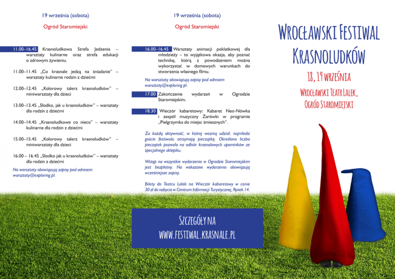 11.00–16.45 Krasnoludkowa Strefa Jedzenia – warsztaty kulinarne oraz strefa edukacji o zdrowym żywieniu. 11.00–11.45 „Co krasnale jedzą na śniadanie” – warsztaty kulinarne rodzin z dziećmi 12.00–12.45 „Kolorowy talerz miniwarsztaty dla dzieci krasnoludków” – 13.00–13.45 „Słodko, jak u krasnoludków” – warsztaty dla rodzin z dziećmi 14.00–14.45 „Krasnoludkowe co nieco” – warsztaty kulinarne dla rodzin z dziećmi 15.00–15.45 „Kolorowy talerz miniwarsztaty dla dzieci krasnoludków” – 16.00 – 16.45 „Słodko jak u krasnoludków” – warsztaty dla rodzin z dziećmi Na warsztaty obowiązują zapisy pod adresem [email protected]. 16.00–16.45 Warsztaty animacji poklatkowej dla młodzieży – to wyjątkowa okazja, aby poznać technikę, którą z powodzeniem można wykorzystać w domowych warunkach do stworzenia własnego filmu. Na warsztaty obowiązują zapisy pod adresem [email protected]. 17.00 Zakończenie Staromiejskim. wydarzeń w Ogrodzie 18.30 Wieczór kabaretowy: Kabaret Neo-Nówka i zespół muzyczny Żarówki w programie „Pielgrzymka do miejsc śmiesznych”. Za każdą aktywność, w której wezmą udział, najmłodsi goście festiwalu otrzymają pieczątkę. Określona liczba pieczątek pozwala na odbiór krasnalowych upominków ze specjalnego sklepiku. Wstęp na wszystkie wydarzenia w Ogrodzie Staromiejskim jest bezpłatny. Na wskazane wydarzenia obowiązują wcześniejsze zapisy. Bilety do Teatru Lalek na Wieczór kabaretowy w cenie 30 zł do nabycia w Centrum Informacji Turystycznej, Rynek 14. Szczegóły na www.festiwal.krasnale.pl Wrocławski Festiwal Krasnoludków 18, 19 września Wrocławski Teatr Lalek, Ogród Staromiejski 18 września (piątek) 19 września (sobota) Rynek Ogród Staromiejski 10.00 Wielka Wrocławska Parada Krasnoludków na otwarcie festiwalu! 11.00–17.00 Krasnoludkowe bajki przygotowane specjalnie na festiwal przez Teatr Gili Gili, założony przez absolwentów wydziału lalkarskiego wrocławskiego oddziału PWST. Ogród Staromiejski 10.30–13.00 Wielki konkurs plastyczny dla szkół podstawowych i przedszkoli na najpiękniej udekorowaną chatkę. Zgłoszenia szkół przyjmujemy od 1.09 pod adresem [email protected]. 10.30–16.00 Wielka Wioska Krasnoludków – okazja, by przenieść się na chwilę do świata krasnali. W programie m.in tworzenie krasnalowych masek, warsztaty i animacje wokalne, taneczne i parateatralne oraz strefa plastyczna. 16.00 Zakończenie pierwszego dnia festiwalu. W tym roku zapraszamy na trzy przedstawienia, w tym dwie absolutne premiery. 11.00 i 14.00 „Geniusz” – z Muzeum Przyrodniczego Uniwersytetu Wrocławskiego uciekły różne gatunki owadów. Specjalna drużyna krasnali musi jak najszybciej sprowadzić je z powrotem, zanim stanie się im coś złego. 12.00 i 15.00 „Złota wyspa” – bez wątpienia każda dziewczynka chciała zostać kiedyś księżniczką lub choć przez chwilę marzyła o złotym zamku i klejnotach. Krasnalka Marysia Pięknisia nie wie jeszcze, że chciwość może zaprowadzić nawet w najgłębsze zakamarki oceanu. 13.00 i 16.00 „Koszmarny koszmar” – bajka, której akcja dzieje się świecie snów. Śpiochowi przyśnił się koszmarny koszmar. Czy nauczy dzieci, jak radzić sobie ze złymi snami i nieprzespanymi nocami? 11.30 Bajkobus: „Tesla vs Edison” – oparta na faktach historia zaciętej rywalizacji dwóch wielkich wynalazców. 12.00–15.30 Rodzinna gra miejska „KrasnaLove Jedzonko” W tym roku gra nawiązuje do pomysłu stworzenia Wrocławskiej Książki Kulinarnej. Krasnale postanowiły włączyć się do akcji i opowiedzieć, jak radzą sobie z przepisami, gotowaniem i manierami przy stole, a przy okazji nauczyć tego graczy. Gra dla drużyn od 2 do 5 osób. Obowiązuje rezerwacja miejsc pod adresem [email protected]. 11.00–17.00 Wielka Wioska Krasnali – okazja, by przenieść się na chwilę do świata krasnali. W programie m.in sportowa strefa krasnoludków, budowanie krasnoludkowego miasta, tworzenie krasnalowych instrumentów z recyklingu i gipsowych odlewów krasnoludków, krasnalowa fotobudka oraz robienie nadruków na krasnoludkowe torby.