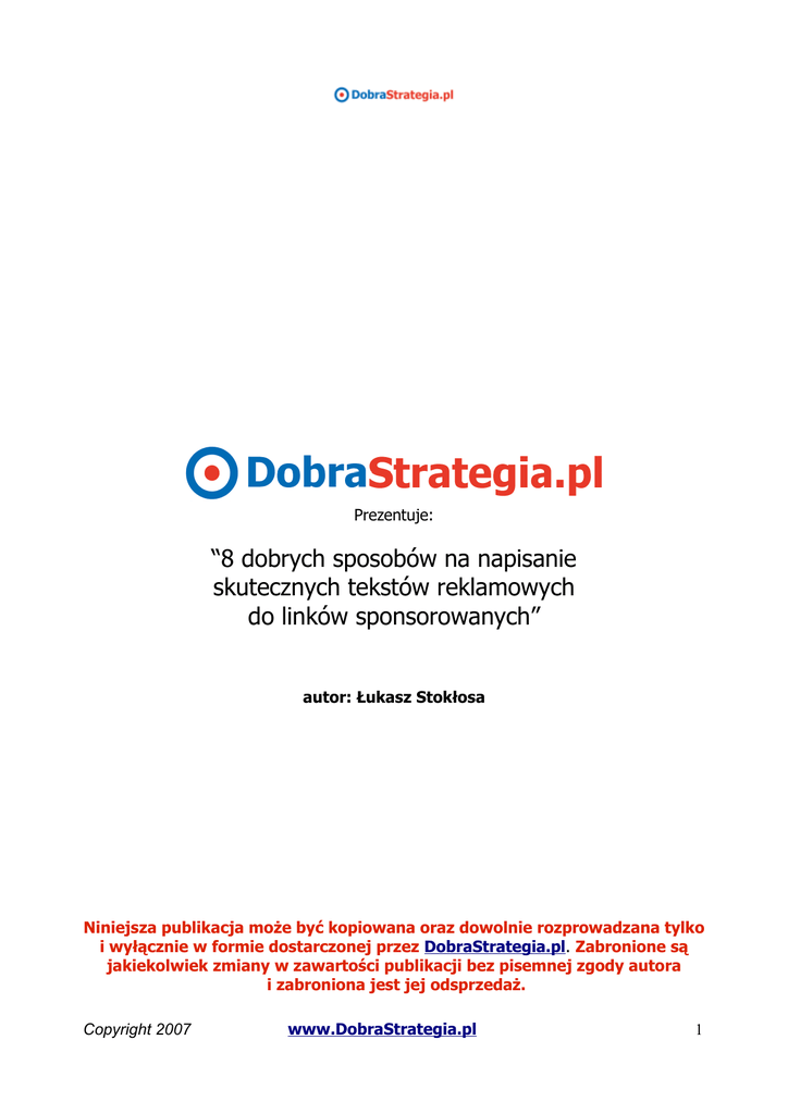Prezentuje: “8 dobrych sposobów na napisanie skutecznych tekstów reklamowych do linków sponsorowanych” autor: Łukasz Stokłosa Niniejsza publikacja może być kopiowana oraz dowolnie rozprowadzana tylko i wyłącznie w formie dostarczonej przez DobraStrategia.pl. Zabronione są jakiekolwiek zmiany w zawartości publikacji bez pisemnej zgody autora i zabroniona jest jej odsprzedaż. Copyright 2007 www.DobraStrategia.pl 1 W trakcie Internetowego Warsztatu dla Przedsiębiorców uczestnicy uczą się między innymi o tym, jak dobrze stworzone i w odpowiednich miejscach umieszczone proste linki tekstowe mogą mieć naprawdę gigantyczną moc przyciągania zainteresowania klientów do oferty danej firmy. Podczas warsztatu skupiam się jednak na narzędziach, taktykach i strategiach marketingowych, które mogą przynieść dla zysków firm spektakularne efekty, a ich zastosowanie w wielu przypadkach jest całkowicie darmowe. W niniejszej publikacji opiszę natomiast to w jaki sposób możesz tworzyć Twoje teksty reklamowe do płatnych linków sponsorowanych, czasami nazywanych boksami. Linki sponsorowane najczęściej możesz zobaczyć w wyszukiwarkach, ponad wynikami wyszukiwania oraz z prawej strony tych wyników, a także w innych serwisach internetowych, które uczestniczą w danym programie reklamowym. W tego typu reklamach płacisz ustaloną stawkę za kliknięcia klientów w treść reklamy, a nie płacisz za ilość wyświetleń samego linku. W dalszej części tej publikacji podam sprawdzone przeze mnie sposoby napisania skutecznych tekstów reklamowych, które są najbardziej efektywne z punktu widzenia płatnej reklamy prowadzonej za pomocą linków sponsorowanych. Nie jest to wcale takie proste, gdyż w linkach sponsorowanych masz ograniczoną ilość miejsca dla napisania Twoich skutecznych tekstów. Przeważnie jest to 25 znaków tekstu w tytule linku, dwie dodatkowe linijki tekstu po 35 znaków oraz dodatkowe miejsce na podanie adresu strony www. Copyright 2007 www.DobraStrategia.pl 2 Ważne jest także dla Ciebie pod względem opłacalności i optymalizacji kosztów kampanii reklamowej, aby przez Twoją reklamę w linkach sponsorowanych do oferty docierali wyłącznie tacy potencjalni klienci, którzy zostawią u Ciebie swoje pieniądze. Dlatego warto abyś wcześniej poznał dokładnie swojego potencjalnego klienta, jego styl życia, jego wartości, nawyki i potrzeby, by móc maksymalnie wyeliminować kliknięcia w płatną reklamę przez przypadkowych ludzi, gdyż takie “puste kliknięcia” będą tylko powodowały koszty. Warto także abyś nauczył się, jak szybko i dokładnie obliczyć opłacalność płatnych kampanii reklamowych, by te kampanie generowały zyski, a nie straty. Przykłady, sponsorowanych które są zobaczysz stworzone w przeze kolejnych mnie dla propozycjach zapytania linków użytkownika w wyszukiwarce Google.pl – “ opalanie airbrush Kraków “. Przypomnę jeszcze raz. Z uwagi na to, iż linki sponsorowane są płatną formą reklamy dlatego aby rentowność tak przeprowadzonej kampanii reklamowej była wysoka, powinny być one tworzone w ten sposób, aby wyświetlały się wyłącznie tym potencjalnym klientom, którzy są naprawdę zainteresowani daną ofertą. Wtedy masz bowiem wielką szansę na to, że odpowiednio duży odsetek ludzi, którzy kliknęli w tak stworzony Twój link sponsorowany od Ciebie kupi Twoje produkty lub usługi. Copyright 2007 www.DobraStrategia.pl 3 Pierwszy sposób: Treść linku zawierająca słowa kluczowe. Wykorzystanie w treści linku sponsorowanego słów kluczowych powoduje, że taka reklama ma wysoką klikalność. Potencjalny klient widzi w jej treści, najczęściej pogrubione słowa kluczowe, które wpisał w wyszukiwarkę. Dlatego jest niezmiernie ważne, aby tak napisana reklama rzeczywiście dokładnie odpowiadała zapytaniom użytkowników. Tylko w ten sposób duża liczba osób które kliknęły w nią będzie zainteresowana zakupem poszukiwanych przez siebie produktów lub usług. Drugi sposób: Teksty reklamowe, które sprzedają korzyści. Tak jak w tworzeniu skutecznych nagłówków, tak w linkach sponsorowanych dobrze sprawdzają się struktury w których, produkt albo usługę przedstawisz za pomocą korzyści. Tego typu linki obiecują potencjalnemu klientowi, co otrzyma w przypadku, gdy skorzysta z Twojej oferty. W ten sposób nie tylko zwiększasz skuteczność Twojej reklamy, ale również przybliżasz klientów do decyzji zakupowej. Tego typu linki pomagają także wyróżnić się spośród innych linków sponsorowanych, w sytuacji gdy te pozostałe linki zawierają słowa kluczowe. Copyright 2007 www.DobraStrategia.pl 4 Trzeci sposób: Zadawanie pytań w tekście reklamowym. Odpowiednio sformułowane pytania w tekście reklamowym zawsze zwracają uwagę i rozpalają ciekawość potencjalnych klientów, aby dowiedzieć się więcej o korzyściach, których one dotyczą. Musisz jednak dokładnie wiedzieć, co jest najważniejsze dla Twoich potencjalnych klientów lub jaki mają problem, który mogą szybko rozwiązać dzięki Twoim produktom lub usługom. albo Czwarty sposób: Wykorzystanie w treści linku słów kreujących ciekawość. O słowach kreujących ciekawość nie będę się ponownie rozpisywał gdyż o tym pisałem w pierwszym dniu darmowego kursu poświęconego pisaniu skutecznych nagłówków. Jak więc mógłby wyglądać taki link sponsorowany wykorzystujący schemat ze słowem kreującym ciekawość? Copyright 2007 www.DobraStrategia.pl 5 Piąty sposób: Link sponsorowany, który obiecuje gratis dla klienta. Chyba nie ma takiego klienta, który nie lubi dostawać czegoś za darmo. Ważne jest jednak, aby gratis dla klienta oferował pewną wartość i jak najbardziej odpowiadał poszukiwanym przez klienta usługom lub produktom. Gratis także powinien przybliżać klienta do podjęcia decyzji o skorzystaniu z Twojej oferty. Szósty sposób: Informacje o promocjach,