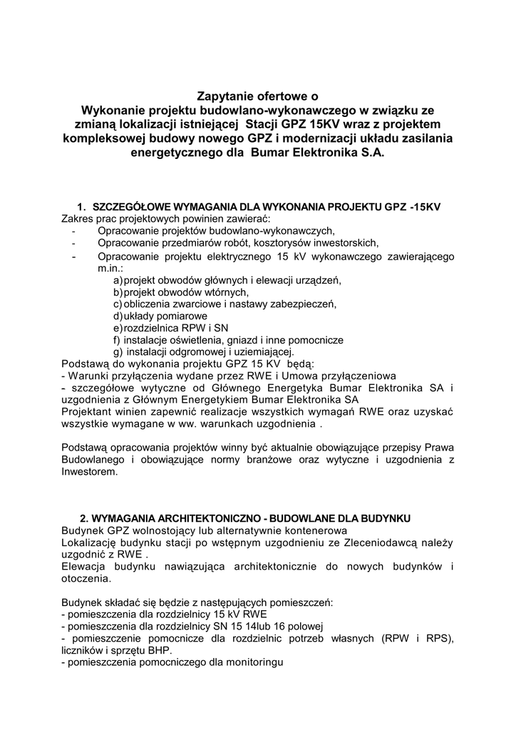 Zapytanie ofertowe o Wykonanie projektu budowlano-wykonawczego w związku ze zmianą lokalizacji istniejącej Stacji GPZ 15KV wraz z projektem kompleksowej budowy nowego GPZ i modernizacji układu zasilania energetycznego dla Bumar Elektronika S.A. 1. SZCZEGÓŁOWE WYMAGANIA DLA WYKONANIA PROJEKTU GPZ -15KV Zakres prac projektowych powinien zawierać: Opracowanie projektów budowlano-wykonawczych, Opracowanie przedmiarów robót, kosztorysów inwestorskich, Opracowanie projektu elektrycznego 15 kV wykonawczego zawierającego m.in.: a) projekt obwodów głównych i elewacji urządzeń, b) projekt obwodów wtórnych, c) obliczenia zwarciowe i nastawy zabezpieczeń, d) układy pomiarowe e) rozdzielnica RPW i SN f) instalacje oświetlenia, gniazd i inne pomocnicze g) instalacji odgromowej i uziemiającej. Podstawą do wykonania projektu GPZ 15 KV będą: - Warunki przyłączenia wydane przez RWE i Umowa przyłączeniowa - szczegółowe wytyczne od Głównego Energetyka Bumar Elektronika SA i uzgodnienia z Głównym Energetykiem Bumar Elektronika SA Projektant winien zapewnić realizacje wszystkich wymagań RWE oraz uzyskać wszystkie wymagane w ww. warunkach uzgodnienia . Podstawą opracowania projektów winny być aktualnie obowiązujące przepisy Prawa Budowlanego i obowiązujące normy branżowe oraz wytyczne i uzgodnienia z Inwestorem. 2. WYMAGANIA ARCHITEKTONICZNO - BUDOWLANE DLA BUDYNKU Budynek GPZ wolnostojący lub alternatywnie kontenerowa Lokalizację budynku stacji po wstępnym uzgodnieniu ze Zleceniodawcą należy uzgodnić z RWE . Elewacja budynku nawiązująca architektonicznie do nowych budynków i otoczenia. Budynek składać się będzie z następujących pomieszczeń: - pomieszczenia dla rozdzielnicy 15 kV RWE - pomieszczenia dla rozdzielnicy SN 15 14lub 16 polowej - pomieszczenie pomocnicze dla rozdzielnic potrzeb własnych (RPW i RPS), liczników i sprzętu BHP. - pomieszczenia pomocniczego dla monitoringu - pomieszczenie magazynku podręcznego. - pomieszczenia socjalne z WC i prysznicem. - pomieszczenie warsztatu podręcznego. W pomieszczeniach rozdzielczych należy zaprojektować podłogę techniczną. W miejscach montażu szaf elektrycznych należy podłogę wzmocnić – dostosować do obciążeń. Pod podłogą techniczną zaprojektować: rury osłonowe do prowadzenia kabli SN oraz drabiny / koryta kablowe do prowadzenia kabli i przewodów. Oprócz powyższego projekt powinien zawierać wszystkie konieczne branże: - zasilanie budynku/pomieszczeń/ w wodę, - odprowadzenie ścieków, - odprowadzenie wód deszczowych, - instalację wentylacyjno-klimatyzacyjną, - instalacje elektryczne siły i oświetlenia, - instalację odgromowa i uziemiająca, - przyłącze telekomunikacyjne, - instalację telekomunikacyjną i sieć komputerową. Lokalizację GPZ, aranżację pomieszczenia rozdzielni, podejścia kablowe, oraz drogi dojazdowe do części RWE zaprojektować zgodnie z: - aktualnymi wymaganiami RWE - Warunkami technicznymi zasilenia GPZ 15KV - uzgodnieniami ze Zleceniodawcą. 3. WYMAGANIA DLA ROZDZIELNICY GŁÓWNEJ STACJI ZASILANIA GPZ 15 KV Rozdzielnicę 15kV zaprojektować jako dwusekcyjną, jednosystemową w oparciu o linię konstrukcyjną SM6 Merlin Gerin firmy Schneider Electric lub równoważną. Rozdzielnica powinna być zaprojektowana jako przyścienna w wersji wysuwnej w izolacji SF6.lub powietrzne . 4. UKŁADY POMIAROWE ROZLICZENIOWE ENERGII ELEKTRYCZNEJ Układy pomiarowe należy zaprojektować zgodnie z wymaganiami RWE z transmisją danych. Układy pomiarowe winny być przystosowane do zakupu energii na wolnym rynku ( TPA). Dla potrzeb WUM zaprojektować podłączenie do istniejącego systemu odczytu zużycia energii ENERGIA 3 w pierwszym etapie realizacji projektu a docelowo do komputerowego systemu monitoringu pracy systemu elektroenergetycznego, stanu zabezpieczeń, kontroli mocy i zużycia energii elektrycznej oraz jej parametrów. 5. INSTALACJA SIŁY - Dla celów zabezpieczenia potrzeb własnych stacji zaprojektować należy rozdzielnicę potrzeb własnych RPW z której zasilane będą urządzenia klimatyzacyjne i wentylacyjne, instalacja ogrzewania pomieszczeń, instalacja oświetlenia oraz instalacja gniazd siłowych i wtyczkowych 230V ogólnego przeznaczenia. - Dla celów zasilania napięciem gwarantowanych obwodów sterowniczych i zabezpieczeń stacji należy zaprojektować rozdzielnicę prądu stałego RPS w oparciu o baterię żelowe i współpracujące z zasilaczem buforowo o napięciu 220 V DC. - Zasilanie systemu monitoringu z podtrzymaniem UPS-em. 6. INSTALACJA OŚWIETLENIA Oświetlenie pomieszczeń stacyjnych należy zaprojektować z użyciem opraw świetlówkowych przemysłowych z energooszczędnymi źródłami światła. Oprawy powinny być wyposażone w elektroniczne układy stabilizacyjno-zapłonowe EVG . Pomieszczenia wyposażyć w oświetlenie bezpieczeństwa. Przewody obwodów oświetleniowych należy rozprowadzić po stacji w rurkach elektroinstalacyjnych sztywnych lub listwach. Należy stosować osprzęt instalacyjny o stopniu ochrony min IP44. 7. INSTALACJA ODGROMOWA I UZIEMIAJĄCA. Dookoła stacji należy zaprojektować uziom fundamentowo - otokowy, który należy wykonać płaskownikiem FeZn. Należy zaprojektować studzienki kontrolno pomiarowe. Do studzienek wprowadzić przewody odprowadzające instalacji odgromowej obiektu. Wewnątrz stacji należy zaprojektować instalację uziemiającą, którą należy wykonać płaskownikiem FeZn. Należy zaprojektować instalację odgromową budynku. 8. GŁÓWNA STACJA ZASILAJACA 15kV Część SN Monitorowanie stanu wszystkich aparatów w rozdzielnicy: stan wyłączników, stan rozłączników i uziemników poprzez wejścia zabezpieczeń np. typ Sepam lub równoważne. Zabezpieczenia włączone do wydzielonej sieci ETHERNET WUM za pośrednictwem interfejsu np. do sieci RS 485 połączonej przez transparentną bramkę zapewniającą konwersje do protokołu TCP/IP. Analizatory parametrów sie