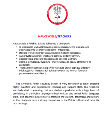 NAUCZYCIELE/TEACHERS Nauczyciele z Polskiej Szkoły Sobotniej z Liverpool: • są doskonale wykwalifikowaną kadrą pedagogiczną posiadającą doświadczenie w pracy z dziećmi i młodzieżą, • stosują w swojej pracy aktywizujące metody nauczania, • wykorzystują szeroki wachlarz pomocy dydaktycznych, • dostosowują program nauczania do potrzeb uczniów • dbają o przyjazną, życzliwą i motywującą do pracy atmosferę na zajęciach, • nieustannie udoskonalają swój warsztat pracy poprzez udział w edukacyjnych warsztatach szkoleniowych lub innych formach podnoszenia kwalifikacji The Liverpool Polish Saturday School is very fortunate to have engaged highly qualified and experienced teaching and support staff. Our teachers are dedicated to ensuring that our students graduate with a high level of proficiency in the Polish language in both written and verbal Polish language skills. The teachers also strive to promote the culture, traditions and history so that students have a strong connection to the Polish culture and value its rich heritage.