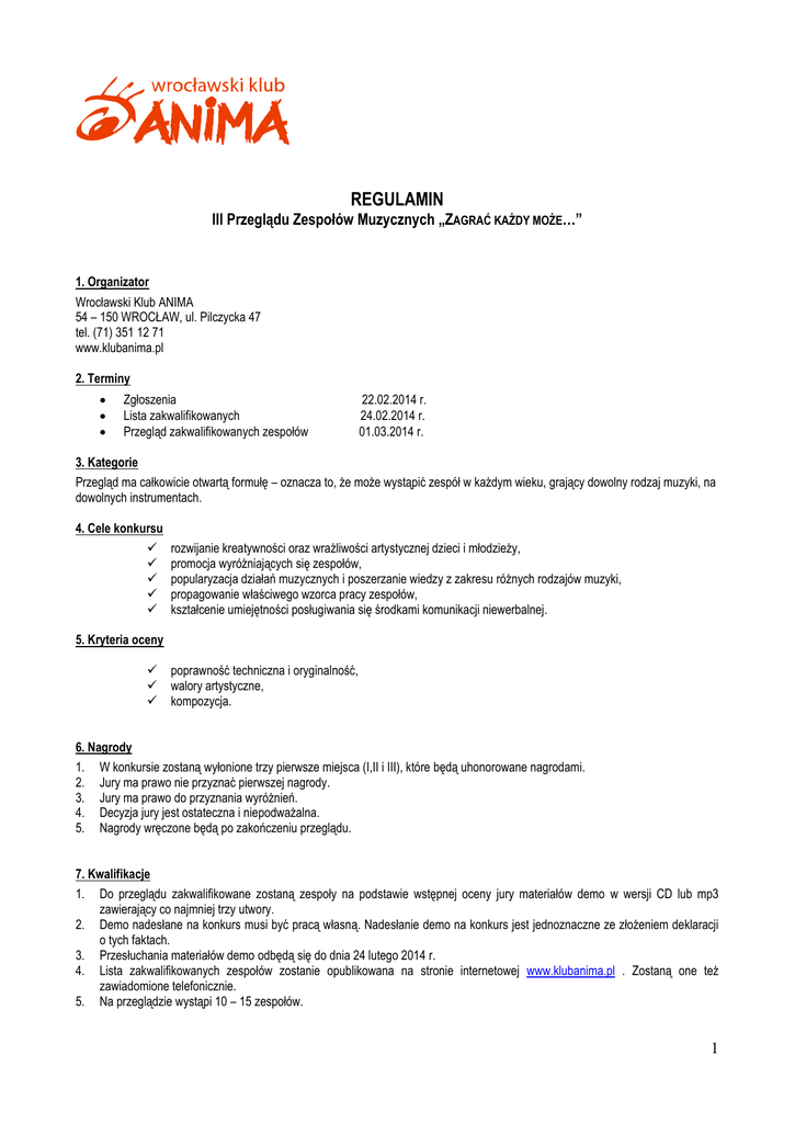 REGULAMIN III Przeglądu Zespołów Muzycznych „ZAGRAĆ KAŻDY MOŻE…” 1. Organizator Wrocławski Klub ANIMA 54 – 150 WROCŁAW, ul. Pilczycka 47 tel. (71) 351 12 71 www.klubanima.pl 2. Terminy Zgłoszenia Lista zakwalifikowanych Przegląd zakwalifikowanych zespołów 22.02.2014 r. 24.02.2014 r. 01.03.2014 r. 3. Kategorie Przegląd ma całkowicie otwartą formułę – oznacza to, że może wystąpić zespół w każdym wieku, grający dowolny rodzaj muzyki, na dowolnych instrumentach. 4. Cele konkursu rozwijanie kreatywności oraz wrażliwości artystycznej dzieci i młodzieży, promocja wyróżniających się zespołów, popularyzacja działań muzycznych i poszerzanie wiedzy z zakresu różnych rodzajów muzyki, propagowanie właściwego wzorca pracy zespołów, kształcenie umiejętności posługiwania się środkami komunikacji niewerbalnej. 5. Kryteria oceny poprawność techniczna i oryginalność, walory artystyczne, kompozycja. 6. Nagrody 1. 2. 3. 4. 5. W konkursie zostaną wyłonione trzy pierwsze miejsca (I,II i III), które będą uhonorowane nagrodami. Jury ma prawo nie przyznać pierwszej nagrody. Jury ma prawo do przyznania wyróżnień. Decyzja jury jest ostateczna i niepodważalna. Nagrody wręczone będą po zakończeniu przeglądu. 7. Kwalifikacje 1. Do przeglądu zakwalifikowane zostaną zespoły na podstawie wstępnej oceny jury materiałów demo w wersji CD lub mp3 zawierający co najmniej trzy utwory. 2. Demo nadesłane na konkurs musi być pracą własną. Nadesłanie demo na konkurs jest jednoznaczne ze złożeniem deklaracji o tych faktach. 3. Przesłuchania materiałów demo odbędą się do dnia 24 lutego 2014 r. 4. Lista zakwalifikowanych zespołów zostanie opublikowana na stronie internetowej www.klubanima.pl . Zostaną one też zawiadomione telefonicznie. 5. Na przeglądzie wystąpi 10 – 15 zespołów. 1 8. Warunki dostarczania materiałów: 1. Materiały demo można przesłać: pocztą elektroniczną na adres: [email protected] pocztą tradycyjną lub dostarczyć osobiście do siedziby Organizatora: Wrocławski Klub ANIMA 54 – 150 WROCŁAW, ul. Pilczycka 47 z dopiskiem II Przegląd Zespołów Muzycznych „ZAGRAĆ KAŻDY MOŻE…” w nieprzekraczalnym terminie do 22.02.2014r. 2. Prace dostarczone po terminie nie będą oceniane. 3. Do pracy musi być dołączona czytelnie wypełniona karta zgłoszenia. 4. Organizator nie ponosi odpowiedzialności za uszkodzenia nadsyłanych prac, powstałe w wyniku transportu pocztowego, stąd zaleca się troskliwe ich opakowanie. 5. Materiały uszkodzone nie będą oceniane. 6. Materiały przesyłane są na koszt i ryzyko własne uczestnika. 7. Prace przesłane na konkurs przechodzą na własność Organizatora i nie podlegają zwrotowi. 8. Warunki uczestnictwa w przeglądzie 1. Zakwalifikowany zespół musi przedstawić materiał zawierający trzy utwory trwające łącznie maksymalnie 25 minut. Maksymalny czas przebywania na scenie to 30 minut (w tym rozłożenie i instalacja sprzętu). Czas i ilość utworów może ulec zmianie. O stosownych zmianach organizator poinformuje w stosownym czasie. 2. Zespoły podczas prezentacji materiału nie mogą używać playback`u. 3. Organizator zapewnia sprzęt nagłośnieniowy, mikrofony, sprzęt odtwarzający, pozostały sprzęt dostarczają zespoły. 4. Organizator umożliwia skorzystanie z keyboard’u i perkusji (w tym przypadku uczestnik zobowiązany jest do przywiezienia własnych talerzy perkusyjnych i werbla). 5. Poziom artystyczny oceniać będzie jury powołane przez Organizatora. 6. Organizator nie ponosi kosztów przejazdu zespołów biorących udział w przeglądzie. 9. Przetwarzanie danych osobowych. 1. Administratorem danych osobowych udostępnianych przez Uczestników jest Wrocławski Klub ANIMA. 2. Dane osobowe przekazane Organizatorowi przez Uczestników niniejszego Konkursu będą przez niego przetwarzane w celu: a) realizacji Konkursu, b) wyłonienia zwycięzców Konkursu, c) doręczenia nagród. 3. Podanie danych osobowych jest dobrowolne, jednak ich nie podanie uniemożliwia udział w Konkursie. Każdy Uczestnik Konkursu posiada prawo wglądu do swoich danych osobowych oraz do ich poprawiania. 4. Uczestnik Konkursu wyraża zgodę na opublikowanie swojego imienia, nazwiska i wizerunku jako uczestnik Konkursu na stronie Organizatora www.klubanima.pl , oraz na fanpage’u Organizatora http://www.facebook.com/WroclawskiKlubAnima Organizator zastrzega sobie prawo do zmian i poprawek w niniejszym regulaminie. W sprawach spornych ostateczna interpretacja regulaminu należy do Organizatora. 2