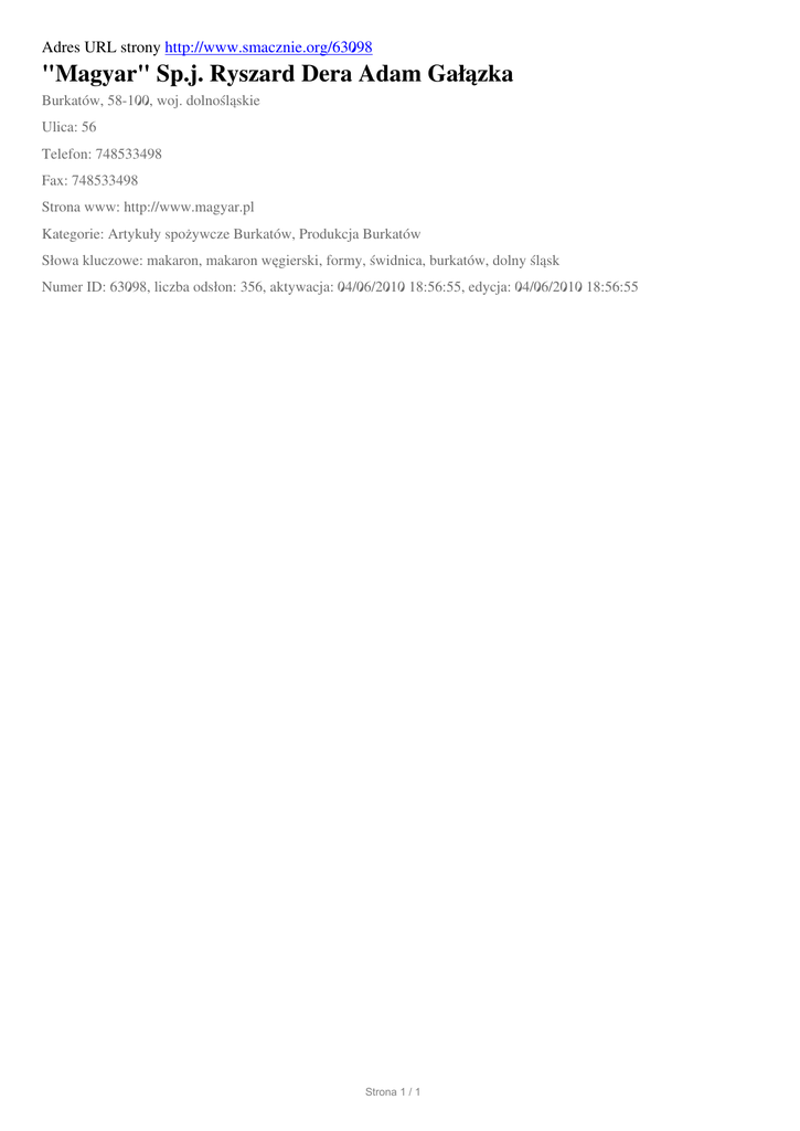 Adres URL strony http://www.smacznie.org/63098 "Magyar" Sp.j. Ryszard Dera Adam Gałązka Burkatów, 58-100, woj. dolnośląskie Ulica: 56 Telefon: 748533498 Fax: 748533498 Strona www: http://www.magyar.pl Kategorie: Artykuły spożywcze Burkatów, Produkcja Burkatów Słowa kluczowe: makaron, makaron węgierski, formy, świdnica, burkatów, dolny śląsk Numer ID: 63098, liczba odsłon: 356, aktywacja: 04/06/2010 18:56:55, edycja: 04/06/2010 18:56:55 Strona 1 / 1
