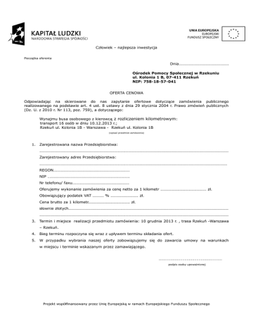 Człowiek – najlepsza inwestycja Pieczątka oferenta Dnia.................................... Ośrodek Pomocy Społecznej w Rzekuniu ul. Kolonia 1 B, 07-411 Rzekuń NIP: 758-18-57-041 OFERTA CENOWA Odpowiadając na skierowane do nas zapytanie ofertowe dotyczące zamówienia publicznego realizowanego na podstawie art. 4 ust. 8 ustawy z dnia 29 stycznia 2004 r. Prawo zmówień publicznych (Dz. U. z 2010 r. Nr 113, poz. 759), a dotyczącego: Wynajmu busa osobowego z kierowcą z rozliczeniem kilometrowym: transport 16 osób w dniu 10.12.2013 r.; Rzekuń ul. Kolonia 1B - Warszawa - Rzekuń ul. Kolonia 1B (wpisać przedmiot zamówienia) 1. Zarejestrowana nazwa Przedsiębiorstwa: ........................................................................................................................................ Zarejestrowany adres Przedsiębiorstwa: ....................................................................................................................................... REGON....................................................... NIP …......................................................... Nr telefonu/ faxu......................................... Oferujemy wykonanie zamówienia za cenę netto za 1 kilometr ................................. zł. Obowiązujący podatek VAT ........ % .................... zł. Cena brutto za 1 kilometr.............................. zł. słownie złotych................................................................................................................... ........................................................................................................................................ 3. Termin i miejsce realizacji przedmiotu zamówienia: 10 grudnia 2013 r. , trasa Rzekuń -Warszawa – Rzekuń. 4. Bieg terminu rozpoczyna się wraz z upływem terminu składania ofert. 5. W przypadku wybrania naszej oferty zobowiązujemy się do zawarcia umowy na warunkach w miejscu i terminie wskazanym przez zamawiającego. ........................................................... podpis osoby upoważnionej Projekt współfinansowany przez Unię Europejską w ramach Europejskiego Funduszu Społecznego