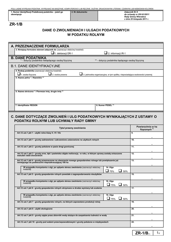 POLA JASNE WYPEŁNIA PODATNIK. WYPEŁNIAĆ NA MASZYNIE, KOMPUTEROWO LUB RĘCZNIE, DUŻYMI, DRUKOWANYMI LITERAMI, CZARNYM LUB NIEBIESKIM KOLOREM. 1. Numer Identyfikacji Podatkowej podatnika – jeżeli go obowiązuje Załącznik Nr 8 do uchwały nr XIV-61/2011 Rady Gminy Wierzbica z dnia 25 listopada 2011 r. 2. Nr dokumentu ZR-1/B DANE O ZWOLNIENIACH I ULGACH PODATKOWYCH W PODATKU ROLNYM A. PRZEZNACZENIE FORMULARZA 3. Niniejszy formularz stanowi załącznik do (zaznaczyć właściwy kwadrat): 1. deklaracji DR-1 B. DANE PODATNIKA * - dotyczy podatnika niebędącego osobą fizyczną 2. informacji IR-1 ** - dotyczy podatnika będącego osobą fizyczną B.1. DANE IDENTYFIKACYJNE 4. Rodzaj podatnika (zaznaczyć właściwy kwadrat): 1. osoba fizyczna 5. Nazwa pełna * / Nazwisko ** 2. osoba prawna 3. jednostka organizacyjna, w tym spółka, nieposiadająca osobowości prawnej 6. Nazwa skrócona * / Pierwsze imię, drugie imię ** 7. Identyfikator REGON 8. Numer PESEL ** C. DANE DOTYCZĄCE ZWOLNIEŃ I ULG PODATKOWYCH WYNIKAJĄCYCH Z USTAWY O PODATKU ROLNYM LUB UCHWAŁY RADY GMINY Powierzchnia w ha fizycznych 1) Tytuł prawny zwolnienia Art.12 ust.1 pkt 1 - użytki rolne klasy V, VI i VIz 9. Art.12 ust.1 pkt 1 - grunty zadrzewione i zakrzewione ustanowione na użytkach rolnych 10. Art.12 ust.1 pkt 2 - grunty położone w pasie drogi granicznej 11. Art.12 ust.1 pkt 3 - grunty orne, łąki i pastwiska objęte melioracją - w roku, w którym uprawy zostały zniszczone wskutek robót drenarskich 12. Art.12 ust.1 pkt 4 - grunty przeznaczone na utworzenie nowego gospodarstwa rolnego lub powiększenie już istniejącego do powierzchni nieprzekraczającej 100 ha 13. , , , W przypadku korzystania z ulgi, po upływie okresu zwolnienia (zaznaczyć właściwy kwadrat) , , 14. Ulga 75% 50% Art.12 ust.1 pkt 5 - grunty gospodarstw rolnych powstałe z zagospodarowania nieużytków 15. , W przypadku korzystania z ulgi, po upływie okresu zwolnienia (zaznaczyć właściwy kwadrat) 16. Ulga 75% 50% Art.12 ust.1 pkt 6 - grunty gospodarstw rolnych otrzymane w drodze wymiany lub scalenia 17. , W przypadku korzystania z ulgi, po upływie okresu zwolnienia (zaznaczyć właściwy kwadrat) 18. Ulga 75% 50% Art.12 ust.1 pkt 7 - grunty gospodarstw rolnych, na których zaprzestano produkcji rolnej 19. Art.12 ust.1 pkt 8 - użytki ekologiczne 20. Art.12 ust.1 pkt 9 - grunty zajęte przez zbiorniki wody służące do zaopatrzenia ludności w wodę 21. Art.12 ust.1 pkt 10 - grunty pod wałami przeciwpowodziowymi i grunty położone w międzywalach 22. , , , , ZR-1/B (1) 1/2 POLA JASNE WYPEŁNIA PODATNIK. WYPEŁNIAĆ NA MASZYNIE, KOMPUTEROWO LUB RĘCZNIE, DUŻYMI, DRUKOWANYMI LITERAMI, CZARNYM LUB NIEBIESKIM KOLOREM. Art.12 ust.1 pkt 11 - grunty wpisane do rejestru zabytków 23. Art.12 ust.1 pkt 12 - grunty stanowiące działki przyzagrodowe członków rolniczych spółdzielni produkcyjnych 24. Art.12 ust.2 pkt 1 - uczelnie 25. Art.12 ust.2 pkt 2 - publiczne i niepubliczne jednostki organizacyjne objęte systemem oświaty oraz prowadzące je organy, w zakresie gruntów zajętych na działalność oświatową 26. Art.12 ust.2 pkt 3 - instytuty naukowe i pomocnicze jednostki naukowe Polskiej Akademii Nauk, w odniesieniu do gruntów, które są niezbędne do realizacji zadań, o których mowa w art. 2 ustawy z dnia 30 kwietnia 2010 r. o Polskiej Akademii Nauk (Dz. U. Nr 96, poz. 619) Art.12 ust.2 pkt 4 - prowadzący zakłady pracy chronionej spełniające warunek, o którym mowa w art. 28 ust. 1 pkt 1 lit. b ustawy z dnia 27 sierpnia 1997 r. o rehabilitacji zawodowej i społecznej oraz zatrudnianiu osób niepełnosprawnych (Dz. U. z 2010 r. Nr 214, poz. 1407, Nr 217, poz. 1427 i Nr 226, poz. 1475), lub zakłady aktywności zawodowej - w zakresie gruntów zgłoszonych wojewodzie, jeżeli zgłoszenie zostało potwierdzone decyzją w sprawie przyznania statusu zakładu pracy chronionej lub zakładu aktywności zawodowej albo zaświadczeniem - zajętych na prowadzenie tego zakładu, z wyjątkiem gruntów znajdujących się w posiadaniu zależnym podmiotów niebędących prowadzącymi zakłady pracy chronionej spełniające warunek, o którym mowa w art. 28 ust. 1 pkt 1 lit. b ustawy z dnia 27 sierpnia 1997 r. o rehabilitacji zawodowej i społecznej oraz zatrudnianiu osób niepełnosprawnych lub zakłady aktywności zawodowej 27. Art.12 ust.2 pkt 5 - instytuty badawcze 29. Art.12 ust.2 pkt 5a - przedsiębiorcy o statusie centrum badawczo-rozwojowego uzyskanym na zasadach określonych w przepisach o niektórych formach wspierania działalności innowacyjnej, w odniesieniu do przedmiotów opodatkowania zajętych na cele prowadzonych badań i prac rozwojowych Art.12 ust.2 pkt 6 - Polski Związek Działkowców z tytułu użytkowania i użytkowania wieczystego gruntu rodzinnych ogrodów działkowych 30. Zwolnienia wprowadzane uchwałami Rady Gminy ........................................... Nr ............................. z dnia .............................. 32. , , , , , 28. , , , 31. , , D. DANE DOTYCZĄCE ULG PODATKOWYCH WYNIKAJĄCYCH Z USTAWY O PODATKU ROLNYM Tytuł prawny ulgi Art.13 ust.1 - ulga inwestycyjna 33. Art.13a ust.1 i 2 - ulga dla żołnierzy odbywających zasadniczą służbę wojskową lub długotrwałe przeszkolenie wojskowe, osób spełniających zastępczo obowiązek służby wojskowej w formie skoszarowanej i prowadzących te gospodarstwa bezpośrednio przed powołaniem do służby oraz członków rodzin tych osób (zaznaczyć właściwy kwadrat) 34. Ulga Art.13b ust.1 - ulga dla gruntów położonych na terenach podgórskich i górskich (zaznaczyć właściwy kwadrat) 35. Ulga Art.13b ust.1 - ulga z tytułu wystąpienia klęski żywiołowej 326. tak nie 60% 40% 60% 30% 1) Należy podać z dokładnością do czterech miejsc po przecinku. ZR-1/B (1) 2/2 tak nie