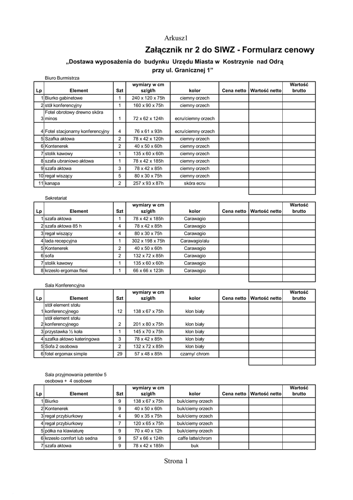 Arkusz1 Załącznik nr 2 do SIWZ - Formularz cenowy „Dostawa wyposażenia do budynku Urzędu Miasta w Kostrzynie nad Odrą przy ul. Granicznej 1” Biuro Burmistrza Szt wymiary w cm sz/gł/h kolor 1 Biurko gabinetowe 1 240 x 120 x 75h ciemny orzech 2 stół konferencyjny Fotel obrotowy drewno skóra 3 minos 1 160 x 90 x 75h ciemny orzech 1 72 x 62 x 124h ecru/ciemny orzech 4 Fotel stacjonarny konferencyjny 4 76 x 61 x 93h ecru/ciemny orzech 5 Szafka aktowa 2 78 x 42 x 120h ciemny orzech 6 Kontenerek 2 40 x 50 x 60h ciemny orzech 7 stolik kawowy 1 135 x 60 x 60h ciemny orzech 8 szafa ubraniowo aktowa 1 78 x 42 x 185h ciemny orzech 9 szafa aktowa 3 78 x 42 x 85h ciemny orzech 10 regał wiszący 5 80 x 30 x 75h ciemny orzech 11 kanapa 2 257 x 93 x 87h skóra ecru Szt wymiary w cm sz/gł/h kolor 1 szafa aktowa 1 78 x 42 x 185h Carawagio 2 szafa aktowa 85 h 4 78 x 42 x 85h Carawagio 3 regał wiszący 4 80 x 30 x 75h Carawagio 4 lada recepcyjna 1 302 x 198 x 75h Carawagio/alu 5 Kontenerek 2 40 x 50 x 60h Carawagio 6 sofa 2 132 x 72 x 85h Carawagio 7 stolik kawowy 1 135 x 60 x 60h Carawagio 8 krzesło ergomax flexi 1 66 x 66 x 123h Carawagio Szt wymiary w cm sz/gł/h kolor 12 138 x 67 x 75h klon biały Lp Element Cena netto Wartość netto Wartość brutto Cena netto Wartość netto Wartość brutto Cena netto Wartość netto Wartość brutto Cena netto Wartość netto Wartość brutto Sekretariat Lp Element Sala Konferencyjna Lp Element stół element stołu 1 konferencyjnego stół element stołu 2 konferencyjnego 2 201 x 80 x 75h klon biały 3 przystawka ½ koła 1 145 x 70 x 75h klon biały 4 szafka aktowo kateringowa 3 78 x 42 x 85h klon biały 5 Sofa 2 osobowa 2 132 x 72 x 85h klon biały 6 fotel ergomax simple 29 57 x 48 x 85h czarny/ chrom Szt wymiary w cm sz/gł/h kolor 1 Biurko 9 138 x 67 x 75h buk/ciemy orzech 2 Kontenerek 9 40 x 50 x 60h buk/ciemy orzech 3 regał przybiurkowy 4 90 x 35 x 75h buk/ciemy orzech 4 regał przybiurkowy 7 120 x 65 x 75h buk/ciemy orzech 5 półka na klawiaturę 9 70 x 40 x 12h buk/ciemy orzech Sala przyjmowania petentów 5 osobowa + 4 osobowe Lp Element 6 krzesło comfort lub sedna 9 57 x 66 x 124h caffe latte/chrom 7 szafa aktowa 9 78 x 42 x 185h buk Strona 1 Arkusz1 Pomieszczenia biurowe II piętro 6 pomieszczeń Szt wymiary w cm sz/gł/h kolor 1 Biurko 6 138 x 67 x 75h Carawagio/alu 2 Kontenerek 7 40 x 50 x 60h Carawagio 3 Przystawka 135' 5 120 x 70 x 75h Carawagio/alu 4 półka na klawiaturę 6 70 x 40 x 12h Carawagio/alu 5 regał przybiurkowy 6 90 x 35 x 75h Carawagio 6 regał wiszący 4 80 x 30 x 75h Carawagio 7 szafa aktowa 23 78 x 42 x 185h Carawagio 8 regał ¼ koła 185 5 40 x 40 x 185h Carawagio 9 szafka 85h 8 78 x 42 x 85h Carawagio 10 stół konferencyjny 3 120 x 80 x 75h Carawagio/alu 11 przystawka konferencyjna 1 260 x 80 x 75h Carawagio/alu 12 krzesło comfort lub sedna 8 57 x 66 x 124h caffe latte/chrom 13 krzesło iso 18 52 x 49 x 82h caffe latte/alu Szt wymiary w cm sz/gł/h kolor 1 szafka kuchenna 2 80 x 56 x 82h buk 2 szafka wisząca 4 80 x 32 x 72h buk 3 szafka wisząca z ociekaczem 1 80 x 32 x 72h buk 4 szafka zlewozmywakowa 1 80 x 56 x 82h buk 5 lodówka 1 60 x 60 x 82h biały lakier 6 zmywarka 1 50 x 55 x 82h biały lakier 7 blat kuchenny 1 320 x 60 x 3,8h buk 8 stolik socjalny 2 70 x 70 x 75 buk / alu 9 krzesło iso 8 52 x 49 x 82h plastik/alu Szt wymiary w cm sz/gł/h kolor 1 szafka kuchenna 1 80 x 56 x 82h buk 2 szafka wisząca 2 80 x 32 x 72h buk 3 szafka wisząca z ociekaczem 1 80 x 32 x 72h buk 4 szafka zlewozmywakowa 1 80 x 56 x 82h buk 5 lodówka 1 60 x 60 x 82h biały lakier 6 zlewozmywak 2 72 x 50 biały lakier 7 blat kuchenny 1 320 x 60 x 3,8h buk 8 stolik socjalny 1 70 x 70 x 75 buk / alu 9 krzesło iso 4 52 x 49 x 82h plastik/alu Szt wymiary w cm sz/gł/h kolor 1 Sofa 2 osobowa 2 132 x 72 x 85h klon biały 2 kącik zabaw dla dzieci (komplet) 1 Lp Element Cena netto Wartość netto Wartość brutto Cena netto Wartość netto Wartość brutto Cena netto Wartość netto Wartość brutto Cena netto Wartość netto Wartość brutto Pomieszczenie socjane II piętro Lp Element 10 Pomieszczenie socjane I piętro Lp Element Uzupełnienie Lp Element kolorowy Strona 2 Arkusz1 suma …...................................................................... Wykonawca lub upełnomocniony przedstawiciel Wykonawcy Strona 3