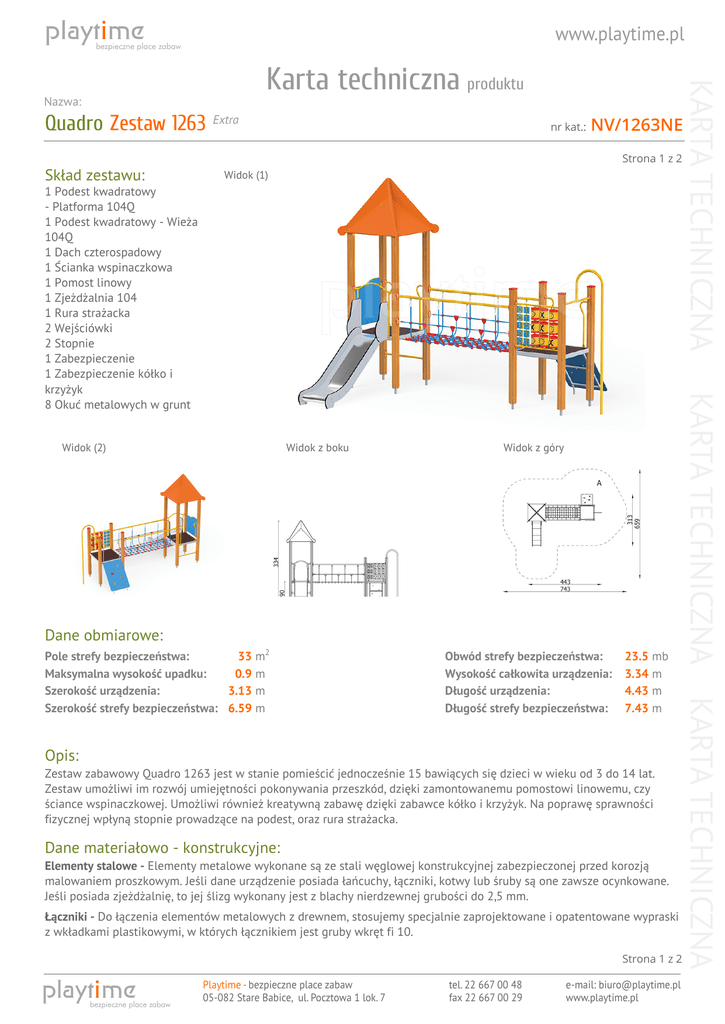 playtime www.playtime.pl bezpieczne place zabaw Quadro Zestaw 1263 Extra nr kat.: NV/1263NE Strona 1 z 2 Skład zestawu: Widok (1) Widok (2) Widok z boku Widok z góry Dane obmiarowe: Obwód strefy bezpieczeństwa: Wysokość całkowita urządzenia: Długość urządzenia: Długość strefy bezpieczeństwa: 23.5 mb 3.34 m 4.43 m 7.43 m Opis: Zestaw zabawowy Quadro 1263 jest w stanie pomieścić jednocześnie 15 bawiących się dzieci w wieku od 3 do 14 lat. Zestaw umożliwi im rozwój umiejętności pokonywania przeszkód, dzięki zamontowanemu pomostowi linowemu, czy ściance wspinaczkowej. Umożliwi również kreatywną zabawę dzięki zabawce kółko i krzyżyk. Na poprawę sprawności fizycznej wpłyną stopnie prowadzące na podest, oraz rura strażacka. Dane materiałowo - konstrukcyjne: Elementy stalowe - Elementy metalowe wykonane są ze stali węglowej konstrukcyjnej zabezpieczonej przed korozją malowaniem proszkowym. Jeśli dane urządzenie posiada łańcuchy, łączniki, kotwy lub śruby są one zawsze ocynkowane. Jeśli posiada zjeżdżalnię, to jej ślizg wykonany jest z blachy nierdzewnej grubości do 2,5 mm. Łączniki - Do łączenia elementów metalowych z drewnem, stosujemy specjalnie zaprojektowane i opatentowane wypraski z wkładkami plastikowymi, w których łącznikiem jest gruby wkręt fi 10. Strona 1 z 2 playtime bezpieczne place zabaw Playtime - bezpieczne place zabaw 05-082 Stare Babice, ul. Pocztowa 1 lok. 7 tel. 22 667 00 48 fax 22 667 00 29 e-mail: [email protected] www.playtime.pl KARTA TECHNICZNA Pole strefy bezpieczeństwa: 33 m2 Maksymalna wysokość upadku: 0.9 m Szerokość urządzenia: 3.13 m Szerokość strefy bezpieczeństwa: 6.59 m KARTA TECHNICZNA 1 Podest kwadratowy - Platforma 104Q 1 Podest kwadratowy - Wieża 104Q 1 Dach czterospadowy 1 Ścianka wspinaczkowa 1 Pomost linowy 1 Zjeżdżalnia 104 1 Rura strażacka 2 Wejściówki 2 Stopnie 1 Zabezpieczenie 1 Zabezpieczenie kółko i krzyżyk 8 Okuć metalowych w grunt KARTA TECHNICZNA Karta techniczna produktu Nazwa: playtime www.playtime.pl bezpieczne place zabaw Quadro Zestaw 1263 Extra nr kat.: NV/1263NE Strona 2 z 2 Kotwy - Elementy konstrukcyjne urządzeń (słupy) osadzone w gruncie za pośrednictwem metalowych kotew przytwierdzonych do betonowych bloczków. Zabieg ten powoduje odizolowanie drewna od gruntu na ok. 10 cm, co znacznie przedłuża żywotność drewna. Wypełnienia (zabezpieczenia) sklejkowe - Elementy takie jak dachy, zabezpieczenia, ścianki, wypełnienia lub inne elementy urządzenia w postaci płyt wykonane są ze sklejki wodoodpornej, liściastej o wysokiej wytrzymałości, laminowanej filmem melaminowym i malowanej na eliptycznych krawędziach farbami na bazie naturalnych wosków. Liny - Liny polipropylenowe na oplocie stalowym o średnicy 16-18 mm połączone ze sobą przy pomocy łączników aluminiowych oraz z tworzywa sztucznego. Drewno klejone - Drewno klejone z 5 warstw, wzdłużnie ryflowane, o przekroju kwadratowym 90 x 90 mm. Impregnowane malowaniem powierzchniowym nietoksycznymi środkami ochronnymi. Belki konstrukcyjne osłonięte kapturkami z tworzywa sztucznego. KARTA TECHNICZNA Karta techniczna produktu Nazwa: KARTA TECHNICZNA playtime bezpieczne place zabaw Powered by TCPDF (www.tcpdf.org) Playtime - bezpieczne place zabaw 05-082 Stare Babice, ul. Pocztowa 1 lok. 7 tel. 22 667 00 48 fax 22 667 00 29 e-mail: [email protected] www.playtime.pl KARTA TECHNICZNA Strona 2 z 2