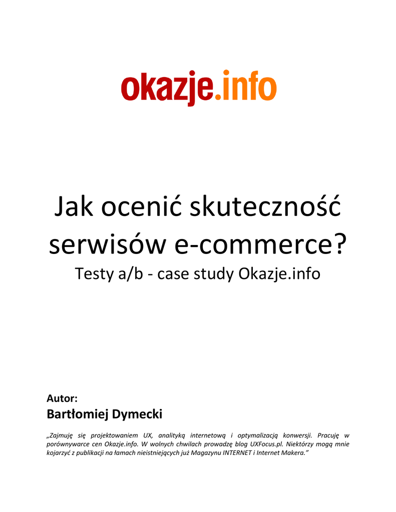 Jak ocenić skuteczność serwisów e-commerce? Testy a/b - case study Okazje.info Autor: Bartłomiej Dymecki „Zajmuję się projektowaniem UX, analityką internetową i optymalizacją konwersji. Pracuję w porównywarce cen Okazje.info. W wolnych chwilach prowadzę blog UXFocus.pl. Niektórzy mogą mnie kojarzyd z publikacji na łamach nieistniejących już Magazynu INTERNET i Internet Makera.” Odpowiedź na pytanie: jak ocenić skuteczność serwisów e-commerce? można zawrzeć w jednym zdaniu: na przykład, stosując testy a/b. Sprawdziły się w porównywarce cen Okazje.info, stając się podstawowym narzędziem oceniającym skuteczność realizowanych projektów. Udział w testach bierze każdorazowo do miliona użytkowników. Na czym polegają testy a/b? Jeśli serwis e-commerce’owy ma rozbudowaną strukturę, warto opracować autorski mechanizm testów. Taki cel postawiła sobie Grupa Okazje, myśląc o wersji dla swojej porównywarki cen. Było to o tyle istotne, że ze względu na wprowadzenie dodatkowego systemu wydłużyłby się czas ładowania strony. Ponadto zastosowanie własnej technologii znacznie ułatwiło przeprowadzenie integracji z systemami wewnętrznymi. W przypadku Okazje.info zintegrowaliśmy narzędzie z Google Analytics dzięki użyciu zmiennych niestandardowych (kod _setCustomVar). W Universal Analytics zastąpiony został przez tzw. custom metrics. To tu można zapisać unikalny numer testu i informację o wersji strony, którą widzi użytkownik. Te same dane zapisują się w pliku cookie. Gdy użytkownik powraca na stronę w trakcie testów, widzi tę samą wersję - odczytaną z ciastka. Rozpoznawanie zmiennych w Analytics’ie wygląda tak: W teście 5EA9 wyniki wskazują na 900 tysięcy odwiedzin z wyraźnym podziałem na dwie grupy użytkowników. Co konkretnie dają testy a/b? Doświadczenie, które zdobyła Grupa Okazje, pokazuje, że bez udziału testów a/b ocena efektywności jest nie tylko bardzo trudna, czasem wręcz niemożliwa, ale i podatna na błędy. Mimo że ich wdrożenie jest czasochłonne, takie testy stanowią ważny element optymalizacji działań serwisu. Dają również jednoznaczną ocenę danego projektu, uwzględniając m.in. poziom konwersji czy przychodu. Ponadto, testy zapewniają minimalizowanie wpływu czynników zewnętrznych. Często są nimi, na przykład, pogoda, święta, wolne od pracy dni albo sezonowość ruchu i konwersji dla różnych kategorii produktowych. Należy pamiętać też o zmianach w ruchu, które są wynikiem wahania jego źródeł, ich efektywności, startujących kampanii, zmian w ruchu organicznym. A to tylko kropla w morzu. Nieuniknione są także problemy w postaci awarii czy błędów. Wliczyć do tego trzeba wydłużenie czasu wczytywania strony, które może zniweczyć efekty nawet najlepszego projektu. Jak to działa w e-sklepach? Co istotne, poziomy konwersji i innych parametrów nie są z zasady stałe. Przykładem niech będzie sklep internetowy mający współczynnik konwersji w miesiącu średnio na poziomie 2%. Dziennie lub tygodniowo może odnotować duże wahania, ale wzrost lub spadek skuteczności wcale nie musi wynikać z tych zmian. Dopiero porównanie obu wersji: A i B w jednym czasie, gdy poddane są tym samym czynnikom zewnętrznym przyniesie wiarygodne informacje. Zobaczmy, jak przedstawia się tabela z danymi tygodniowymi o konwersji dla danego sklepu internetowego. Choć dane są hipotetyczne, odzwierciedlają możliwą sytuację. Zamówienia % konwersji 5000 100 2% 5500 108 1,96% 6000 145 2,42% 5800 110 1,9% 5300 90 1,7% 6000 92 1,53% 5700 105 1,84% Unikalni Użytkownicy To zestawienie na pierwszy rzut oka wskazuje spadek konwersji, który można byłoby usprawiedliwiać właśnie wprowadzonymi zmianami. Jednak, gdy przyjrzymy się danym z podziałem na wersje A i B dla testu przeprowadzonego w tym samym czasie, możemy wyciągnąć kilka ciekawych wniosków. Użytkownicy wersja Zamówienia % konwersji Użytkownicy Zamówienia wersja % konwersji wersja A wersja A wersja A wersja B B B 2500 55 2,2% 2500 45 1,8% 2750 51 1,85% 2750 57 2,07% 3000 64 2,13% 3000 81 2,70% 2900 48 1,66% 2900 62 2,14% 2650 41 1,55% 2650 49 1,85% 3000 43 1,43% 3000 49 1,63% 2850 47 1,65% 2850 58 2,04% Średnia konwersja tygodniowa dla wersji A: 1,78% Średnia konwersja tygodniowa dla wersji B: 2,03% Różnica B do A w punktach procentowych: 0,25 pkt. proc. Różnica B do A w procentach: 14,07% Dane wskazują, że: a) różnica konwersji przedstawiona w punktach procentowych może być niewielka, natomiast wersja B zwiększyła skuteczność strony aż o 14%! To istotna zmiana, zwłaszcza gdy uświadomimy sobie, że znaczy to o 14% więcej zamówień. b) dzienne wahanie konwersji w sklepie wynosi od 1,53% do 2,42%, choć nie jest to wcale najwyższe z możliwych. Przy takich wahaniach próba oceny skuteczności zmian bez testu a/b mogłaby być wątpliwa. Ponadto takie dane trzeba analizować z dłuższej perspektywy czasu. c) spadek skuteczność serwisu ujawnił się w ostatnich dniach. Choć widzimy to w jednej i drugiej wersji, widoczna jest przewaga wersji B. Stąd można byłoby wyciągnąć błędny wniosek, że to właśnie ona działa na niekorzyść serwisu. Segmentacja statystyk to kolejny krok, po którym należało by sprawdzić zależność konwersji np. od źródeł ruchu, stron docelowych, konkretnych kampanii albo kategorii produktowych. Te działania dadzą podstawę do analizy i następnych testów. Jak sprawdzić wiarygodność wyników? Istotność statystyczna na ratunek Czy wyniki, które widzimy w teście na pewno są dowodem na to, że dana wersja działa lepiej? Jest to problem, z którym od dawna borykają się np. koncerny farmaceutyczne testujące nowe leki. Z pomocą przychodzi istotność statystyczna. Wyliczona ze wzoru P-wartość mówi nam, czy wyniki, które obserwujemy, miałyby również szansę pojawić się przypadkowo, gdy test nie był aktualnie prowadzony