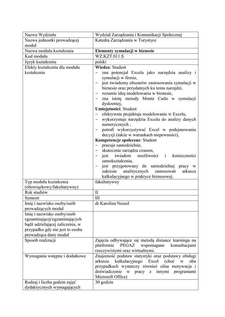 Nazwa Wydziału Nazwa jednostki prowadzącej moduł Nazwa modułu kształcenia Kod modułu Język kształcenia Efekty kształcenia dla modułu kształcenia Typ modułu kształcenia (obowiązkowy/fakultatywny) Rok studiów Semestr Imię i nazwisko osoby/osób prowadzących moduł Imię i nazwisko osoby/osób egzaminującej/egzaminujących bądź udzielającej zaliczenia, w przypadku gdy nie jest to osoba prowadząca dany moduł Sposób realizacji Wymagania wstępne i dodatkowe Rodzaj i liczba godzin zajęć dydaktycznych wymagających Wydział Zarządzania i Komunikacji Społecznej Katedra Zarządzania w Turystyce Elementy symulacji w biznesie WZ.KZT.011.S polski Wiedza: Student - zna potencjał Excela jako narzędzia analizy i symulacji w firmie, - jest świadomy obszarów zastosowania symulacji w biznesie oraz przydatnych ku temu narzędzi. - rozumie ideę modelowania w biznesie, - zna istotę metody Monte Carlo w symulacji dyskretnej, Umiejętności: Student - efektywnie projektuje modelowanie w Excelu, - wykorzystuje narzędzia Excela do analizy danych numerycznych , - potrafi wykorzystywać Excel w podejmowaniu decyzji (także w warunkach niepewności), Kompetencje społeczne: Student - pracuje samodzielnie, - skutecznie zarządza czasem, - jest świadom możliwości i konieczności samokształcenia, - jest przygotowany do samodzielnej pracy w zakresie analitycznych zastosowań arkusza kalkulacyjnego w praktyce biznesowej. fakultatywny II III dr Karolina Nessel Zajęcia odbywające się metodą distance learningu na platformie PEGAZ wspomagane konsultacjami rzeczywistymi oraz wirtualnymi. Znajomość podstaw statystyki oraz podstawy obsługi arkusza kalkulacyjnego Excel (choć w obu przypadkach wystarczy również silna motywacja i doświadczenie w pracy z innymi programami Microsoft Office) 30 godzin bezpośredniego udziału nauczyciela akademickiego i studentów, gdy w danym module przewidziane są takie zajęcia Liczba punktów ECTS przypisana modułowi Bilans punktów ECTS Stosowane metody dydaktyczne Metody sprawdzania i kryteria oceny efektów kształcenia uzyskanych przez studentów Forma i warunki zaliczenia modułu, w tym zasady dopuszczenia do egzaminu, zaliczenia, a także forma i warunki zaliczenia poszczególnych zajęć wchodzących w zakres danego modułu 3 - kurs e-learningowy: 30 godzin - ćwiczenia indywidualne związane z kursem: 25 godzin - przygotowanie projektu: 10 godzin - konsultacje wirtualne: 6 godzin - konsultacje w czasie dyżurów: 4 godziny Łącznie 75 godzin pracy, co odpowiada 3 pkt ECTS. e-learning, metoda projektu - monitorowanie postępów: poprzez kontrolę realizacji zadań umieszczonych w kursie, forum dyskusyjne, konsultacje w czasie dyżurów oraz poprzez forum, - sprawdzenie efektów: realizacja zadań w kursie oraz projektu końcowego. W czasie semestru obowiązkowe bądź fakultatywne będą aktywności różnego typu: testy, ćwiczenia sprawdzające, wpisy na forum, stworzenie tutorialu video oraz projekt końcowy. Większość z nich będzie związana z konkretnym modułem i konieczna do zaliczenia danego modułu. Punktowane będą: projekt końcowy - 30 pkt zadania cząstkowe - 20 pkt systematyczność - 30 pkt Projekt końcowy: - praktyczna realizacja i analiza samodzielnej symulacji, - w postaci pliku Excela, - konieczność uzyskania przynajmniej 50% pkt, Zadania cząstkowe: - pojawią się w kursie, w czasie semestru - konieczność uzyskania przynajmniej 50% pkt, Systematyczność: - Oczekiwana jest systematyczna praca -dlatego też ukończenie każdego z modułów w podanym cotygodniowym terminie zapewni 2 pkt, co oznacza możliwość zdobycia 30 pkt w ramach kursu na Pegazie (ukończenie po terminie danego modułu daje 0 punktów, ale jest konieczne do zaliczenia przedmiotu) ocena końcowa: - maksymalnie 80 pkt Treści modułu kształcenia 0-39 =ndst 40-47 = dst 48-55 = dst+ 56-63 = db 64-71 = db+ 72 i więcej = bdb Przedmiot ukazuje wybrane praktyczne zastosowania programu Excel w zarządzaniu firmą. Obok kwestii technicznych użytkowania Excela (część pierwsza kursu), przedstawia możliwości różnorakich analiz (np. wyników finansowych firmy - część druga), kwestie związane z gromadzeniem i analizą dużej ilości danych (część trzecia), badaniem zależności między danymi (część czwarta), podstawy prognozowania krótkookresowego (część piąta) oraz zagadnienia związane z podejmowaniem decyzji w warunkach niepewności (część szósta). Kurs jest zorientowany przede wszystkim na praktykę, teoria statystyczna czy ekonometryczna ograniczona jest do minimum. Celem kursu jest bowiem wyćwiczenie praktycznych umiejętności korzystania z potencjału Excela. Kurs ma formę e-learingu, w którym regularnie pojawiają się kolejne moduły składające się w dużej mierze z tutoriali video oraz zadań do samodzielnego wykonania. Problemy i wątpliwości będzie można wyjaśnić poprzez forum kursu, konsultacje wirtualne tudzież konsultacje w czasie dyżuru wykładowcy. Plan zajęć: Modelowanie jako sposób rozwiązywania problemów biznesowych Podstawy Excela (konfiguracja, nawigacja, wprowadzanie danych, formatowanie, podstawowe funkcje) Prezentacja danych w biznesie (wykresy wszelakie) Zaawansowane wykorzystanie Excela (m.in. funkcje zawansowane, parametryzacja, VBA, makra) Organizacja pracy w Excelu (projektowanie, budowanie oraz testowanie arkusza i skoroszytu pod względem funkcjonalności, spójności i komunikacji) Możliwości analizy przy pomocy Excela (analiza podstawowa, what-if, benchmarking, scenariusze, wrażliwość na parametry, próg rentowności, optymizacja, symulacja) Analiza danych w modelowaniu (przeszukiwanie, sortowanie, analiza prób) Analiza zależności (regresja prosta, liniowa i nieliniowa) Wykaz literatury podstawowej i uzupełniającej, obowiązującej do zaliczenia danego modułu Prognozowanie (modele ze średnią, wykładnicze) Decyzje w warunkach niepewności (drzewa decyzyjne