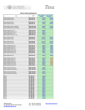 WIRA tel: 600 981 648 tel: 530 763 656 Oferta kratek podłogowych Opis TYP Cena aktualna (zwykła) Cena aktualna (stropowa) Kratka kwadratowa dolna KRD-250-110 771 zł 1 054 zł Kratka kwadratowa boczna KRB-250-110 829 zł 1 112 zł Kratka kwadratowa dolna KRD-200-110 726 zł 979 zł Kratka kwadratowa boczna KRB-200-110 792 zł 1 045 zł Kratka kwadratowa dolna, antyzapach KRD-200-110an 880 zł 1 133 zł Kratka kwadratowa boczna, antyzapach KRB-200-110an 946 zł 1 199 zł Kratka okrągła dolna st. Typ KSDO-240-110 648 zł Kratka kwadratowa dolna st. Typ KSDK-220-110 671 zł Kratka okragła boczna st. Typ KSBO-240-110 706 zł Kratka kwadratowa boczna st. Typ KSBK-220-110 729 zł Kratka kwadratowa dolna KRD-300-160 1 077 zł 1 315 zł Katka kwadratowa boczna KRB-300-160 1 183 zł 1 447 zł Kratka kwadratowa dolna KRD-400-200 1 412 zł 2 123 zł Katka kwadratowa boczna KRB-400-200 1 518 zł 2 332 zł Kratka kwadratowa dolna mini KSD-200-110 400 zł 648 zł Kratka kwadratowa dolna mini KSD-200-075 400 zł 648 zł Kratka kwadratowa dolna mini KSD-200-050 400 zł 648 zł Kratka kwadratowa boczna mini KSB-200-110 430 zł 677 zł Kratka kwadratowa boczna mini KSB-200-075 430 zł 677 zł Kratka kwadratowa boczna mini KSB-200-050 430 zł 677 zł Kratka okrągła dolna mini OSD-200-110 444 zł 692 zł Kratka kwadratowa dolna mini KSD-150-110 276 zł 524 zł Kratka kwadratowa dolna mini KSD-150-075 276 zł 524 zł Kratka kwadratowa dolna mini KSD-150-050 276 zł 524 zł Kratka kwadratowa boczna mini KSB-150-110 306 zł 553 zł Kratka kwadratowa boczna mini KSB-150-075 306 zł 553 zł Kratka kwadratowa boczna mini KSB-150-050 306 zł 553 zł Kratka kwaratowa dolna płytka KSDP-150-050 259 zł Kratka kwadratowa boczna płytka KSBP-150-050 283 zł Kratka kwaratowa dolna płytka KSDE-150-050 295 zł Kratka kwadratowa boczna płytka KSBE-150-050 318 zł Rewizja RC-150-110 276 zł Rewizja RC-200-160 359 zł Rewizja RC-250-160 406 zł Rewizja RC-250-200 453 zł Rewizja RC-300-110 406 zł Rewizja RC-300-160 453 zł Rewizja RC-300-200 501 zł Rewizja RC-350-110 453 zł Rewizja RC-350-160 501 zł Rewizja RC-350-200 548 zł Rewizja RC-350-250 595 zł Rewizja RC-400-110 548 zł Rewizja RC-400-160 595 zł Rewizja RC-400-200 642 zł Rewizja RC-400-250 690 zł Rewizja RC-400-300 737 zł Rewizja RC-400-350 784 zł WIRA Brzozów tel: 600 981 648 lub 530 763 656 [email protected] tel: +48 13 43 403 05 fax: +48 13 43 403 05 www.kratkisciekowe.pl