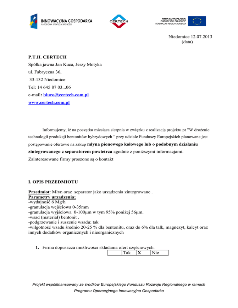 Niedomice 12.07.2013 (data) P.T.H. CERTECH Spółka jawna Jan Kuca, Jerzy Motyka ul. Fabryczna 36, 33-132 Niedomice Tel: 14 645 87 03...06 e-mail: [email protected] www.certech.com.pl Informujemy, iż na początku miesiąca sierpnia w związku z realizacją projektu pt ”W drożenie technologii produkcji bentonitów hybrydowych “ przy udziale Funduszy Europejskich planowane jest postępowanie ofertowe na zakup młyna pionowego kołowego lub o podobnym działaniu zintegrowanego z separatorem powietrza zgodnie z poniższymi informacjami. Zainteresowane firmy proszone są o kontakt I. OPIS PRZEDMIOTU Przedmiot: Młyn oraz separator jako urządzenia zintegrowane . Parametry urządzenia; -wydajność 6 Mg/h -granulacja wejściowa 0-35mm -granulacja wyjściowa 0-100μm w tym 95% poniżej 56μm. -wsad (materiał) bentonit . -podgrzewanie i suszenie wsadu; tak -wilgotność wsadu średnio 20-25 % dla bentonitu, oraz do 6% dla talk, magnezyt, kalcyt oraz innych dodatków organicznych i nieorganicznych 1. Firma dopuszcza możliwości składania ofert częściowych. Tak X Nie Projekt współfinansowany ze środków Europejskiego Funduszu Rozwoju Regionalnego w ramach Programu Operacyjnego Innowacyjna Gospodarka II KRYTERIA OCENY Ocena dokonywana będzie według następujących kryteriów i przypisanej im wadze: 1. Funkcjonalność urządzenia oceniania na podstawie prób technologicznych przeprowadzanych u producenta w obecności przedstawiciela naszej Firmy – 40% 2. Cena- 30% 3. Doświadczenie wykonawcy (oceniane m.in. na podstawie dołączonych do oferty referencji)- 10% 4. Warunki serwisu i gwarancji – 10% 5. Optymalność rozwiązania technologicznych w warunkach zakładu -10% Oferta, która otrzyma największą ilość punktów zostanie wybrana jako najkorzystniejsza. Ocenie nie będą podlegać oferty złożone po terminie Ofertę można złożyć wyłącznie raz. III. DODATKOWE INFORMACJE Dodatkowych informacji udziela: Ewelina Załęska pod numerem telefonu +48 14 645 87 03 oraz adresem email: [email protected] Paweł Motyka pod numerem telefonu +48 14 645 87 03 oraz adresem email: [email protected] Z poważaniem Jerzy Motyka Projekt współfinansowany ze środków Europejskiego Funduszu Rozwoju Regionalnego w ramach Programu Operacyjnego Innowacyjna Gospodarka