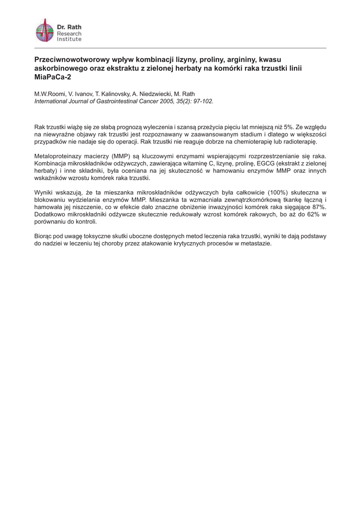 Przeciwnowotworowy wpływ kombinacji lizyny, proliny, argininy, kwasu askorbinowego oraz ekstraktu z zielonej herbaty na komórki raka trzustki linii MiaPaCa-2 M.W.Roomi, V. Ivanov, T. Kalinovsky, A. Niedzwiecki, M. Rath International Journal of Gastrointestinal Cancer 2005, 35(2): 97-102. Rak trzustki wiążę się ze słabą prognozą wyleczenia i szansą przeżycia pięciu lat mniejszą niż 5%. Ze względu na niewyraźne objawy rak trzustki jest rozpoznawany w zaawansowanym stadium i dlatego w większości przypadków nie nadaje się do operacji. Rak trzustki nie reaguje dobrze na chemioterapię lub radioterapię. Metaloproteinazy macierzy (MMP) są kluczowymi enzymami wspierającymi rozprzestrzenianie się raka. Kombinacja mikroskładników odżywczych, zawierająca witaminę C, lizynę, prolinę, EGCG (ekstrakt z zielonej herbaty) i inne składniki, była oceniana na jej skuteczność w hamowaniu enzymów MMP oraz innych wskaźników wzrostu komórek raka trzustki. Wyniki wskazują, że ta mieszanka mikroskładników odżywczych była całkowicie (100%) skuteczna w blokowaniu wydzielania enzymów MMP. Mieszanka ta wzmacniała zewnątrzkomórkową tkankę łączną i hamowała jej niszczenie, co w efekcie dało znaczne obniżenie inwazyjności komórek raka sięgające 87%. Dodatkowo mikroskładniki odżywcze skutecznie redukowały wzrost komórek rakowych, bo aż do 62% w porównaniu do kontroli. Biorąc pod uwagę toksyczne skutki uboczne dostępnych metod leczenia raka trzustki, wyniki te dają podstawy do nadziei w leczeniu tej choroby przez atakowanie krytycznych procesów w metastazie.