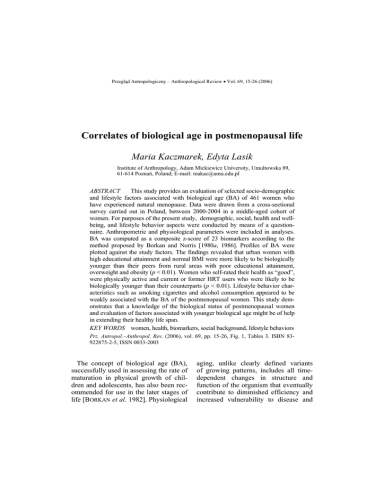 Przegląd Antropologiczny – Anthropological Review • Vol. 69, 15-26 (2006) Correlates of biological age in postmenopausal life Maria Kaczmarek, Edyta Lasik Institute of Anthropology, Adam Mickiewicz University, Umultowska 89, 61-614 Poznań, Poland; E-mail: [email protected] ABSTRACT This study provides an evaluation of selected socio-demographic and lifestyle factors associated with biological age (BA) of 461 women who have experienced natural menopause. Data were drawn from a cross-sectional survey carried out in Poland, between 2000-2004 in a middle-aged cohort of women. For purposes of the present study, demographic, social, health and wellbeing, and lifestyle behavior aspects were conducted by means of a questionnaire. Anthropometric and physiological parameters were included in analyses. BA was computed as a composite z-score of 23 biomarkers according to the method proposed by Borkan and Norris [1980a, 1986]. Profiles of BA were plotted against the study factors. The findings revealed that urban women with high educational attainment and normal BMI were more likely to be biologically younger than their peers from rural areas with poor educational attainment, overweight and obesity (p < 0.01). Women who self-rated their health as “good”, were physically active and current or former HRT users who were likely to be biologically younger than their counterparts (p < 0.01). Lifestyle behavior characteristics such as smoking cigarettes and alcohol consumption appeared to be weakly associated with the BA of the postmenopausal women. This study demonstrates that a knowledge of the biological status of postmenopausal women and evaluation of factors associated with younger biological age might be of help in extending their healthy life span. KEY WORDS women, health, biomarkers, social background, lifestyle behaviors Prz. Antropol.–Anthropol. Rev. (2006), vol. 69, pp. 15-26, Fig. 1, Tables 3. ISBN 83922875-2-5, ISSN 0033-2003 The concept of biological age (BA), successfully used in assessing the rate of maturation in physical growth of children and adolescents, has also been recommended for use in the later stages of life [BORKAN et al. 1982]. Physiological aging, unlike clearly defined variants of growing patterns, includes all timedependent changes in structure and function of the organism that eventually contribute to diminished efficiency and increased vulnerability to disease and 16 M. Kaczmarek, E. Lasik death. The meaning of BA is therefore often explained as “a quantity expressing the ‘true global state’ of the aging organism better than the corresponding chronological age” or as “age corresponding better to ‘true life expectancy’ of the individual than his or her chronological age” [KLEMERA and DOUBAL 2006: 240]. Much of the controversy regarding the determination of BA stems from the methodological problems associated with the definition of BA. The most common determinations of BA include a set (battery) of age-dependent variables (biomarkers), and either the multiple linear regression model, factor analysis (FA) or principle component analysis (PCA) as the statistical method for computing the outcome age [HEIKKINEN et al. 1974, FURUKAWA et al. 1975, WEBSTER and LOGIE 1976, BROWN and FORBES 1976, BORKAN and NORRIS 1980a]. The long-term pattern of demographic change in Poland, the decrease in mortality and increase in life expectancy, has resulted in an increased number of women in middle and later life1. By the year 2030 a projected 10.3 million women of 45 years and older will be living in Poland, nearly double the current number. Women’s life expectancy this year will be 83.3 years2. The dramatic increase in life expectancy has led to women expecting to live more than a third of their lives after menopause. For women in the post-reproductive life stage, social background, socioeconomic status and lifestyle be1 Population Census 2002, www.stat.gov.pl Population Projection of Poland until 2030, Central Statistical Office in Warsaw, www.stat.gov.pl/dane 2 havior are critical factors in health and well-being [Commission of the European Communities 1997]. The permissive social background is claimed to warrant easier access to resources, health and medical care. Positive lifestyle behaviors are considered to favor “good old age” [UTTLEY and CRAWFORD 1994]. Aiming to meet women’s efforts to cope successfully with unpleasant symptoms, diseases and disability in later life, many attempts have been made to determine factors associated with aging. The purpose of this study is to evaluate social and lifestyle factors associated with younger biological age in post-reproductive life stage. Materials and Methods This study was part of a cross-sectional survey conducted in Poland between 2000 and 2004. Data for this study were obtained from a sub-sample of 461 postmenopausal women. Only women with natural menopause were included in the sample. The natural menopause was defined as spontaneous cessation of menstruation recognized as the last menstrual period (LMP) determined after 12 months of amenorrhea [World Health Organization 1996]. The investigation included a menopause-specific questionnaire3, with anthropometric, physiological and biochemical parameters. For purposes of the present study, demographic, social, health and well-being, and lifestyle be3 Kaczmarek M., 2000, Polish version of Menopause-Specific Questionnaire, its validity and reliability, Unpublished manuscript Correlates of biological age in postmenopausal life havior aspects of the questionnaire were considered. 23 biomarkers, known to have a positive or negative linear correlation with chronological age were included in the battery. They were as follows: - Cardiovascular: systolic (SBP) and diastolic (DBP) blood pressure (mmHg), mean arterial pressure, MAP = ((2 x diastolic) + systolic)/ 3 (mmHg). - Biochemical: total cholesterol (TCH; mmol/l), glucose (G; mmol/l), total protein (TP; g/dl) and