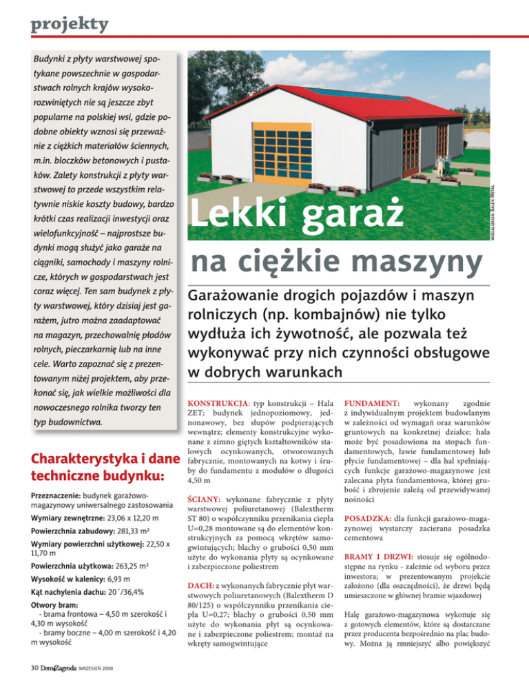 projekty Budynki z płyty warstwowej spotykane powszechnie w gospodarstwach rolnych krajów wysokorozwiniętych nie są jeszcze zbyt popularne na polskiej wsi, gdzie podobne obiekty wznosi się przeważnie z ciężkich materiałów ściennych, m.in. bloczków betonowych i pustastwowej to przede wszystkim relatywnie niskie koszty budowy, bardzo krótki czas realizacji inwestycji oraz wielofunkcyjność – najprostsze budynki mogą służyć jako garaże na ciągniki, samochody i maszyny rolnicze, których w gospodarstwach jest coraz więcej. Ten sam budynek z płyty warstwowej, który dzisiaj jest garażem, jutro można zaadaptować na magazyn, przechowalnię płodów rolnych, pieczarkarnię lub na inne cele. Warto zapoznać się z prezentowanym niżej projektem, aby przekonać się, jak wielkie możliwości dla nowoczesnego rolnika tworzy ten typ budownictwa. Charakterystyka i dane techniczne budynku: Przeznaczenie: budynek garażowomagazynowy uniwersalnego zastosowania Wymiary zewnętrzne: 23,06 x 12,20 m Powierzchnia zabudowy: 281,33 m² Wymiary powierzchni użytkowej: 22,50 x 11,70 m Powierzchnia użytkowa: 263,25 m² Wysokość w kalenicy: 6,93 m Kąt nachylenia dachu: 20´/36,4% Otwory bram: - brama frontowa – 4,50 m szerokość i 4,30 m wysokość - bramy boczne – 4,00 m szerokość i 4,20 m wysokość 30 WRZESIEŃ 2008 Lekki garaż wiZUaliZacja: BaleX-MeTal ków. Zalety konstrukcji z płyty war- na ciężkie maszyny Garażowanie drogich pojazdów i maszyn rolniczych (np. kombajnów) nie tylko wydłuża ich żywotność, ale pozwala też wykonywać przy nich czynności obsługowe w dobrych warunkach KONSTRUKCJA: typ konstrukcji – Hala ZET; budynek jednopoziomowy, jednonawowy, bez słupów podpierających wewnątrz; elementy konstrukcyjne wykonane z zimno giętych kształtowników stalowych ocynkowanych, otworowanych fabrycznie, montowanych na kotwy i śruby do fundamentu z modułów o długości 4,50 m ŚCIANY: wykonane fabrycznie z płyty warstwowej poliuretanowej (Balextherm ST 80) o współczynniku przenikania ciepła U=0,28 montowane są do elementów konstrukcyjnych za pomocą wkrętów samogwintujących; blachy o grubości 0,50 mm użyte do wykonania płyty są ocynkowane i zabezpieczone poliestrem DACH: z wykonanych fabrycznie płyt warstwowych poliuretanowych (Balextherm D 80/125) o współczynniku przenikania ciepła U=0,27; blachy o grubości 0,50 mm użyte do wykonania płyt są ocynkowane i zabezpieczone poliestrem; montaż na wkręty samogwintujące FUNDAMENT: wykonany zgodnie z indywidualnym projektem budowlanym w zależności od wymagań oraz warunków gruntowych na konkretnej działce; hala może być posadowiona na stopach fundamentowych, ławie fundamentowej lub płycie fundamentowej – dla hal spełniających funkcje garażowo-magazynowe jest zalecana płyta fundamentowa, której grubość i zbrojenie zależą od przewidywanej nośności POSADZKA: dla funkcji garażowo-magazynowej wystarczy zacierana posadzka cementowa BRAMY I DRZWI: stosuje się ogólnodostępne na rynku - zależnie od wyboru przez inwestora; w prezentowanym projekcie założono (dla oszczędności), że drzwi będą umieszczone w głównej bramie wjazdowej Halę garażowo-magazynowa wykonuje się z gotowych elementów, które są dostarczane przez producenta bezpośrednio na plac budowy. Można ją zmniejszyć albo powiększyć projekty 4,50 m brama frontowa 4,00 m brama boczna 11,70 m 12,20 m 4,00 m brama boczna 22,50 m 23,06 m o kolejne „moduły” o długości 4,50 m. Producent wykonuje bezpłatnie – w ramach zamówienia – projekt konstrukcji obiektu dostosowany do potrzeb konkretnego inwestora. Stanowi on podstawę projektu budowlanego, który załącza się do wniosku o pozwolenie na budowę. Zajmuje to zazwyczaj nie więcej niż 2 tygodnie. Na wyprodukowanie wszystkich „klocków” (elementów), z których montuje się halę, potrzeba od 4 do 6 tygodni. Sam montaż obiektu, w zależności od jego wielkości, zajmuje kilkuosobowej ekipie 5 do 7 dni. Konstrukcja hali umożliwia dowolne jej zagospodarowanie, zgodne z potrzebami inwestora. Można ją podzielić na mniejsze pomieszczenia ściankami działowymi (np. wydzielić pomieszczenie warsztatowe, sanitarne i biurowe), a także zamontować sufity podwieszane (konstrukcja przyjmuje obciążenia do 10 kg/m²). Oświetlenie światłem dziennym jest możliwe przez zamontowanie świetlików kalenicowych oraz okien w ścianach. Trzeba je jednak przewidzieć w chwili tworzenia projek- tu konstrukcyjnego. Zmiany takiej można dokonać także podczas użytkowania obiektu, co jest stosunkowo łatwe i tanie przy tej konstrukcji. Prezentowany obiekt ma izolowane ściany, ponieważ założono, że będzie ogrzewany. System ogrzewania zależy od preferencji inwestora. Można przyjąć, że w okresie zimowym we wnętrzu hali będzie utrzymywana minimalna temperatura dodatnia, a w wydzielonym pomieszczeniu warsztatowym temperatura wyższa pozwalająca na wykonywanie prac serwisowych przez ludzi. Jeśli hala ma służyć wyłącznie jako garaż na sprzęt, a więc nie będzie wymagać utrzymania stałej temperatury wewnątrz, to jej ścian i dachu nie trzeba budować z płyt ocieplonych uwzględnionych w projekcie, lecz z blachy trapezowej np. BTU55 ze stali 0,50 mm ocynkowanej z powłoką poliestrową. W ten sposób można znacznie obniżyć koszt inwestycji. Trzeba jednak pamiętać, że hala nie będzie miała wówczas charakteru uniwersalnego i – jeśli chcielibyśmy w przyszłości zmienić jej funkcję – poniesiemy dodatkowe koszty pokrycia ścian i dachu płytą warstwową. Aleksandra Wojciechowska WRZESIEŃ 2008 31