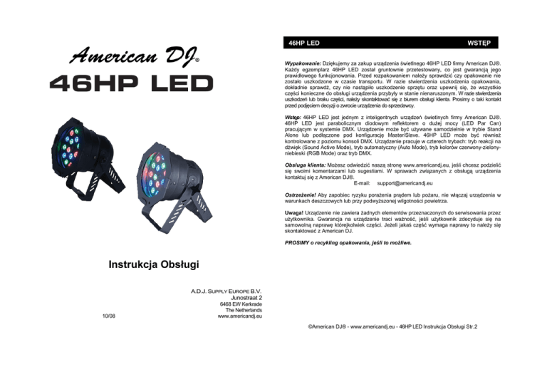 46HP LED WSTĘP Wypakowanie: Dziękujemy za zakup urządzenia świetlnego 46HP LED firmy American DJ®. Każdy egzemplarz 46HP LED został gruntownie przetestowany, co jest gwarancją jego prawidłowego funkcjonowania. Przed rozpakowaniem należy sprawdzić czy opakowanie nie zostało uszkodzone w czasie transportu. W razie stwierdzenia uszkodzenia opakowania, dokładnie sprawdź, czy nie nastąpiło uszkodzenie sprzętu oraz upewnij się, że wszystkie części konieczne do obsługi urządzenia przybyły w stanie nienaruszonym. W razie stwierdzenia uszkodzeń lub braku części, należy skontaktować się z biurem obsługi klienta. Prosimy o taki kontakt przed podjęciem decyzji o zwrocie urządzenia do sprzedawcy. Wstęp: 46HP LED jest jednym z inteligentnych urządzeń świetlnych firmy American DJ®. 46HP LED jest parabolicznym diodowym reflektorem o dużej mocy (LED Par Can) pracującym w systemie DMX. Urządzenie może być używane samodzielnie w trybie Stand Alone lub podłączone pod konfigurację Master/Slave. 46HP LED może być również kontrolowane z poziomu konsoli DMX. Urządzenie pracuje w czterech trybach: tryb reakcji na dźwięk (Sound Active Mode), tryb automatyczny (Auto Mode), tryb kolorów czerwony-zielonyniebieski (RGB Mode) oraz tryb DMX. Obsługa klienta: Możesz odwiedzić naszą stronę www.americandj.eu, jeśli chcesz podzielić się swoimi komentarzami lub sugestiami. W sprawach związanych z obsługą urządzenia kontaktuj się z American DJ®. E-mail: [email protected] Ostrzeżenie! Aby zapobiec ryzyku porażenia prądem lub pożaru, nie włączaj urządzenia w warunkach deszczowych lub przy podwyższonej wilgotności powietrza. Uwaga! Urządzenie nie zawiera żadnych elementów przeznaczonych do serwisowania przez użytkownika. Gwarancja na urządzenie traci ważność, jeśli użytkownik zdecyduje się na samowolną naprawę którejkolwiek części. Jeżeli jakaś część wymaga naprawy to należy się skontaktować z American DJ. PROSIMY o recykling opakowania, jeśli to możliwe. Instrukcja Obsługi A.D.J. SUPPLY EUROPE B.V. Junostraat 2 10/08 6468 EW Kerkrade The Netherlands www.americandj.eu ©American DJ® - www.americandj.eu - 46HP LED Instrukcja Obsługi Str.2 46HP LED Wskazówki ogólne Aby w pełni wykorzystać możliwości naszego produktu, prosimy o przeczytanie instrukcji obsługi i zapoznanie się z podstawowymi funkcjami urządzenia. Instrukcja zawiera ważne informacje dotyczące bezpieczeństwa obsługi oraz sposobu konserwacji urządzenia. Prosimy o zachowanie instrukcji obsługi w celu jej ponownego użycia. • • • • 46HP LED • • • • • • • Wielobarwność (Multi – Colors) Cztery tryby pracy Elektroniczne przyciemnianie 0 –100% Wbudowany mikrofon Protokół DMX-512 Połączenia DMX 3-pinowe i 5-pinowe Sześć trybów pracy DMX: tryb jednokanałowy, tryb dwukanałowy, tryb trójkanałowy, tryb czterokanałowy, tryb sześciokanałowy oraz tryb siedmiokanałowy. 46HP LED • • • • • • • • • • • • Charakterystyka • Instaluj urządzenie tak, aby było ono stabilne i bezpieczne. Przewód zasilania ułóż tak, aby nikt po nim nie chodził ani też niczego na nim nie stawiał. Zwróć szczególną uwagę na miejsca, w których przewody wychodzą z urządzenia. Konserwacja – Sprzęt powinien być czyszczony zgodnie z zaleceniami wytwórcy. Szczegóły dotyczące czyszczenia – patrz str.15. Ciepło – Urządzenie powinno być umieszczone z dala od źródeł ciepła takich jak kaloryfery, rejestratory ciepła, piece oraz innych urządzeń wytwarzających ciepło (włącznie ze wzmacniaczami). Urządzenie powinno być serwisowane przez wykwalifikowany personel w przypadku, gdy: A. Kabel zasilania lub wtyczka uległy uszkodzeniu. B. Coś spadło na urządzenie lub zostało ono zalane wodą lub innym płynem. C. Urządzenie nie zostało schowane przed deszczem. D. Urządzenie nie działa normalnie. Środki Bezpieczeństwa Aby zmniejszyć ryzyko porażenia prądem lub pożaru, nie włączaj urządzenia w warunkach deszczowych lub przy podwyższonej wilgotności powietrza. Trzymaj urządzenie z dala od wody lub innych płynów. Upewnij się, że napięcie pobierane przez urządzenie jest takie samo jak napięcie w sieci. Nie uruchamiaj urządzenia, jeśli przewód zasilający jest uszkodzony. Nie próbuj usunąć lub wyłamać bolca uziemienia z wtyczki. Jego zadaniem jest zabezpieczenie przed porażeniem prądem i pożarem w wypadku zwarcia wewnątrz urządzenia. Wyciągnij wtyczkę z kontaktu zanim włączysz urządzenie do obwodu zawierającego inne urządzenia elektryczne. Pod żadnym pozorem nie ściągaj wierzchniej obudowy. Urządzenie nie zawiera żadnych elementów przeznaczonych do serwisowania przez użytkownika. Nie uruchamiaj urządzenia, jeśli pokrywa obudowy jest zdjęta. Nigdy nie podłączaj urządzenia do sterownika dimmer pack. Instaluj urządzenie tylko w miejscach zapewniających dobrą wentylację. Odstęp pomiędzy urządzeniem i ścianą nie powinien być mniejszy niż 15cm. Nie używaj urządzenia, jeśli jakikolwiek jego element uległ uszkodzeniu. Urządzenie jest przeznaczone tylko do użytku wewnątrz budynku. Gwarancja na urządzenie straci ważność, jeśli zostanie ono użyte na dworze. Jeżeli urządzenie nie jest używane przez dłuższy okres czasu, odłącz je od zasilania. ©American DJ® - www.americandj.eu - 46HP LED Instrukcja Obsługi Str.3 ©American DJ® - www.americandj.eu - 46HP LED Instrukcja Obsługi Str.4 46HP LED Ustawienia 46HP LED Ustawienia Zasilanie: Przed podłączeniem urządzenia do sieci należy upewnić się, że napięcie w sieci odpowiada napięciu, pod jakim ono pracuje. Urządzenie AmericanDJ® 46HP LED wymaga napięcia z zakresu 100V – 220V, więc jest ono kompatybilne z każdym możliwym napięciem podawanym przez sieć. Nabywca nie musi się martwić, że napięcie pobierane przez urządzenie i napięcie w sieci nie będą dopaso