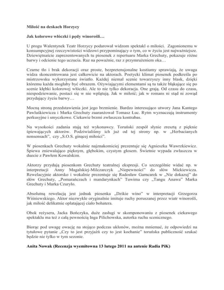 Miłość na deskach Horzycy Jak kolorowe włóczki i pędy winorośli… U progu Walentynek Teatr Horzycy podarował widzom spektakl o miłości. Zagonionemu w konsumpcyjnej rzeczywistości widzowi przypominający o tym, co w życiu jest najważniejsze. Dziewiętnaście zaprezentowanych tu piosenek z repertuaru Marka Grechuty, pokazuje różne barwy i odcienie tego uczucia. Raz na poważnie, raz z przymrużeniem oka… Czarne tło i brak dekoracji oraz proste, bezpretensjonalne kostiumy sprawiają, że uwaga widza skoncentrowana jest całkowicie na aktorach. Poetycki klimat piosenek podkreśla po mistrzowsku wykorzystane światło. Każdej niemal scenie towarzyszy inny blask, dzięki któremu każda mogłaby być obrazem. Ożywiającymi elementami są tu także błąkające się po scenie kłębki kolorowej włóczki. Ale to nie tylko dekoracja. One grają. Od czasu do czasu, niespodziewanie, postaci się w nie wplątują. Jak w miłość; jak w romans ni stąd ni zowąd przydający życiu barwy… Mocną stroną przedstawienia jest jego brzmienie. Bardzo interesująco utwory Jana Kantego Pawluśkiewicza i Marka Grechuty zaaranżował Tomasz Łuc. Rytm wyznaczają instrumenty perkusyjne i smyczkowe. Ciekawie brzmi zwłaszcza kontrabas. Na wysokości zadania stają też wykonawcy. Toruński zespół słynie zresztą z pięknie śpiewających aktorów. Podziwialiśmy ich już od tej strony np. w „Herbacianych nonsensach”, czy „S.O.S. ginącej miłości”. W piosenkach Grechuty wokalnie najznakomiciej prezentuje się Agnieszka Wawrzkiewicz. Śpiewa zniewalająco pięknym, głębokim, czystym głosem. Świetnie wypada zwłaszcza w duecie z Pawłem Kowalskim. Aktorzy przydają piosenkom Grechuty teatralnej ekspresji. Co szczególnie widać np. w interpretacji Anny Magalskiej-Milczarczyk „Niepewności” do słów Mickiewicza. Rewelacyjnie aktorsko i wokalnie prezentuje się Radosław Garncarek w „Nie dokazuj” do słów Grechuty, „Pomarańczach i mandarynkach” Tuwima czy „Tangu Anawa” Marka Grechuty i Marka Czuryło. Absolutną rewelacją jest jednak piosenka „Dzikie wino” w interpretacji Grzegorza Wiśniewskiego. Aktor niezwykle oryginalnie imituje ruchy poruszanej przez wiatr winorośli, jak miłość delikatnie oplatającej ciało bohatera. Obok reżysera, Jacka Bończyka, duże zasługi w skomponowaniu z piosenek ciekawego spektaklu ma też z całą pewnością Inga Pilichowska, autorka ruchu scenicznego. Biorąc pod uwagę owację na stojąco podczas ukłonów, można mniemać, że odpowiedzi na tytułowe pytanie „Czy to jest przyjaźń czy to jest kochanie” toruńska publiczność szukać będzie nie tylko w tym sezonie. Anita Nowak (Recenzja wyemitowna 13 lutego 2011 na antenie Radia PiK)
