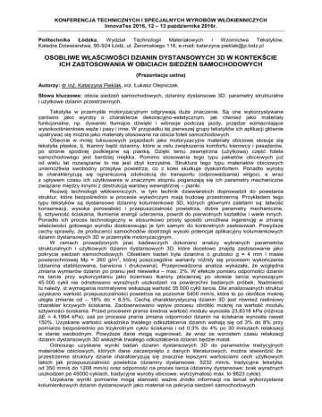 KONFERENCJA TECHNICZNYCH I SPECJALNYCH WYROBÓW WŁÓKIENNICZYCH InnovaTex 2016, 12 – 13 października 2016r. Politechnika Łódzka, Wydział Technologii Materiałowych i Wzornictwa Tekstyliów, Katedra Dziewiarstwa, 90-924 Łódź, ul. Żeromskiego 116, e-mail: [email protected] OSOBLIWE WŁAŚCIWOŚCI DZIANIN DYSTANSOWYCH 3D W KONTEKŚCIE ICH ZASTOSOWANIA W OBICIACH SIEDZEŃ SAMOCHODOWYCH (Prezentacja ustna) Autorzy: dr inż. Katarzyna Pieklak, inż. Łukasz Olejniczak. Słowa kluczowe: obicia siedzeń samochodowych, dzianiny dystansowe 3D, parametry strukturalne i użytkowe dzianin przestrzennych. Tekstylia w przemyśle motoryzacyjnym odgrywają duże znaczenie. Są one wykorzystywane zarówno jako wyroby o charakterze dekoracyjno-estetycznym, jak również jako materiały funkcjonalne, np. dywaniki tłumiące dźwięki i wibracje podczas jazdy, przędze wzmacniające wysokociśnieniowe węże i pasy i inne. W przypadku tej pierwszej grupy tekstyliów ich aplikacji głównie upatrywać się można jako materiały stosowane na obicia foteli samochodowych. Obecnie w mniej luksusowych pojazdach jako motoryzacyjne materiały obiciowe stosuje się tekstylia płaskie, tj. tkaniny bądź dzianiny, które w celu zwiększenia komfortu kierowcy i pasażerów, po stronie spodniej podklejane są pianką. Dzięki temu zewnętrzna (użytkowa) część fotela samochodowego jest bardziej miękka. Pomimo stosowania tego typu pakietów obiciowych już od wielu lat rozwiązanie to nie jest zbyt korzystne. Struktura tego typu materiałów obiciowych uniemożliwia swobodny przepływ powietrza, co z kolei skutkuje dyskomfortem. Ponadto wyroby te charakteryzują się ograniczoną zdolnością do transportu (odprowadzania) wilgoci, a wraz z upływem czasu ich użytkowania w znacznym stopniu pogarszają się ich parametry mechaniczne związane między innymi z destrukcją warstwy wewnętrznej – pianki. Rozwój technologii włókienniczych, w tym technik dziewiarskich doprowadził do powstania struktur, które bezpośrednio w procesie wytwórczym mają budowę przestrzenną. Przykładem tego typu tekstyliów są dystansowe dzianiny kolumienkowe 3D, których głównymi zaletami są: łatwość konserwacji, wysoka porowatość i przepuszczalność powietrza, dobre parametry mechaniczne, tj. sztywność ściskania, tłumienie energii uderzenia, powrót do pierwotnych kształtów i wiele innych. Ponadto ich proces technologiczny w stosunkowo prosty sposób umożliwia ingerencję w zmianę właściwości gotowego wyrobu dostosowując je tym samym do konkretnych zastosowań. Powyższe cechy sprawiły, że producenci samochodów dostrzegli wysoki potencjał aplikacyjny kolumienkowych dzianin dystansowych 3D w przemyśle motoryzacyjnym. W ramach prowadzonych prac badawczych dokonano analizy wybranych parametrów strukturalnych i użytkowych dzianin dystansowych 3D, które docelowo znajdą zastosowanie jako pokrycia siedzeń samochodowych. Obiektem badań była dzianina o grubości g ≈ 4 mm i masie 2 powierzchniowej Mp ≈ 260 g/m , której poszczególne warianty różniły się procesem wykończenia (dzianina stabilizowana, barwiona i drukowana). Przeprowadzona analiza wykazała, że względna zmiana wymiarów dzianin po praniu jest niewielka – max. 2%. W efekcie pomiaru odporności dzianin na tarcie przy wykorzystaniu jako ścierniwo tkaniny płóciennej po okresie tarcia wynoszącym 45 000 cykli nie odnotowano wyraźnych uszkodzeń na powierzchni badanych próbek. Nadmienić tu należy, iż wymagania normatywne wskazują wartość 35 000 cykli tarcia. Dla analizowanych struktur uzyskano wartość przepuszczalności powietrza na poziomie 5400 mm/s, która to po obróbce mokrej uległa zmianie od – 18% do + 8,5%. Cechą charakterystyczną dzianin 3D jest również nieliniowy charakter krzywych ściskania. Zaobserwowano wpływ procesu obróbki mokrej na wartość modułu sztywności ściskania. Przed procesem prania średnia wartość modułu wynosiła 23,8318 kPa (różnica ΔE = 4,1994 kPa), zaś po procesie prania zmiana odporności dzianin na ściskanie wynosiła nawet 150%. Uzyskane wartości wskaźnika trwałego odkształcenia dzianin wahają się od 3% do 8% przy pomiarze bezpośrednio po trzykrotnym cyklu ściskania i od 0,3% do 4% po 30 minutach relaksacji w stanie swobodnym. Powyższe dane mogą sugerować, że wraz ze wzrostem czasu relaksacji dzianin dystansowych 3D wskaźnik trwałego odkształcenia dzianin będzie malał. Odnosząc uzyskane wyniki badań dzianin dystansowych 3D do parametrów tradycyjnych materiałów obiciowych, których dane zaczerpnięto z danych literaturowych, można stwierdzić że: przestrzenne struktury dziane charakteryzują się znacznie lepszymi wartościami cech użytkowych takich jak przepuszczalność powietrza (dzianiny dystansowe: 5232 mm/s, tradycyjne tekstylia: od 350 mm/s do 1208 mm/s) oraz odporność na proces tarcia (dzianiny dystansowe: brak wyraźnych uszkodzeń po 45000 cyklach, tradycyjne wyroby obiciowe: wytrzymałość max. to 9823 cykle). Uzyskane wyniki pomiarów mogą stanowić ważne źródło informacji na temat wykorzystania kolumienkowych dzianin dystansowych jako materiał na pokrycia siedzeń samochodowych.