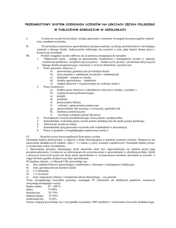 PRZEDMIOTOWY SYSTEM OCENIANIA UCZNIÓW NA LEKCJACH JĘZYKA POLSKIEGO W PUBLICZNYM GIMNAZJUM W SIEDLISKACH I. Uczniowie na pierwszej lekcji zostają zapoznani z normami wymagań na poszczególne stopnie oraz zasadami oceniania. II. Przed kaŜdym pisemnym sprawdzianem przeprowadzane są lekcje powtórzeniowe utrwalające materiał z danego działu. Jednocześnie informuje się uczniów o tym, jaka będzie forma pracy i kryteria jej oceniania. Pomiar osiągnięć ucznia odbywa się za pomocą następujących narzędzi: 1. Odpowiedź ustna – polega na sprawdzeniu wiadomości i umiejętności ucznia w zakresie rozumienia problemu, związków przyczynowo – skutkowych, postaw i przekonań dotyczących danego działu programowego; orientacji w świecie literackim i językowym. 2. Prace pisemne ( klasowe ): a) sprawdziany gramatyczne po kaŜdym dziale b) testy pisemne z zadaniami otwartymi i zamkniętymi c) dyktando – pisanie ze słuchu d) krótkie sprawdziany – kartkówki e) zadania klasowe ( wypracowanie na wybrany temat ) 3. Prace terminowe: a) krótkie prace domowe o charakterze celowym ( notatka, czytanka ) b) wypracowania podsumowujące c) projekt d) portfolio e) przeczytanie lektury f) referaty i opracowania tematyczne g) sprawozdanie lub recenzja z wycieczki, spektaklu itd. h) konkursy polonistyczne i) recytacja z pamięci poezji lub prozy 4. Prowadzenie zeszytu przedmiotowego i korzystanie z podręcznika. 5. Samodzielnie wykonana przez ucznia pomoc dydaktyczna do nauki języka polskiego. 6. Aktywność ucznia na lekcji. 7. Samodzielnie przygotowana wystawka lub współudział w inscenizacji. 8. Praca w grupach ( uwzględniająca samoocenę ucznia ). III. IV. Kryteria oceny poszczególnych form pracy ucznia. Ocenianie będzie dokonywane w oparciu o skalę obowiązującą w polskim systemie oświaty. Dopuszcza się stosowanie dodatkowych znaków: plus ( +) i minus (-) przy ocenach cząstkowych. Ocenianie będzie jawne, a wystawiane oceny uzasadniane. 1. Sprawdzian pisemny obejmujący dział materiału musi być zapowiedziany na tydzień przed jego przeprowadzeniem. Uczniowie są zobowiązani do uczestniczenia w sprawdzianie w określonym dniu. JeŜeli z przyczyn losowych uczeń nie moŜe pisać sprawdzianu w wyznaczonym terminie, powinien to uczynić w ciągu dwóch tygodni od pierwszej daty sprawdzianu. W kaŜdym okresie , w klasach I-III, przewiduje się: a) dwa zadania klasowe sprawdzające wiadomości z literatury i umiejętności redakcyjne b) testy gramatyczne po kaŜdym dziale c) 1-2 dyktanda d) 1-2 recytacje e) testy znajomości lektury i rozumienia tekstu literackiego – wg potrzeb Testy uwzględniają wszystkie poziomy wymagań. W zaleŜności od zdobytych punktów, uczniowie otrzymują następujące oceny: bardzo dobry 91 –100 % dobry 75-90% dostateczny 55-74% dopuszczający 35-54% niedostateczny 0-34% Ocenę celującą przewiduje się w przypadku uzyskania 100% punktów i wykonania ćwiczenia dodatkowego. 2. Krótkie sprawdziany ( odpowiedzi pisemne ) będą wykonywane w ciągu 10-15 minut. Nie będą zapowiedziane i nie podlegają poprawie. Zakres treści tych sprawdzianów obejmuje 3 ostatnie lekcje. 3. Odpowiedzi ustne – na kaŜdą odpowiedź składa się zawartość merytoryczna, argumentacja, wyraŜanie sądów i ocen, stawianie tez lub hipotez, uzasadnianie wypowiedzi, poprawne uŜycie języka polskiego, literackiego. Dodatkowe pytania naprowadzające wpływają na obniŜenie oceny. 4. Aktywność ucznia na lekcji – za poprawną odpowiedź, której uczeń udziela podczas lekcji przyznawany jest plus (+). Pięć plusów powoduje wpisanie do dziennika oceny bardzo dobrej. 5.Prace terminowe – oceniana będzie samodzielna praca ucznia na określony termin. Ich zasięg obejmuje gromadzenie i dokumentowanie wiadomości z róŜnych źródeł, czytanie i twórcze wykorzystanie literatury, wypracowania pisemne będące podsumowaniem wiadomości z lekcji lub z działu literatury. Ponadto oceniane będą osiągnięcia ucznia w konkursach przedmiotowych. JeŜeli uczeń zakwalifikuje się do szczebla ponadszkolnego, otrzyma ocenę o jeden stopień wyŜszą od proponowanej oceny końcoworocznej. Wszystkie zadane lektury są obowiązkowe. Brak znajomości ich treści i zagadnień z nich wypływających będzie punktowany oceną niedostateczną. 6. Zeszyt przedmiotowy będzie kontrolowany podczas sprawdzania prac domowych, zaś oceniany raz na okres. Przy ocenie zeszytu brane będą pod uwagę następujące elementy: a) estetyka pisma i prowadzonych notatek b) ortografia i stylistyka c) systematyczność notowania i wklejania kart pracy d) wzbogacanie zeszytu ciekawymi informacjami i ilustracjami 7. Praca w grupach – będzie oceniana przez ucznia, jako element samooceny oraz przez nauczyciela nadzorującego i sprawdzającego pracę grup. Będą tu uwzględniane następujące elementy: a) zaangaŜowanie b) badanie c) przekształcanie d) prezentacja 8. Samodzielnie wykonana przez ucznia pomoc dydaktyczna do nauki j. polskiego będzie oceniana wg osobno ustalonych kryteriów ( projekt, portfolio ) lub wg następujących norm: a) umiejętność wykorzystania informacji z róŜnych źródeł b) wkład pracy ucznia c) samodzielność wykonania pracy d) estetyka e) pomysłowość 9. Samodzielnie przygotowana wystawka, drama, recytacja: a) indywidualne predyspozycje ucznia b) umiejętność wykorzystania informacji z róŜnych źródeł c) wkład pracy i zaangaŜowanie d) umiejętność prezentacji V. Sposób poprawiania ocen przez uczniów. 1. Ocenę z odpowiedzi ustnej uczeń poprawia w tej samej formie – sam zgłasza się do poprawy w dowolnym czasie. 2. Ocenę z pracy pisemnej poprawia w terminie 2 tygodni od otrzymania oceny niezadawalającej ucznia. JeŜeli grupa poprawiających będzie większa niŜ 3 osoby, poprawa będzie się odbywać w formie pisemnej. JeŜeli grupa będzie mniejsza, poprawa moŜe się odbywać w formie ustnej. Ustnie moŜe takŜe poprawiać ten u