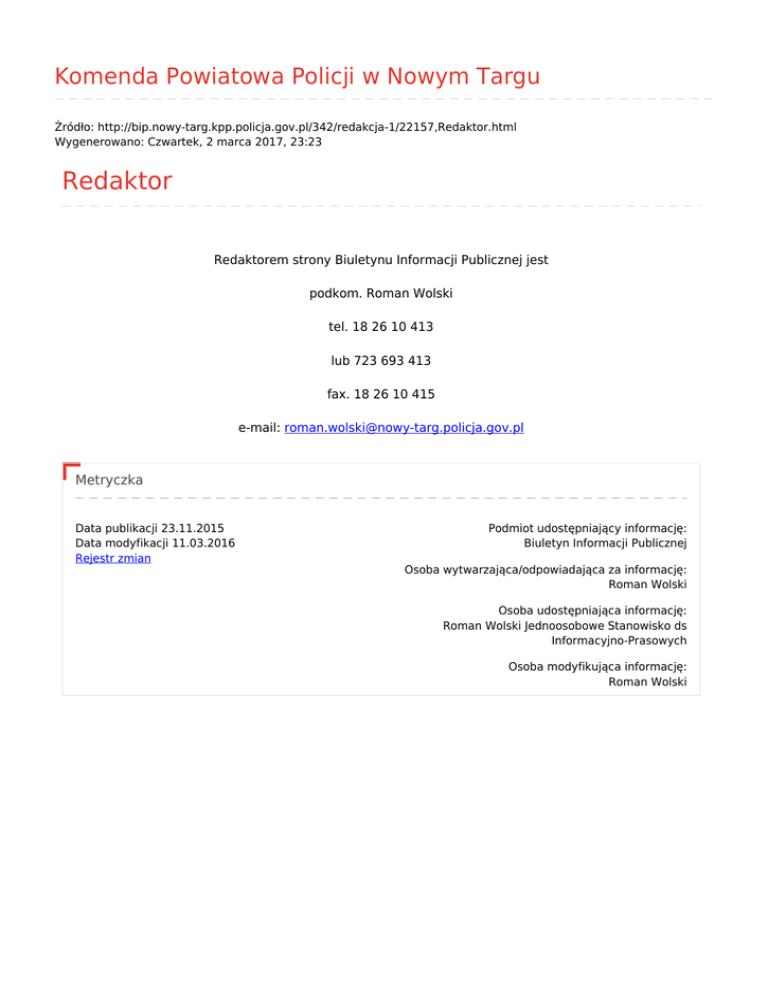 Komenda Powiatowa Policji w Nowym Targu Źródło: http://bip.nowy-targ.kpp.policja.gov.pl/342/redakcja-1/22157,Redaktor.html Wygenerowano: Czwartek, 2 marca 2017, 23:23 Redaktor Redaktorem strony Biuletynu Informacji Publicznej jest podkom. Roman Wolski tel. 18 26 10 413 lub 723 693 413 fax. 18 26 10 415 e-mail: [email protected] Metryczka Data publikacji 23.11.2015 Data modyfikacji 11.03.2016 Rejestr zmian Podmiot udostępniający informację: Biuletyn Informacji Publicznej Osoba wytwarzająca/odpowiadająca za informację: Roman Wolski Osoba udostępniająca informację: Roman Wolski Jednoosobowe Stanowisko ds Informacyjno-Prasowych Osoba modyfikująca informację: Roman Wolski