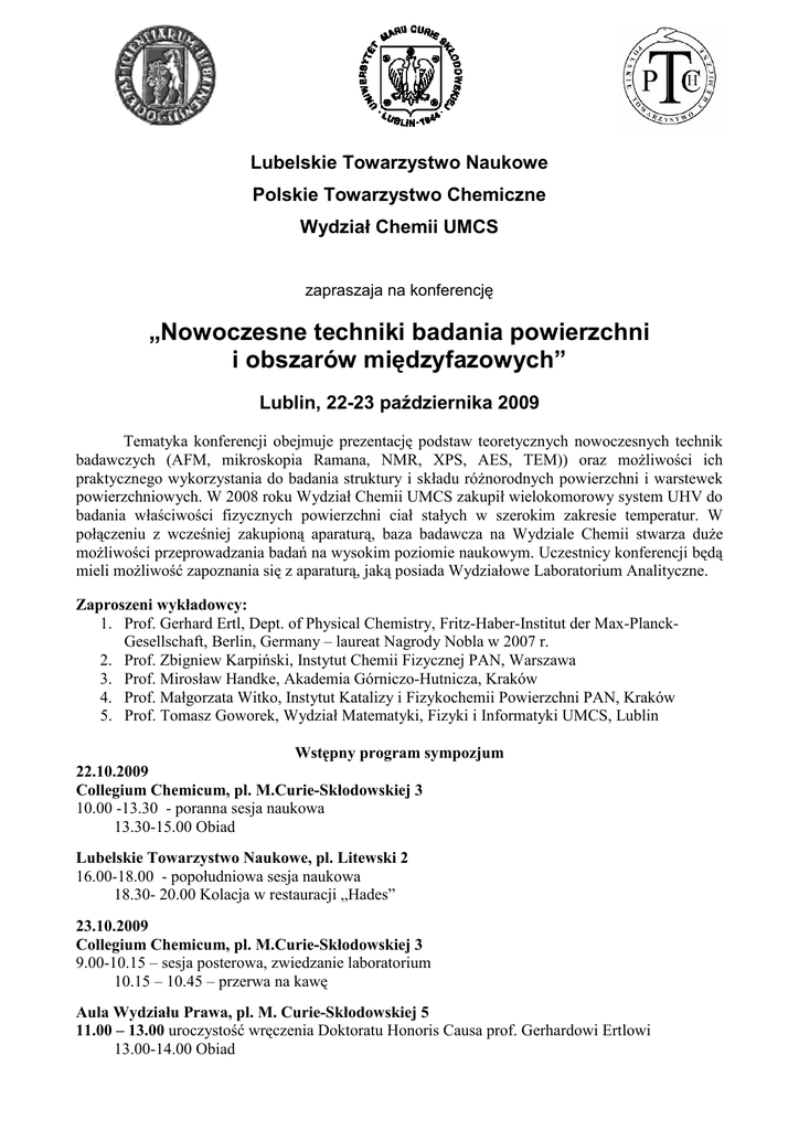 Lubelskie Towarzystwo Naukowe Polskie Towarzystwo Chemiczne Wydział Chemii UMCS zapraszaja na konferencję „Nowoczesne techniki badania powierzchni i obszarów międzyfazowych” Lublin, 22-23 października 2009 Tematyka konferencji obejmuje prezentację podstaw teoretycznych nowoczesnych technik badawczych (AFM, mikroskopia Ramana, NMR, XPS, AES, TEM)) oraz moŜliwości ich praktycznego wykorzystania do badania struktury i składu róŜnorodnych powierzchni i warstewek powierzchniowych. W 2008 roku Wydział Chemii UMCS zakupił wielokomorowy system UHV do badania właściwości fizycznych powierzchni ciał stałych w szerokim zakresie temperatur. W połączeniu z wcześniej zakupioną aparaturą, baza badawcza na Wydziale Chemii stwarza duŜe moŜliwości przeprowadzania badań na wysokim poziomie naukowym. Uczestnicy konferencji będą mieli moŜliwość zapoznania się z aparaturą, jaką posiada Wydziałowe Laboratorium Analityczne. Zaproszeni wykładowcy: 1. Prof. Gerhard Ertl, Dept. of Physical Chemistry, Fritz-Haber-Institut der Max-PlanckGesellschaft, Berlin, Germany – laureat Nagrody Nobla w 2007 r. 2. Prof. Zbigniew Karpiński, Instytut Chemii Fizycznej PAN, Warszawa 3. Prof. Mirosław Handke, Akademia Górniczo-Hutnicza, Kraków 4. Prof. Małgorzata Witko, Instytut Katalizy i Fizykochemii Powierzchni PAN, Kraków 5. Prof. Tomasz Goworek, Wydział Matematyki, Fizyki i Informatyki UMCS, Lublin Wstępny program sympozjum 22.10.2009 Collegium Chemicum, pl. M.Curie-Skłodowskiej 3 10.00 -13.30 - poranna sesja naukowa 13.30-15.00 Obiad Lubelskie Towarzystwo Naukowe, pl. Litewski 2 16.00-18.00 - popołudniowa sesja naukowa 18.30- 20.00 Kolacja w restauracji „Hades” 23.10.2009 Collegium Chemicum, pl. M.Curie-Skłodowskiej 3 9.00-10.15 – sesja posterowa, zwiedzanie laboratorium 10.15 – 10.45 – przerwa na kawę Aula Wydziału Prawa, pl. M. Curie-Skłodowskiej 5 11.00 – 13.00 uroczystość wręczenia Doktoratu Honoris Causa prof. Gerhardowi Ertlowi 13.00-14.00 Obiad Karta zgłoszenia (termin upływa 10.X.2009) Imię i nazwisko: __________________________________________________________________ Telefon/Faks/E-mail: _____________________________________________________________ Adres instytucji: __________________________________________________________________ NIP instytucji (potrzebny do wystawienia faktury): ______________________________________ Tytuł prezentacji posterowej i autorzy*: _______________________________________________ _______________________________________________________________________________ _______________________________________________________________________________ Streszczenie maksymalnie 1 strona tekstu w formacie Word______________________________ ________________________________________________________________________________ *Poza wykładami na zaproszenie przewidziana jest sesja posterowa. Szczegółowy program spotkania ukaŜe się na stronie internetowej http://vega.umcs.lublin.pl/ptchem/ po zamknięciu listy uczestników. Opłata konferencyjna wynosi 150 zł i obejmuje uczestnictwo w obradach i imprezach towarzyszących, materiały konferencyjne i przerwy kawowe w dniach 22-23.04.2009 Noclegi: Uczestnicy rezerwują sobie noclegi na własną rękę. Organizatorzy zarezerwowali pewną liczbą miejsc noclegowych w Domu Nauczyciela połoŜonym blisko Wydziału Chemii UMCS. Osoby, które zechcą tam nocować prosimy o zaznaczenie tego w formularzu. Dom Nauczyciela, ul. Akademicka 4 pokój 1-os. z łaz. ( 128zł/os.) pokój 2-os. z łaz. ( 158zł/2os.) 21/22.04 □ □ 22/23.04 □ □ Opłatę konferencyjną naleŜy przelać na podane niŜej konto: Nazwa właściciela rachunku: Lubelskie Towarzystwo Naukowe Nazwa banku: PEKAO S.A. O/Lublin Numer rachunku: 52 1240 5497 1111 0000 5013 5970 Z dopiskiem: konferencja „Nowoczesne Techniki..” Wypełnioną kartę zgłoszenia naleŜy przesłać do 10 października na adres organizatorów pocztą, faksem lub e-mailem: Prof. Jolanta Narkiewicz-Michałek Zakład Chemii Teoretycznej, Wydział Chemii UMCS pl. M.Curie-Skłodowskiej 3, 20-031 Lublin E-mail: [email protected] Faks: (81) 537-56-85