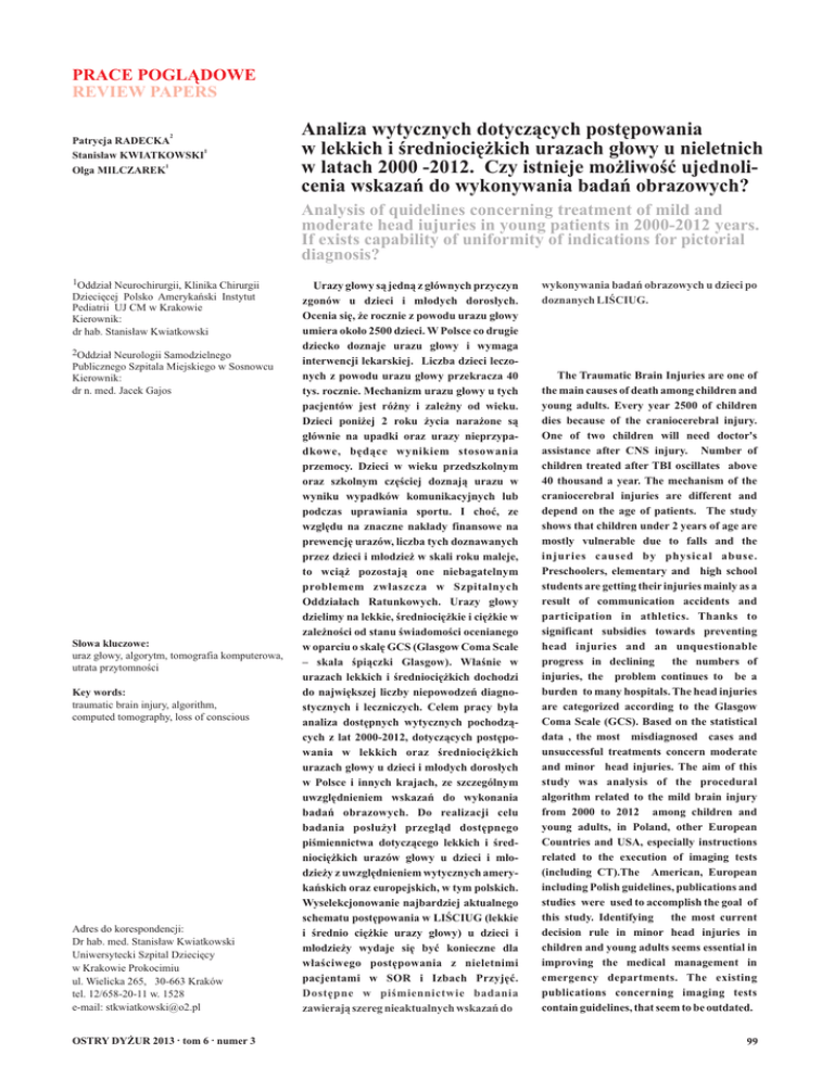PRACE POGLĄDOWE REVIEW PAPERS 2 Patrycja RADECKA 1 Stanisław KWIATKOWSKI 1 Olga MILCZAREK Analiza wytycznych dotyczących postępowania w lekkich i średniociężkich urazach głowy u nieletnich w latach 2000 -2012. Czy istnieje możliwość ujednolicenia wskazań do wykonywania badań obrazowych? Analysis of quidelines concerning treatment of mild and moderate head iujuries in young patients in 2000-2012 years. If exists capability of uniformity of indications for pictorial diagnosis? 1Oddział Neurochirurgii, Klinika Chirurgii Dziecięcej Polsko Amerykański Instytut Pediatrii UJ CM w Krakowie Kierownik: dr hab. Stanisław Kwiatkowski 2Oddział Neurologii Samodzielnego Publicznego Szpitala Miejskiego w Sosnowcu Kierownik: dr n. med. Jacek Gajos Słowa kluczowe: uraz głowy, algorytm, tomografia komputerowa, utrata przytomności Key words: traumatic brain injury, algorithm, computed tomography, loss of conscious Adres do korespondencji: Dr hab. med. Stanisław Kwiatkowski Uniwersytecki Szpital Dziecięcy w Krakowie Prokocimiu ul. Wielicka 265, 30-663 Kraków tel. 12/658-20-11 w. 1528 e-mail: [email protected] OSTRY DYŻUR 2013 . tom 6 . numer 3 Urazy głowy są jedną z głównych przyczyn zgonów u dzieci i młodych dorosłych. Ocenia się, że rocznie z powodu urazu głowy umiera około 2500 dzieci. W Polsce co drugie dziecko doznaje urazu głowy i wymaga interwencji lekarskiej. Liczba dzieci leczonych z powodu urazu głowy przekracza 40 tys. rocznie. Mechanizm urazu głowy u tych pacjentów jest różny i zależny od wieku. Dzieci poniżej 2 roku życia narażone są głównie na upadki oraz urazy nieprzypadkowe, będące wynikiem stosowania przemocy. Dzieci w wieku przedszkolnym oraz szkolnym częściej doznają urazu w wyniku wypadków komunikacyjnych lub podczas uprawiania sportu. I choć, ze względu na znaczne nakłady finansowe na prewencję urazów, liczba tych doznawanych przez dzieci i młodzież w skali roku maleje, to wciąż pozostają one niebagatelnym problemem zwłaszcza w Szpitalnych Oddziałach Ratunkowych. Urazy głowy dzielimy na lekkie, średniociężkie i ciężkie w zależności od stanu świadomości ocenianego w oparciu o skalę GCS (Glasgow Coma Scale – skala śpiączki Glasgow). Właśnie w urazach lekkich i średniociężkich dochodzi do największej liczby niepowodzeń diagnostycznych i leczniczych. Celem pracy była analiza dostępnych wytycznych pochodzących z lat 2000-2012, dotyczących postępowania w lekkich oraz średniociężkich urazach głowy u dzieci i młodych dorosłych w Polsce i innych krajach, ze szczególnym uwzględnieniem wskazań do wykonania badań obrazowych. Do realizacji celu badania posłużył przegląd dostępnego piśmiennictwa dotyczącego lekkich i średniociężkich urazów głowy u dzieci i młodzieży z uwzględnieniem wytycznych amerykańskich oraz europejskich, w tym polskich. Wyselekcjonowanie najbardziej aktualnego schematu postępowania w LIŚCIUG (lekkie i średnio ciężkie urazy głowy) u dzieci i młodzieży wydaje się być konieczne dla właściwego postępowania z nieletnimi pacjentami w SOR i Izbach Przyjęć. Dostępne w piśmiennictwie badania zawierają szereg nieaktualnych wskazań do wykonywania badań obrazowych u dzieci po doznanych LIŚCIUG. The Traumatic Brain Injuries are one of the main causes of death among children and young adults. Every year 2500 of children dies because of the craniocerebral injury. One of two children will need doctor's assistance after CNS injury. Number of children treated after TBI oscillates above 40 thousand a year. The mechanism of the craniocerebral injuries are different and depend on the age of patients. The study shows that children under 2 years of age are mostly vulnerable due to falls and the injuries caused by physical abuse. Preschoolers, elementary and high school students are getting their injuries mainly as a result of communication accidents and participation in athletics. Thanks to significant subsidies towards preventing head injuries and an unquestionable progress in declining the numbers of injuries, the problem continues to be a burden to many hospitals. The head injuries are categorized according to the Glasgow Coma Scale (GCS). Based on the statistical data , the most misdiagnosed cases and unsuccessful treatments concern moderate and minor head injuries. The aim of this study was analysis of the procedural algorithm related to the mild brain injury from 2000 to 2012 among children and young adults, in Poland, other European Countries and USA, especially instructions related to the execution of imaging tests (including CT).The American, European including Polish guidelines, publications and studies were used to accomplish the goal of this study. Identifying the most current decision rule in minor head injuries in children and young adults seems essential in improving the medical management in emergency departments. The existing publications concerning imaging tests contain guidelines, that seem to be outdated. 99 Wstęp Analizy dostępnych dokumentacji szpitalnych pozwalają wnioskować, że urazy u dzieci najczęściej obejmują złamania kości kończyn dolnych i górnych oraz urazy czaszkowo-mózgowe [1]. Według wielu autorów, zarówno polskich jak i zagranicznych, częstość tych ostatnich waha się w szerokim zakresie od 32% do 85% i jest główną przyczyną hospitalizacji [2,3]. Urazy czaszkowomózgowe są także częstym elementem urazów wielonarządowych, w zasadniczym stopniu decydując o stanie pacjenta i rokowaniu. Stwierdzono, że na śmierć dzieci spowodowaną urazem w 65% wpływa uraz układu nerwowego w urazach wielonarządowych, w 32% izolowane urazy czaszkowo-mózgowe, a zaledwie 3% to urazy nie obejmujące OUN (Ośrodkowy Układ Nerwowy) [4]. W roku 2004 liczba porad chirurgicznych w Oddziale Ratunkowym USD (Uniwersytecki Szpital Dziecięcy) w Krakowie, stanowiła ponad 14 tyś., z czego na urazy głowy przypadało około 2 