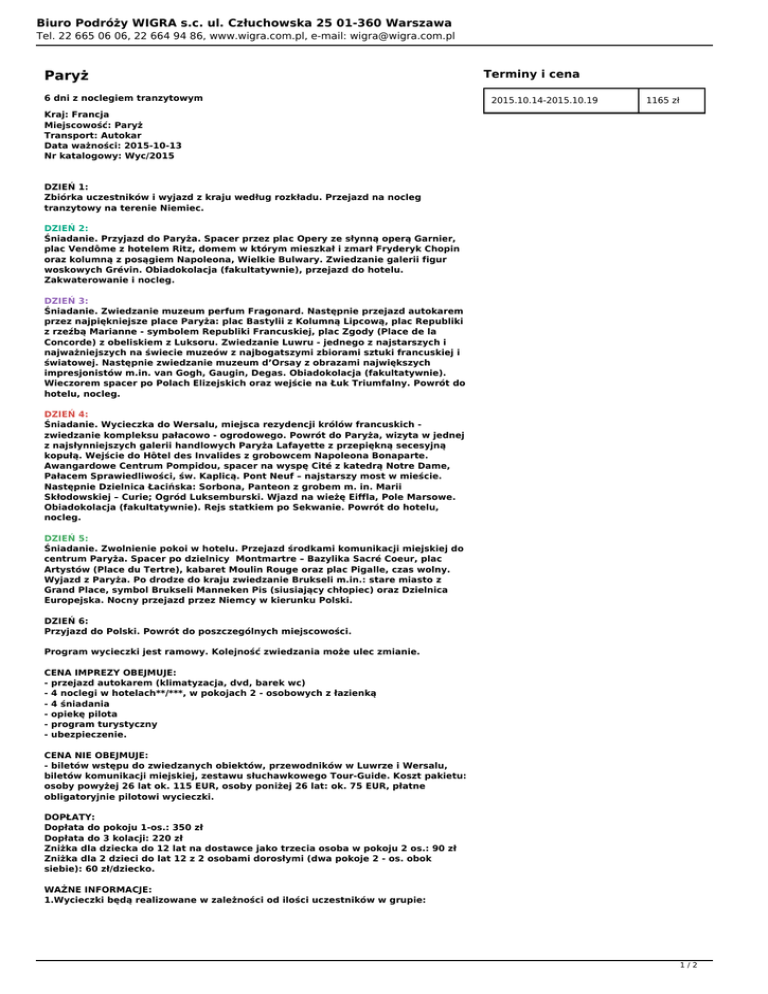 Biuro Podróży WIGRA s.c. ul. Człuchowska 25 01-360 Warszawa Tel. 22 665 06 06, 22 664 94 86, www.wigra.com.pl, e-mail: [email protected] Paryż 6 dni z noclegiem tranzytowym Terminy i cena 2015.10.14-2015.10.19 1165 zł Kraj: Francja Miejscowość: Paryż Transport: Autokar Data ważności: 2015-10-13 Nr katalogowy: Wyc/2015 DZIEŃ 1: Zbiórka uczestników i wyjazd z kraju według rozkładu. Przejazd na nocleg tranzytowy na terenie Niemiec. DZIEŃ 2: Śniadanie. Przyjazd do Paryża. Spacer przez plac Opery ze słynną operą Garnier, plac Vendôme z hotelem Ritz, domem w którym mieszkał i zmarł Fryderyk Chopin oraz kolumną z posągiem Napoleona, Wielkie Bulwary. Zwiedzanie galerii figur woskowych Grévin. Obiadokolacja (fakultatywnie), przejazd do hotelu. Zakwaterowanie i nocleg. DZIEŃ 3: Śniadanie. Zwiedzanie muzeum perfum Fragonard. Następnie przejazd autokarem przez najpiękniejsze place Paryża: plac Bastylii z Kolumną Lipcową, plac Republiki z rzeźbą Marianne - symbolem Republiki Francuskiej, plac Zgody (Place de la Concorde) z obeliskiem z Luksoru. Zwiedzanie Luwru - jednego z najstarszych i najważniejszych na świecie muzeów z najbogatszymi zbiorami sztuki francuskiej i światowej. Następnie zwiedzanie muzeum d’Orsay z obrazami największych impresjonistów m.in. van Gogh, Gaugin, Degas. Obiadokolacja (fakultatywnie). Wieczorem spacer po Polach Elizejskich oraz wejście na Łuk Triumfalny. Powrót do hotelu, nocleg. DZIEŃ 4: Śniadanie. Wycieczka do Wersalu, miejsca rezydencji królów francuskich zwiedzanie kompleksu pałacowo - ogrodowego. Powrót do Paryża, wizyta w jednej z najsłynniejszych galerii handlowych Paryża Lafayette z przepiękną secesyjną kopułą. Wejście do Hôtel des Invalides z grobowcem Napoleona Bonaparte. Awangardowe Centrum Pompidou, spacer na wyspę Cité z katedrą Notre Dame, Pałacem Sprawiedliwości, św. Kaplicą. Pont Neuf – najstarszy most w mieście. Następnie Dzielnica Łacińska: Sorbona, Panteon z grobem m. in. Marii Skłodowskiej – Curie; Ogród Luksemburski. Wjazd na wieżę Eiffla, Pole Marsowe. Obiadokolacja (fakultatywnie). Rejs statkiem po Sekwanie. Powrót do hotelu, nocleg. DZIEŃ 5: Śniadanie. Zwolnienie pokoi w hotelu. Przejazd środkami komunikacji miejskiej do centrum Paryża. Spacer po dzielnicy Montmartre – Bazylika Sacré Coeur, plac Artystów (Place du Tertre), kabaret Moulin Rouge oraz plac Pigalle, czas wolny. Wyjazd z Paryża. Po drodze do kraju zwiedzanie Brukseli m.in.: stare miasto z Grand Place, symbol Brukseli Manneken Pis (siusiający chłopiec) oraz Dzielnica Europejska. Nocny przejazd przez Niemcy w kierunku Polski. DZIEŃ 6: Przyjazd do Polski. Powrót do poszczególnych miejscowości. Program wycieczki jest ramowy. Kolejność zwiedzania może ulec zmianie. CENA IMPREZY OBEJMUJE: - przejazd autokarem (klimatyzacja, dvd, barek wc) - 4 noclegi w hotelach**/***, w pokojach 2 - osobowych z łazienką - 4 śniadania - opiekę pilota - program turystyczny - ubezpieczenie. CENA NIE OBEJMUJE: - biletów wstępu do zwiedzanych obiektów, przewodników w Luwrze i Wersalu, biletów komunikacji miejskiej, zestawu słuchawkowego Tour-Guide. Koszt pakietu: osoby powyżej 26 lat ok. 115 EUR, osoby poniżej 26 lat: ok. 75 EUR, płatne obligatoryjnie pilotowi wycieczki. DOPŁATY: Dopłata do pokoju 1-os.: 350 zł Dopłata do 3 kolacji: 220 zł Zniżka dla dziecka do 12 lat na dostawce jako trzecia osoba w pokoju 2 os.: 90 zł Zniżka dla 2 dzieci do lat 12 z 2 osobami dorosłymi (dwa pokoje 2 - os. obok siebie): 60 zł/dziecko. WAŻNE INFORMACJE: 1.Wycieczki będą realizowane w zależności od ilości uczestników w grupie: 1/2 Biuro Podróży WIGRA s.c. ul. Człuchowska 25 01-360 Warszawa Tel. 22 665 06 06, 22 664 94 86, www.wigra.com.pl, e-mail: [email protected] wygodnymi autokarami lub wygodnymi busami. 2.Niektóre połączenia krajowe mogą być realizowane innymi środkami transportu niż autokar (bus, samochód osobowy, autokar liniowy, Intercity). Trasy antenowe obsługiwane są bez pilota. 3. Wyjazd „antenkowy” za dopłatą z wybranego miasta organizowany przy minimum 6 os. wsiadających. W przypadku braku wymaganego min. 6 osób PBP OLSZTYN ma prawo anulować wyjazd z danej miejscowości. Anulacja wyjazdu nie upoważnia do bezkosztowej rezygnacji z wycieczki. W takim przypadku Klient wybiera wyjazd z innej miejscowości gwarantowanej. 4. Podczas przejazdów krajowych w ramach niektórych wycieczek możliwe są przesiadki. 5. Godziny i miejsca wsiadania mogą ulec zmianie, po wcześniejszym poinformowaniu Klienta. 6.Bilety wstępu do zwiedzanych obiektów oraz ich rezerwacje, usługi lokalnych przewodników, bilety komunikacji miejskiej, opłaty klimatyczne oraz koszty zestawu słuchawkowego Tour-Guide nie są ujęte w cenie imprezy. Informacje o orientacyjnych kosztach podane są przy opisach poszczególnych wycieczek. Koszt pakietu dotyczący realizacji programu jest kalkulowany przy grupie min. 40 osób. Przy mniejszej ilości uczestników koszt pakietu zostanie przeliczony na odpowiednią ilości osób w grupie. 7.Zestawy słuchawkowe Tour-Guide będą zapewnione dla grup powyżej 30 osób. 8.Osoby podróżujące samotnie, które nie chcą dopłacać do pokoju 1–osobowego, będą dokwaterowane do innej osoby tej samej płci w pokoju 2–osobowym. W przypadku braku drugiej osoby na dokwaterowanie Klient będzie musiał zapłacić połowę stawki dopłaty do pokoju 1 – osobowego. 9. Kolejność zapisów na wycieczkę decyduje o zajmowaniu miejsc w autokarze Istnieje możliwość wyjazdu z następujących miast: Białystok, Bielsko-Biała, Budgoszcz, Czestochowa, Gdańsk, Gliwice, Katowice, Kielce, Konin, Koszalin, Koszalin, Kraków, Łódź, Olsztyn, Opole, Poznań, Rzeszów, Słupsk, Szczecin, Tarnów, Toruń, warszawa, Wrocław. 2/2 Powered by TCPDF (www.tcpdf.org)