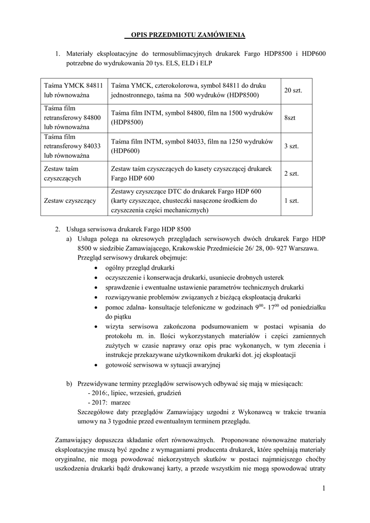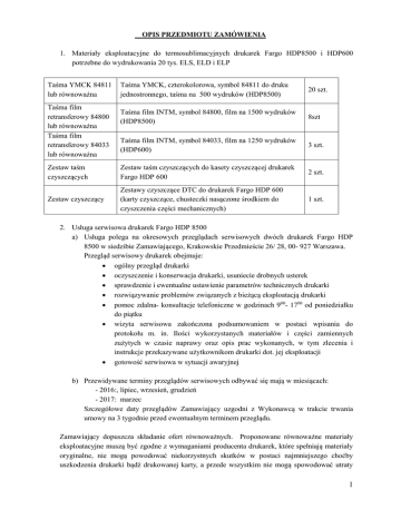 OPIS PRZEDMIOTU ZAMÓWIENIA 1. Materiały eksploatacyjne do termosublimacyjnych drukarek Fargo HDP8500 i HDP600 potrzebne do wydrukowania 20 tys. ELS, ELD i ELP Taśma YMCK 84811 lub równoważna Taśma YMCK, czterokolorowa, symbol 84811 do druku jednostronnego, taśma na 500 wydruków (HDP8500) 20 szt. Taśma film INTM, symbol 84800, film na 1500 wydruków (HDP8500) 8szt Taśma film INTM, symbol 84033, film na 1250 wydruków (HDP600) 3 szt. Zestaw taśm czyszczących Zestaw taśm czyszczących do kasety czyszczącej drukarek Fargo HDP 600 2 szt. Zestaw czyszczący Zestawy czyszczące DTC do drukarek Fargo HDP 600 (karty czyszczące, chusteczki nasączone środkiem do czyszczenia części mechanicznych) 1 szt. Taśma film retransferowy 84800 lub równoważna Taśma film retransferowy 84033 lub równoważna 2. Usługa serwisowa drukarek Fargo HDP 8500 a) Usługa polega na okresowych przeglądach serwisowych dwóch drukarek Fargo HDP 8500 w siedzibie Zamawiającego, Krakowskie Przedmieście 26/ 28, 00- 927 Warszawa. Przegląd serwisowy drukarek obejmuje: ogólny przegląd drukarki oczyszczenie i konserwacja drukarki, usuniecie drobnych usterek sprawdzenie i ewentualne ustawienie parametrów technicznych drukarki rozwiązywanie problemów związanych z bieżącą eksploatacją drukarki pomoc zdalna- konsultacje telefoniczne w godzinach 900- 1700 od poniedziałku do piątku wizyta serwisowa zakończona podsumowaniem w postaci wpisania do protokołu m. in. Ilości wykorzystanych materiałów i części zamiennych zużytych w czasie naprawy oraz opis prac wykonanych, w tym zlecenia i instrukcje przekazywane użytkownikom drukarki dot. jej eksploatacji gotowość serwisowa w sytuacji awaryjnej b) Przewidywane terminy przeglądów serwisowych odbywać się mają w miesiącach: - 2016:, lipiec, wrzesień, grudzień - 2017: marzec Szczegółowe daty przeglądów Zamawiający uzgodni z Wykonawcą w trakcie trwania umowy na 3 tygodnie przed ewentualnym terminem przeglądu. Zamawiający dopuszcza składanie ofert równoważnych. Proponowane równoważne materiały eksploatacyjne muszą być zgodne z wymaganiami producenta drukarek, które spełniają materiały oryginalne, nie mogą powodować niekorzystnych skutków w postaci najmniejszego choćby uszkodzenia drukarki bądź drukowanej karty, a przede wszystkim nie mogą spowodować utraty 1 gwarancji na drukarki. W przypadku zaproponowania materiałów równoważnych Wykonawca wraz z ofertą zobowiązany jest złożyć po 1 sztuce każdego z proponowanych materiałów. Materiały zostaną zainstalowane w posiadanych przez Zamawiającego urządzeniach. Zamawiający dokona sprawdzenia, czy zamontowany materiał poprawnie działa w drukarkach. 2