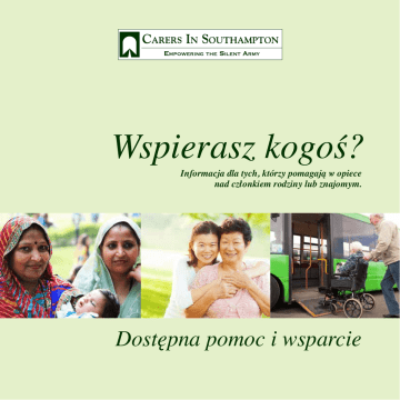 Wspierasz kogoś? Informacja dla tych, którzy pomagają w opiece nad członkiem rodziny lub znajomym. Dostępna pomoc i wsparcie H E L P Zawartość Carers’ Assessments Strona 3 Świadczenia Strona 4 Twoje zdrowie oraz dobre samopoczucie Strona 5 Zatrudnienie Strona 6 Planowanie z wyprzedzeniem Strona 7 Southampton Carers’ Strategy Strona 8 Najważniejsze wskazówki Strona 9 Kontakty Strona 10 H E L P 1 Dla kogo? Health and Wellbeing Employment and Finances Leisure and Learning Planning Carers in Southampton jest serwisem udzielającym informacji, porad i wsparcia dla każdego, kto opiekuje się członkiem rodziny, znajomym, czy sąsiadem, potrzebującym ododatkowego wsparia. Organizacja Carers in Southampton przygotowała tę broszurę, aby poinformować Cię o serwisach, poradach i wsparciu oraz jak uzyskać do nich dostęp. Jeżeli jesteś osobą która: • Regularnie pomaga w utrzymaniu domu w czystości, higieny osobistej lub jesteś wsparciem emocjonalnym • Pomagasz z korespondencją i formalnościami • Aranżujesz lub/i uczestniczysz w spotkaniach Czy udzielasz wsparcia bez wynagrodzenia? Oferujemy darmową usługę informacyjną oraz posiadamy interaktywną stronę internetową: carersinsouthampton.co.uk Można się także z nami kontaktować dzwoniąc pod numer: 023 8058 2387 lub sms: 0777 008 63 02. Centrum dla opiekunów. Organizujemy szkolenia dla opiekunów w różnym zakresie np. Sprawy prawne, finansowe, informatyka, zdrowie i pierwsza pomoc. Organizujemy także zajęcia rekreacyjne. Po więcej informacji odwiedź naszą stronę internetową: .uk carersinsouthampton.co r me nu lub zadzwoń pod 023 8058 2387 sms: 0777 008 63 02 2 H E L P H E L P Carers Assessment Świadczenia Wielu opiekunów ma te same zmartwienia; obejmują one obawy o transport do i ze spotkań, przygotowanie posiłków i dietę, zarządzanie lekami, organizowanie opieki dziennej, dostosowanie domu do nowych potrzeb, sprostanie potrzebom innych członków rodziny i dostęp do odpowiednich zasobów i organizacji charytatywnych. Czasami pojawiają się problemy z własnym zdrowiem i dobrym samopoczuciem, w tym także z sytuacją zatrudnienia. Czy wiesz, do czego możesz się kwalifikować Ty oraz osoba, którą się opiekujesz? Proponujemy sprawdzić swoją sytuację w poniższym linku. Ponieważ system świadczeń jest skomplikowany i może być czasochłonny, warto jest przyjrzeć sie kryteriom kwalifikującym do poszczególnych benefitów. Więcej szczegółowych informacji udostępniamy na naszej stronie internetowej: carersinsouthampton.co.uk oraz na GOV.UK tutaj: http://bit.ly/1hJOim8 Z dniem 1 kwietnia 2015 roku, na mocy ustawy Care Act 2014, masz ustawowe prawo do rozpoznania swoich własnych potrzeb jako opiekun, niezależnie od liczby godzin, jakie spędzasz w tej roli. Władze lokalne są również odpowiedzialne za dostarczanie informacji i porad wszystkim opiekunom, niezależnie od ich potrzeb. Self-assessment (własne rozpoznanie) będzię można niedługo wykonać na tzw. SID (Southampton Information Directory), odwiedzając stronę: http://bit.ly/1WW8FQs Carers Allowance To jest główny benefit, który jest dostępny dla opiekunów. Możesz się kwalifikować, jeżeli udzielasz wsparcia/opiekujesz się kimś przez więcej niż 35 godzin w tygodniu. Sprawdź GOV.UK po więcej informacji tutaj: http://bit.ly/1qFdLCV Carers Assessment będzie rozpoznawać, jak bycie opiekunem wpływa na Twoje zdrowie, dobre samopoczucie i co może je poprawić. Możesz kwalifikować się także do dodatkowego wsparcia ze strony władz lokalnych. Jest to okazja, aby: • Porozmawiać i wypowiedzieć się na temat własnych potrzeb • Podzielić się swoimi doświadczeniami, związanymi z opieką • Rozpoznać swoją rolę jako opiekuna • Zidentyfikować i omówić wszelkie problemy • Znaleźć rozwiązania, które pomogą Ci kontynuować opiekę, dbając także o swoje samopoczucie • otrzymać informacje i porady 3 Planning Disability Living Allowance (DLA) DLA jest benefitem, który pomaga w pokryciu dodatkowych kosztów długotrwałej choroby lub niepełnosprawności, które mogą być albo fizyczne i / lub psychiczne. Należy pamiętać, że nowy wniosek o DLA można zrobić tylko na dziecko poniżej 16 lat. W szczególnych okolicznościach mogą także aplikować osoby powyżej 65 roku życia. Zobacz GOV.UK aby uzyskać więcej informacji tutaj: http://bit.ly/1Gm22CU Personal Independence Payment (PIP) PIP jest nowy świadczeniem, wypłacanym osobom, które mają potrzeby życia codziennego i / lub w zakresie mobilności, aby wspomóc z dodatkowymi kosztami, związanymi z długotrwałą chorobą lub niepełnosprawnością. Zobacz GOV.UK aby uzyskać więcej informacji: http://bit.ly/1lEfIxQ Po więcej informacji odwiedź naszą stronę internetową: .uk carersinsouthampton.co r me nu lub zadzwoń pod 023 8058 2387 sms: 0777 008 63 02 Attendance Allowance Jest to świadczenie wypłacane osobom, które są w wieku 65+ i potrzebują opieki. Attendance Allowance ma pomóc przy dodatkowych kosztach, związanych z długotrwałą chorobą lub niepełnosprawnością. Zobacz GOV.UK aby uzyskać więcej informacji tutaj: http://bit.ly/M6s2H7 Po więcej informacji odwiedź naszą stronę Zmiany w systemie świadczeń; Nadszedł czas, aby je sprawdzić! internetową: .uk Niedawno odnotowano zmiany na dużą sklalę w systemie świadczeń. carersinsouthampton.co r me nu Ważne jest, aby być na bieżąco i sprawdzić, czy otrzymujesz świadczenia, lub zadzwoń pod 023 8058 2387 do których jesteś uprawniony. Można to sprawdzić pod tym adresem: sms: 0777 008 63 02 entitledto.co.uk, http://bit.ly/1jqsnoE 4 H E L P H E L P Health and Wellbeing Employment and Finances Twoje zdrowie oraz dobre samopoczucie Zatrudnienie Przy ograniczonym czasie, szczególnie w roli opiekuna, łatwo jest zignorować własne potrzeby. Ważne jest zatem, aby odlaneźć balans dla siebie, oraz osoby, którą się opiekujesz.