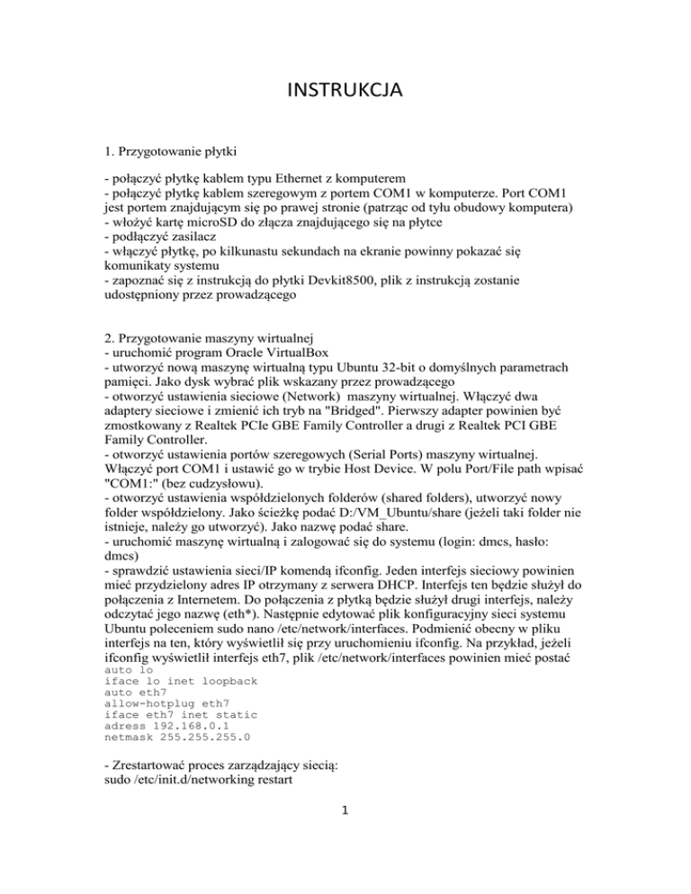INSTRUKCJA 1. Przygotowanie płytki - połączyć płytkę kablem typu Ethernet z komputerem - połączyć płytkę kablem szeregowym z portem COM1 w komputerze. Port COM1 jest portem znajdującym się po prawej stronie (patrząc od tyłu obudowy komputera) - włożyć kartę microSD do złącza znajdującego się na płytce - podłączyć zasilacz - włączyć płytkę, po kilkunastu sekundach na ekranie powinny pokazać się komunikaty systemu - zapoznać się z instrukcją do płytki Devkit8500, plik z instrukcją zostanie udostępniony przez prowadzącego 2. Przygotowanie maszyny wirtualnej - uruchomić program Oracle VirtualBox - utworzyć nową maszynę wirtualną typu Ubuntu 32-bit o domyślnych parametrach pamięci. Jako dysk wybrać plik wskazany przez prowadzącego - otworzyć ustawienia sieciowe (Network) maszyny wirtualnej. Włączyć dwa adaptery sieciowe i zmienić ich tryb na "Bridged". Pierwszy adapter powinien być zmostkowany z Realtek PCIe GBE Family Controller a drugi z Realtek PCI GBE Family Controller. - otworzyć ustawienia portów szeregowych (Serial Ports) maszyny wirtualnej. Włączyć port COM1 i ustawić go w trybie Host Device. W polu Port/File path wpisać "COM1:" (bez cudzysłowu). - otworzyć ustawienia współdzielonych folderów (shared folders), utworzyć nowy folder współdzielony. Jako ścieżkę podać D:/VM_Ubuntu/share (jeżeli taki folder nie istnieje, należy go utworzyć). Jako nazwę podać share. - uruchomić maszynę wirtualną i zalogować się do systemu (login: dmcs, hasło: dmcs) - sprawdzić ustawienia sieci/IP komendą ifconfig. Jeden interfejs sieciowy powinien mieć przydzielony adres IP otrzymany z serwera DHCP. Interfejs ten będzie służył do połączenia z Internetem. Do połączenia z płytką będzie służył drugi interfejs, należy odczytać jego nazwę (eth*). Następnie edytować plik konfiguracyjny sieci systemu Ubuntu poleceniem sudo nano /etc/network/interfaces. Podmienić obecny w pliku interfejs na ten, który wyświetlił się przy uruchomieniu ifconfig. Na przykład, jeżeli ifconfig wyświetlił interfejs eth7, plik /etc/network/interfaces powinien mieć postać auto lo iface lo inet loopback auto eth7 allow-hotplug eth7 iface eth7 inet static adress 192.168.0.1 netmask 255.255.255.0 - Zrestartować proces zarządzający siecią: sudo /etc/init.d/networking restart 1 - Sprawdzić poleceniem ifconfig czy na interfejsie jest poprawny adres IP (192.168.0.2) - użyć polecenia ping 192.168.0.2 do sprawdzenia poprawności połączenia maszyny wirtualnej z płytką - połączyć się z płytką za pomocą ssh, z użyciem polecenia ssh devkit (devkit jest aliasem na [email protected]) - w przypadku zapytania o hasło wcisnąć enter - do transferu plików między systemem Windows i maszyną wirtualną można wykorzystać folder współdzielony. W tym celu należy stworzyć folder o nazwie share w katalogu domowym (komenda cd && mkdir share) a następnie zamontować folder współdzielony (sudo mount -t vboxsf share ~/share/). Przetestować działanie folderu współdzielonego. 3. Sprawdzenie działania konsoli - do odczytu danych z portu szeregowego na maszynie wirtualnej służy program minicom. - zapoznać się z opcjami programu za pomocą polecenia minicom -h - uruchomić odczyt z portu COM1 z(w Ubuntu widziany jako /dev/ttyS0) z prędkością 115200 bodów używając komendy sudo minicom -D /dev/ttyS0 -b 115200 - wcisnąć przycisk reset na płytce, w oknie programu minicom powinny pojawić się komunikaty uruchamiających się bootloadera i kernela 4. Analiza procesu uruchamiania systemu na płytce - .......... - przeanalizować zawartość pierwszej partycji (FAT) karty SD - proces bootowania jest przedstawiony na rys xxx. - przeanalizować zawartość pliku boot.scr - włożyć kartę do płytki i uruchomić odczyt z konsoli programem minicom. Uruchomić płytkę i przerwać bootowanie w momencie wyświetlenia komunikatu "Press any key to stop autoboot", co spowoduje wejście w konsolę bootloadera uboot. Zapoznać się z komendami bootloadera poleceniem help. Wyświelić aktualne ustawienia bootloadera poleceniem printenv. Przenanalizować proces bootowania systemu (na podstawie zmiennej środowiskowej bootcmd). Porównać zawartość konfiguracji u-boota ze skryptem u-boota podanym przez prowadzącego. Przeanalizować znaczenie parametrów takich jak console, root, bootargs itp. oraz komend fatload, bootm, itp. 5. Kompilacja bootloaderów oraz jądra systemu linux. - przenieść zawartość partycji FAT karty SD do katalogu domowego (kasując zawartość partycji FAT na karcie) - zgodnie z instrukcją do płytki Devkit8500 skompilować kolejno bootloader xloader, bootloader u-boot oraz jądro systemu linux. W przypadku wystąpienia komunkatów o błędzie (no rule to make target) przeanalizowac pliki makefile i odpowiednio zmodyfikować komendę kompilacji. Wgrać pliki wynikowe na kartę. Plik skryptu u-boota zostanie podany przez prowadzącego, należy zamienić go programem mkimage (zgodnie z instrukcją do 2 płytki Devkit8500) na plik binarny i również umieścić na karcie SD. Uwaga: tool mkimage nie działa poprawnie wewnątrz folderu współdzielonego, przy generowaniu plik skryptu u-boota należy skorzystać z innego folderu.Sprawdzić czy płytka z nową zawartością karty uruchamia się poprawnie. Zgodnie z instrukcją do płytki Devkit8500 wgrać pliki startowe do pamięci NAND. Przetestować, czy płytka uruchamia się poprawnie z pamięci NAND. 6. Znaleźć w internecie informacje na temat bootowania systemu plików po sieci (z wykorzystaniem protokołu NFS) - słowa kluczowe: NFS, u-boot, script. Zmodyfikować skrypt w ten sposób, żeby system plików był ładowany z maszyny wirtualnej, przy czym system plików znajduje się w katalogu /home/dmcs/targetfs. Sprawdzić, czy płytka zbootuje się poprawnie z nowymi ustawieniami. Wejść do katalogu /home/dmcs/targetfs/home/root na maszynie wirt